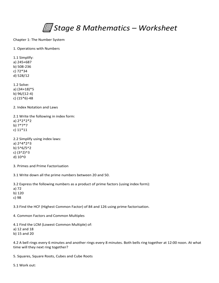 📘 Stage 8 Mathematics – Worksheet Chapter 1: The Number System 1. Operations with Numbers 1.1 Simplify: a) 245+687 b) 508-236 c) 72*34 d) 528/12 1.2 Solve: a) (34+18)*5 b) 96/(12-4) c) (15*6)-48 2. Index Notation and Laws 2.1 Write the following in index form: a) 2*2*2*2 b) 7*7*7 c) 11*11 2.2 Simplify using index laws: a) 2^4*2^3 b) 5^6/5^2 c) (3^2)^3 d) 10^0 3. Primes and Prime Factorisation 3.1 Write down all the prime numbers between 20 and 50. 3.2 Express the following numbers as a product of prime factors (using index form): a) 72 b) 120 c) 98 3.3 Find the HCF (Highest Common Factor) of 84 and 126 using prime factorisation. 4. Common Factors and Common Multiples 4.1 Find the LCM (Lowest Common Multiple) of: a) 12 and 18 b) 15 and 20 4.2 A bell rings every 6 minutes and another rings every 8 minutes. Both bells ring together at 12:00 noon. At what time will they next ring together? 5. Squares, Square Roots, Cubes and Cube Roots 5.1 Work out: a) 12^2 b) 15^2 c) 9^3 d) 5^3 5.2 Find: a) √144 b) √225 c) 3√125 d) 3√512 5.3 Word problem: A square garden has an area of 784 m². Find the length of one side of the garden. 6. Mixed Revision Questions 6.1 Simplify: (2^5/2^3)+(9^2-45) 6.2 Write 360 as a product of prime factors. 6.3 Find the LCM and HCF of 45 and 60. 6.4 A cube has a volume of 729 cm³. Find the length of one edge. Challenge Question: The product of two numbers is 144. One of them is 12. Using prime factorisation, find the other number and check if it is prime or composite.