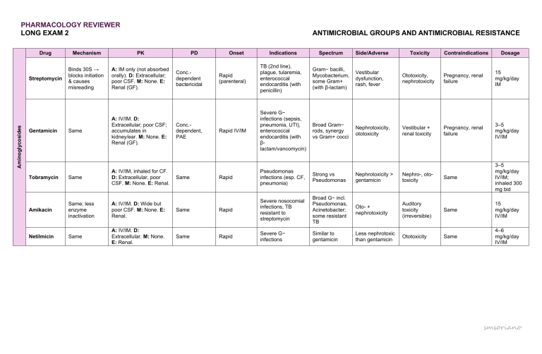 Aminoglycosides PHARMACOLOGY REVIEWER LONG EXAM 2 ANTIMICROBIAL GROUPS AND ANTIMICROBIAL RESISTANCE Drug Mechanism PK Streptomycin Binds 30S → blocks initiation & causes misreading A: IM only (not absorbed orally). D: Extracellular; poor CSF. M: None. E: Renal (GF). Same A: IV/IM. D: Extracellular; poor CSF; accumulates in kidney/ear. M: None. E: Renal (GF). Tobramycin Same A: IV/IM, inhaled for CF. D: Extracellular, poor CSF. M: None. E: Renal. Amikacin Same; less enzyme inactivation A: IV/IM. D: Wide but poor CSF. M: None. E: Renal. Netilmicin Same A: IV/IM. D: Extracellular. M: None. E: Renal. Gentamicin PD Indications Spectrum Side/Adverse Toxicity Contraindications Dosage Rapid (parenteral) TB (2nd line), plague, tularemia, enterococcal endocarditis (with penicillin) Gram− bacilli, Mycobacterium, some Gram+ (with β-lactam) Vestibular dysfunction, rash, fever Ototoxicity, nephrotoxicity Pregnancy, renal failure 15 mg/kg/day IM Rapid IV/IM Severe G− infections (sepsis, pneumonia, UTI), enterococcal endocarditis (with βlactam/vancomycin) Broad Gram− rods, synergy vs Gram+ cocci Nephrotoxicity, ototoxicity Vestibular + renal toxicity Pregnancy, renal failure 3–5 mg/kg/day IV/IM Rapid Pseudomonas infections (esp. CF, pneumonia) Strong vs Pseudomonas Nephrotoxicity > gentamicin Nephro-, ototoxicity Same 3–5 mg/kg/day IV/IM; inhaled 300 mg bid Same Rapid Severe nosocomial infections, TB resistant to streptomycin Broad G− incl. Pseudomonas, Acinetobacter; some resistant TB Oto- + nephrotoxicity Auditory toxicity (irreversible) Same 15 mg/kg/day IV/IM Same Rapid Severe G− infections Similar to gentamicin Less nephrotoxic than gentamicin Ototoxicity Same 4–6 mg/kg/day IV/IM Conc.dependent bactericidal Conc.dependent, PAE Same Onset smsoriano PHARMACOLOGY REVIEWER LONG EXAM 2 Drug Mechanism PK Same (too toxic for systemic use) A: Oral (not absorbed), topical. D: GI lumen (oral use). M: None. E: Feces. Local bactericidal Kanamycin Same A: IM, oral (not absorbed). D: Extracellular. M: None. E: Renal. Paromomycin Same Plazomicin Newer aminoglycoside Aminoglycosides Neomycin Spectinomycin ANTIMICROBIAL GROUPS AND ANTIMICROBIAL RESISTANCE Drug Spectinomycin Mechanism Binds 30S, inhibits translocation (similar to aminoglycosides but no misreading) Indications Spectrum Side/Adverse Toxicity Local Topical skin, oral for bowel sterilization, hepatic encephalopathy Gram− > Gram+, limited systemic GI upset, contact dermatitis Severe oto- & nephrotoxicity if systemic Systemic use Oral 1 g q6h (short course); topical Same Rapid TB (rarely used), bowel sterilization Broad G−, some mycobacteria High oto/nephrotoxicity Severe toxicity Same 15 mg/kg/day IM A: Oral (not absorbed). D: Stays in gut. M: None. E: Feces. Local Local Intestinal amebiasis, cryptosporidiosis Luminal parasites, some G− GI upset Rare systemic None Oral 25–35 mg/kg/day A: IV only. D: Extracellular. M: None. E: Renal. Same Rapid MDR Enterobacteriaceae MDR Gram− rods incl. CRE Similar to aminoglycosides Nephro/ototoxicity Renal impairment 15 mg/kg/day IV Toxicity Contraindications Dosage PK A: IM injection. D: Extracellular, not CNS. M: Minimal. E: Renal. PD PD Bacteriostatic Onset Onset Rapid IM Indications Gonorrhea (penicillin- or ciprofloxacinresistant strains) Spectrum N. gonorrhoeae only Side/Adverse Pain at injection site, fever, nausea Rare nephrotoxicity Contraindications Pregnancy (relative) Dosage 2 g IM single dose smsoriano PHARMACOLOGY REVIEWER LONG EXAM 2 Spectrum Common side/adverse Notable toxicity Contraindications Used only as fixed-dose combo with trimethoprim; see TMP-SMX below. Broad activity vs many gram-positive and gram-negative bacteria; some Nocardia, Chlamydia, several protozoa; Rickettsiae not susceptible; Pseudomonas intrinsically resistant. Rash, fever, photosensitivity; GU “crystalluria/urinary disturbances” (class). Kernicterus risk (class); see class AEs. Avoid when sulfonamide is contraindicated; (chapter emphasizes neonatal/pregnancy risk at class level). Bacteriostatic With pyrimethamine for toxoplasmosis As above As above As above As above Bacteriostatic With pyrimethamine for malaria (historical/where used); resistance & severe reactions limit use As above Severe cutaneous reactions cited historically; see text. Severe skin reactions (noted); Use restricted; see text. Same (acts in gut; prodrug split in colon) A: poorly absorbed (designed for local action). D: local in bowel. M/E: metabolized to sulfapyridine + 5-ASA in colon; systemic exposure less emphasized. Local effect Inflammatory bowel disease Local GI pathogens/inflammation context (not used as systemic antibacterial). GI intolerance possible (class). — — Sodium sulfacetamide (topical/ophthalmic) Same A: topical ocular. D: local. M/E: not emphasized. Local Bacterial conjunctivitis (2nd-line) Ocular surface bacteria Local irritation possible — — Silver sulfadiazine (topical) Same; silver adds broad topical activity A/D: topical local. M/E: not emphasized. Local Burns (prevention/treatment of infection) Broad topical coverage Local reactions — — Mafenide acetate (topical) Same; also inhibits carbonic anhydrase A/D: topical; systemic absorption can occur. Broad topical Pain on application; metabolic acidosis (due to CA inhibition) Metabolic acidosis risk — Drug MOA PK Sulfamethoxazole (oral absorbable; used mainly in combo) PABA analog; competitively inhibits dihydropteroate synthase → blocks folate synthesis A: well absorbed from small intestine. D: widely distributed incl. CSF; variable protein binding. M: hepatic acetylation/glucuronidation. E: urinary excretion; t½ ↑ in renal failure. Bacteriostatic alone Sulfadiazine (oral absorbable) Same as above As above for oral absorbable sulfonamides. Same Long half-life (class note longacting); otherwise as above. Sulfasalazine (oral non-absorbable) Sulfadoxine (oral absorbable; longacting) Sulfonamides ANTIMICROBIAL GROUPS AND ANTIMICROBIAL RESISTAN