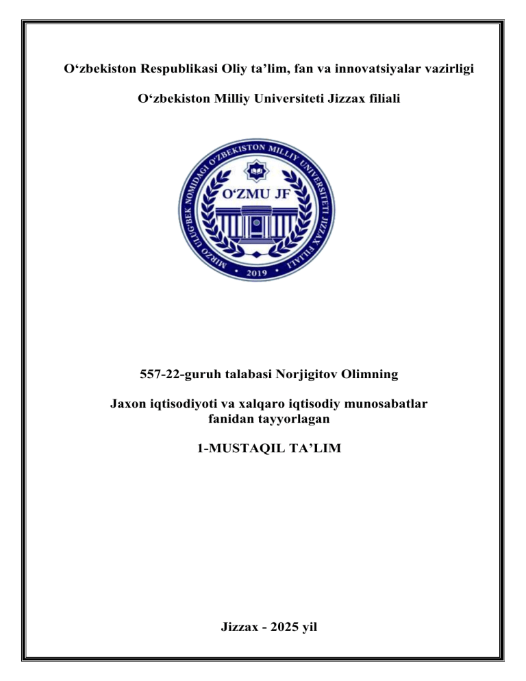 O‘zbekiston Respublikasi Oliy taʼlim, fan va innovatsiyalar vazirligi O‘zbekiston Milliy Universiteti Jizzax filiali 557-22-guruh talabasi Norjigitov Olimning Jaxon iqtisodiyoti va xalqaro iqtisodiy munosabatlar fanidan tayyorlagan 1-MUSTAQIL TA’LIM Jizzax - 2025 yil MAVZU: Yaponiya iqtisodiyotining afzalliklari va kamchiliklari. REJA: 1. Yaponiya Iqtisodiyotining Asosiy Xususiyatlari 2. Yaponiya Iqtisodiyotining Afzalliklari 3. Yaponiya Iqtisodiyotining Kamchiliklari 4. Yaponiya Iqtisodiyotining Rivojlanish Strategiyalari Yaponiya, iqtisodiy jihatdan dunyoning eng yirik va rivojlangan mamlakatlaridan biri bo‘lib, uning iqtisodiyoti global miqyosda muhim o‘rin tutadi. Yaponiya iqtisodiyoti, yuqori texnologik taraqqiyot va innovatsiyalar, ishlab chiqarish samaradorligi, eksportga yo‘naltirilgan strategiya bilan ajralib turadi. Shu bilan birga, bu iqtisodiy modelning ba'zi kamchiliklari ham mavjud. Mazkur ishda Yaponiya iqtisodiyotining asosiy afzalliklari va kamchiliklari haqida so‘z yuritiladi va uning kelajakdagi rivojlanish istiqbollari tahlil qilinadi. Yaponiya Iqtisodiyotining Asosiy Xususiyatlari Yaponiya Iqtisodiyotining Strukturasiga Umumiy Qarash Yaponiya iqtisodiyoti 3 ta asosiy sektordan iborat: Sanoat sektori: Yaponiya sanoati, eng avvalo avtomobilsozlik, elektronika, robototexnika, yuqori texnologiyali mahsulotlar ishlab chiqarish bilan mashhur. Yaponiya dunyodagi eng yirik avtomobil ishlab chiqaruvchilardan biri hisoblanadi. Xizmatlar sektori: Yaponiya xizmatlar sohasi global miqyosda juda rivojlangan. Bank xizmatlari, moliya, axborot texnologiyalari va turizm sektorlari jadal o‘sish sur'atlarini ko‘rsatmoqda. Qishloq xo‘jaligi sektori: Qishloq xo‘jaligi Yaponiya iqtisodiyotida kichik o‘rin tutadi, ammo mamlakatda yuqori sifatli oziq-ovqat mahsulotlarini ishlab chiqarish juda muhim. Tarmoq va Sanoatlarning Rivojlanishi Yaponiya sanoati yuqori texnologiyalarni ishlab chiqarish va ilg‘or ishlab chiqarish texnologiyalarini qo‘llash bilan mashhur. Bu, o‘z navbatida, ishlab chiqarish samaradorligini oshirishga yordam beradi. Yaponiya avtomobil sanoati va elektronika sohasida yetakchi o‘rinlarga ega. Iqtisodiy O‘sish va Barqarorlik Yaponiya iqtisodiyoti ko‘p yillar davomida barqaror o‘sish sur'atlarini ko‘rsatdi. Biroq, so‘nggi yillarda iqtisodiy o‘sish sur'ati sekinlashdi. Bu, demografik o‘zgarishlar va ishlab chiqarishdagi yuqori samaradorlikdan kelib chiqadi. Yaponiya Iqtisodiyotining Afzalliklari Yaponiyaning Ilg‘or Texnologiyalari va Innovatsiyalari Yaponiya ilg‘or texnologiyalarga va innovatsion yechimlarga katta e'tibor beradi. Elektronika va robototexnika kabi sohalarda Yaponiya dunyoning yetakchi davlatlaridan biridir. Yaponiyaning Sony, Toyota, Panasonic, Honda kabi kompaniyalari butun dunyoda tanilgan. Ishlab Chiqarish va Sanoatning Yuqori Samaradorligi Yaponiya sanoatining yuqori samaradorligi ishlab chiqarish jarayonlarida zamonaviy texnologiyalar va innovatsiyalarni qo‘llashga asoslanadi. Ushbu samaradorlik Yaponiya iqtisodiyotining kuchli tomonlaridan biridir. Yaponlar o‘z ishlab chiqarishlarini yuqori sifatda, kam xarajat bilan amalga oshirishga erishadilar. Qishloq Xo‘jaligi va Oziq-ovqat Xavfsizligi Yaponiya qishloq xo‘jaligi sektorida yuqori sifatli va ekologik toza oziq-ovqat mahsulotlarini ishlab chiqaradi. Yaponiyada qishloq xo‘jaligi texnologiyalari juda rivojlangan, bu esa oziq-ovqat xavfsizligini ta'minlashga yordam beradi. Eksport va Global Savdoda Muvaffaqiyat Yaponiya o‘zining eksportiga katta e'tibor qaratadi. Mamlakatning eksport mahsulotlari, asosan, avtomobillar, elektronika va yuqori texnologiyali mahsulotlardan iborat. Yaponiya ko‘plab davlatlar bilan o‘zaro savdo aloqalarini rivojlantirib, global iqtisodiyotda o‘z o‘rnini mustahkamladi. Ta'lim va Kadrlar Tayyorlash Tizimi Yaponiyada ta'lim tizimi juda yuqori darajada tashkil etilgan. Kadrlar tayyorlashga alohida e'tibor beriladi va bu mamlakatning iqtisodiy rivojlanishida muhim ahamiyatga ega. Mamlakatda ilm-fan, texnika va innovatsiyalarni rivojlantirish uchun keng imkoniyatlar yaratilgan. Mehnat Bozoridagi Barqarorlik Yaponiya mehnat bozorida barqarorlikni ta'minlashga muvaffaq bo‘lgan. Mamlakatda ishlash uchun yuqori malakali ishchilar talab etiladi va ish o‘rinlari qisqa vaqt ichida to‘ldiriladi. Ishsizlik darajasi past bo‘lib, bu iqtisodiy barqarorlikka xizmat qiladi. Yaponiya Iqtisodiyotining Kamchiliklari Demografik Muammolar: Aholi Kamayishi va Qarish Yaponiya aholisining qarishi va kamayishi iqtisodiy o‘sishga salbiy ta'sir ko‘rsatadi. Aholining ko‘plab qismlarini qarigan va yoshga yetgan avlodlar tashkil etadi, bu esa ishchi kuchining yetishmovchiligiga olib keladi. Energiya Resurslari va Tabiiy Resurslar Yetishmovchiligi Yaponiya tabiiy resurslar bilan cheklangan mamlakat hisoblanadi. Energiya manbalarining kamligi, asosan, neft va tabiiy gazga bog‘liq bo‘lishi mamlakatni energetik xavfsizlikni ta'minlashda qiyinchiliklarga duchor qiladi. Davlat Qarzi va Fiskal Siyosat Yaponiya davlat qarzi dunyodagi eng yuqori darajalardan biridir. Bu iqtisodiy siyosatga va fiskal barqarorlikka tahdid soladi. Davlat qarzi miqdorini kamaytirish uchun keng qamrovli islohotlar zarur. Yoshlar O‘rtasidagi Ish O‘rinlari Tanqisligi Yoshlar o‘rtasidagi ish o‘rinlari tanqisligi, yuqori raqobat va ta'lim tizimining o‘zgarishlarga mos kelmasligi yoshlarning iqtisodiy faolligini pasaytiradi. Iqtisodiy Tengsizlik va Kam Ta'minlangan Aholi Qatlamlari Iqtisodiy tengsizlik va kam ta'minlangan aholi qatlamlarining mavjudligi ham Yaponiya iqtisodiyotining muammolaridan biridir. Bu jamiyatda ijtimoiy tafovutlarni kuchaytiradi va iqtisodiy barqarorlikka tahdid soladi. Yaponiya Iqtisodiyotining Rivojlanish Strategiyalari Texnologik Yangilanish va Innovatsiyalar Yaponiya yangi texnologiyalarni ishlab chiqish va ulardan foydalanish orqali iqtisodiy rivojlanishni davom ettiradi. Texnologiyalarni innovatsion rivojlantirishga alo