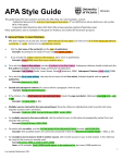 APA Style Guide This guide shows the most common scenarios for APA citing. For more examples, consult: Publication Manual of the American Psychological Association, 6th ed. (McPherson Library Reference, call number BF76.7 P83 2010) Frequently Asked Questions About APA Style (http://www.apastyle.org/learn/faqs/index.aspx) Many publications used as examples in this guide are fictitious and created for illustration purposes. General Rules: In-text Citations APA style requires you to cite your sources within the text of your paper. Cite the source of all material you paraphrase, summarize, or quote. Elements are separated by commas. Cite the last name of the author(s) and the year of publication. Example: According to one study of music students (Jones, 2000) … If you include the author’s name in the sentence, don’t cite it in parentheses. Example: Wong (2000) found that music students who … For a work by three to five authors, include all authors in the first citation. Subsequent citations should include only the first author’s surname, followed by et al. and the year of publication. Example: First Citation (Smith, Jones, Brown, Stuart, & Anderson, 2006) Subsequent Citations (Smith et al., 2006) For a work by six or more authors, cite only the last name of the first author, followed by et al. and the year of publication. Example: (Smith et al., 2001) Second and subsequent citations of a source within a paragraph: omit the year. Example: Wong also demonstrates… If the citation is for a direct quote or a paraphrased idea, include the page number(s). Abbreviate page as p. and pages as pp. Example: (Turnbull, 2000, p. 84) Multiple sources cited within the same parentheses: Place the citations in alphabetical order by author last name. Separate citations with a semicolon. Example: (Anderson, 2005; Everson & Brown, 2002; Suzuki, 2004) For multiple sources by the same author(s), cite the author(s) once. List the dates chronologically, earliest first, and separate with commas. Example: (Jones & Brown, 2003, 2004) For works with no author, use the first few words of the reference list entry (usually, part of the title). Example: Web Usability Studies are commonly conducted in libraries ("Benefits of Usability Studies," 2002, p. 34). For secondary sources (source cited in another source), refer to both sources in your in-text citation. In the reference list, only list the source you actually used. Example: (Jones, 1998, as cited in Smith, 2006) Note: In this example, Smith (2006) would appear in the reference list, but Jones (1998) would not. 1 Last updated September 2013 APA Style Guide For material on a Web page without page numbers: cite the section heading and the paragraph number (count down from the heading). Example: (Anderson, 2006, Introduction section, para. 2) For works with a group as the author e.g. (e.g. corporations, associations, government agencies / departments / ministries) are usually spelled out each time they appear in a text citation unless the name is long and cumbersome and the abbreviation is familiar or readily understandable. If the name is short or the abbreviation not readily understandable, write out the name each time it occurs. Example: no abbreviation Public Health Agency of Canada (2005) Example: with abbreviation Canada, Department of Foreign Affairs and International Trade (DFAIT, 2003) Legal sources, such as court cases, statutes, and legislation are treated as works with no author (see above). In-text citations should include the first few words of the reference followed by the year of publication. Bills and statutes should be cited with the official or popular title of the legislation, and the year it was passed. Examples: Bill C-26 (2005) had numerous effects on… Freedom of association is considered fundamental in Canadian law (Canadian Charter of Rights and Freedoms, 1982). Case law titles are italicized for in-text citations. Example: (R. v. Latimer, 2001) Personal communications, such as lectures, personal e-mail messages, or private interviews that you conducted with another person should be referred to in your in-text citations but NOT in your reference list. Personal communications can include information taken from course management tools such as Blackboard or Moodle. Provide the surname and initials of the person with whom you were communicating, and an exact date if possible. Example: J. Reiss indicated that “anthropologists are still debating the reasons for the Neanderthals’ disappearance” (personal communication, May 3, 2000). General Rules: Reference List The reference list appears at the end of your paper and helps readers locate your sources. It includes all works cited in your paper. Format Begin the reference list on a new page and give it the heading References. Centre the heading. Double-space the entire reference list. For each reference, indent all lines other than the first line, one-half inch from the left margin. List Order Alphabetize the list by authors’ last names. If a reference has no author, use the first word of the title. If several references have the same author(s), list them in the order they were published, earliest first. 2 Last updated September 2013 APA Style Guide Authors and Editors Place last name first and use initials for first and middle names. Two to six authors: separate names with commas; place & before the final name. Eight or more authors: name the first six authors, then insert three ellipsis points (…) followed by the final author’s name. Editor: add (Ed.) after the name. Multiple editors: add (Eds.) after the last-listed editor. Work by a group author: alphabetize in the reference list by the first significant word in the name. No known author or editor: begin the reference with the title, followed by the date. Group Authors (including government) Alphabetize group authors (government agencies, departments, ministries) by the first significant word of the name. Spell out the full na