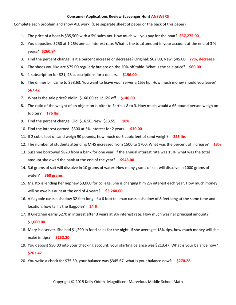 Consumer Applications Review Scavenger Hunt ANSWERS Complete each problem and show ALL work. (Use separate sheet of paper or the back of this paper) 1. The price of a boat is $35,500 with a 5% sales tax. How much will you pay for the boat? $37,275.00 2. You deposited $250 at 1.25% annual interest rate. What is the total amount in your account at the end of 3 ½ years? $260.94 3. Find the percent change. Is it a percent increase or decrease? Original: $62.00, New: $45.00 27%, decrease 4. The shoes you like are $75.00 regularly but are on the 20% off table. What is the sale price? $60.00 5. 1 subscription for $21, 28 subscriptions for x dollars. $196.00 6. The dinner bill came to $58.63. You want to leave your server a 15% tip. How much money should you leave? $67.42 7. What is the sale price? Violin: $160.00 at 12 ½% off $140.00 8. The ratio of the weight of an object on Jupiter to Earth is 8 to 3. How much would a 66 pound person weigh on Jupiter? 176 lbs 9. Find the percent change. Old: $16.50, New: $13.55 18% 10. Find the interest earned. $300 at 5% interest for 2 years. $30.00 11. If 2 cubic feet of sand weigh 90 pounds, how much do 5 cubic feet of sand weigh? 225 lbs 12. The number of students attending MHS increased from 1500 to 1700. What was the percent of increase? 13% 13. Suzanne borrowed $820 from a bank for one year. If the annual interest rate was 15%, what was the total amount she owed the bank at the end of the year? $943.00 14. 3.6 grams of salt will dissolve in 10 grams of water. How many grams of salt will dissolve in 1000 grams of water? 360 grams 15. Ms. Ito is lending her nephew $3,000 for college. She is charging him 2% interest each year. How much money will he owe his aunt at the end of 4 years? $3,240.00 16. A flagpole casts a shadow 32 feet long. If a 6 foot tall man casts a shadow of 8 feet long at the same time and location, how tall is the flagpole? 24 ft 17. If Gretchen earns $270 in interest after 3 years at 9% interest rate. How much was her principal amount? $1,000.00 18. Mary is a server. She had $1,290 in food sales for the night. If she averages 18% tips, how much money will she make in tips? $232.20 19. You deposit $50.00 into your checking account; your starting balance was $213.47. What is your balance now? $263.47 20. You write a check for $75.39, your balance was $345.67, what is your balance now? $270.28 Copyright © 2015 Kelly Odom- Magnificent Marvelous Middle School Math