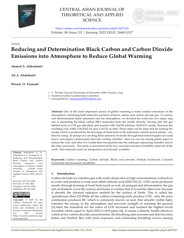 CENTRAL ASIAN JOURNAL OF THEORETICAL AND APPLIED SCIENCE https://cajotas.centralasianstudies.org/index.php/CAJOTAS Volume: 06 Issue: 01 | January 2025 ISSN: 2660-5317 Article Reducing and Determination Black Carbon and Carbon Dioxide Emissions into Atmosphere to Reduce Global Warming Ahmed A. Alibrahimi1 Ali A. Abdullatif2 Wisam O. Toamah3 1. 3. Thi-Qar General Directorate of Education, 64001 Nasiriya, Iraq 2. Student in Gifted Guardianship Committee * Correspondence: ahmedoudah501@gmail.com Abstract: One of the most important causes of global warming is sooty smokes emissions in the atmosphere containing both solid fine particles of black carbon and carbon dioxide gas. To reduce and determination these emissions into the atmosphere, we divided the work into two steps, step one is separating the black carbon (BC) molecules from the smoke directly, leaving only the gas behind such as CO2 gas absorbed and reacted with NaOH solution, Na2CO3 results. Reaction the resulting crop withe Ca(OH)2 for give CaCO3 as salts. These steps can be done first by locking the smoke which is produced by the burnings of fossil fuels in the industries, electric power plants…etc, then by using air pumps we can drag these amounts of smoke through heat-tolerant pipes (we used heavy iron pipes) continuously first into cooling chamber –then we can use strong plastic pipes to reduce the cost- and after it is cooled then transported into the solid-gas separating chamber and to the other processes . The study is characterized by low cost and economic feasibility achieved of the work. The materials used are inexpensive and already available. Citation: Alibrahimi A. A., Abdullatif A. A.,Toamah W. O. Reducing and Determination Black Carbon and Carbon Dioxide Emissions into Atmosphere to Reduce Global Warming. Central Asian Journal of Theoretical and Applied Science 2025, 6(1),2333. Received: 10th Dec 2024 Revised: 11th Dec 2024 Accepted: 16th Dec 2024 Published: 20th Jan 2025 Copyright: © 2025 by the authors. Submitted for open access publication under the terms and conditions of the Creative Commons Attribution (CC BY) license (https://creativecommons.org/l icenses/by/4.0/) Keywords: Global warming, Carbon dioxide, Black soot powder, Sodium hydroxide, Calcium hydroxide and Economic feasibility. 1. Introduction Carbon dioxide is a colorless gas with acidic sharp odor at high concentrations, it dissolves in water and produce a weak acid called carbonic acid (H2CO3) [1] . CO2 can be produced mostly through burning of fossil fuels (such as coal, oil and gas) and deforestation, the gas acts as blankets cover the surface and keeps it warmer that it would be otherwise, because it absorbs the infrared radiation emitted by the surface of Earth. This is called the ‘greenhouse effect [2].While all the carbon-containing fuels produce CO2 , only the poor combustion produces BC which is commonly known as soot, that absorbs visible light, transfers the energy to the atmosphere and prevents sunlight of reaching the ground [3].After the industrial era the ratios of CO2 increased and reached the highest levels recorded which equal in April 2023 to (419 ppm) [4], it causes a directly health effects in which at low carbon dioxide concentrations, the breathing rates increase and skin becomes better and flushed. But with more exposure, and exhausting breathing occurs causing Central Asian Journal of Theoretical and Applied Science 2025, 6(1), 23-33. https://cajotas.centralasianstudies.org/index.php/CAJOTAS 24 headache, faintness and loss consciousness. Nobody can enter area with more than 3 percent carbon dioxide without special equipment of breathing to prevent adverse effects like causing asphyxiation quick without any warning [5]. The health impacts of particles such as black carbon in soot are influenced by their sizes and the substances they carry on their surfaces. These particles range from ultrafine (less than 0.1 µm) to fine (approximately 2.5 µm and smaller), with the smaller ones generally posing greater health risks. After being inhaled, particles larger than 4 µm and those smaller than 0.002 µm are more likely to settle in the mouth and throat, while particles sized between 0.002 µm and 0.2 µm can reach the alveoli in the lungs [6]. Although the sole source of black carbon (BC) production is the combustion of biomass and fossil fuels. (since it is produced by incomplete burning), The impacts of black carbon (BC) vary depending on its various forms. Any mechanism which is efforts aimed at decreasing black carbon (BC) emissions should be aimed in all combustion processes [7].There are many techniques to decrease carbon dioxide ratios including marine microalgae fixation [8], separation by membranes [9], underground storage [10], chemical looping combustion [11], and terrestrial vegetation [12]. The chemical techniques are widely used because of its advantages like high absorption efficiency, simple and high economic value [13] . This document will show an economic way with high efficiency to reduce CO2 gas and BC produced by combustion of carbon-containing materials via chemical-physical way with alkaline solution NaOH, Ca(OH)2 and the cyclone separator model in a mechanical effective method. The study is characterized by low cost and economic feasibility achieved from the work. The materials used are inexpensive and readily available. 2. Materials and Methods 2.1. Instrumentation 1. Vacuum pumps 2. Liquid filtration equipments 3. Digital balance. 4. Fossil fuels burning source. 5. Water pumps 6. Plastic beakers. 7. Iron and plastic pipes. 8. Plastic connecting tubes. 9. Cyclone separator. 10. Soot and CaCO3 collecting chambers. 2.1.2. General Reagents 1. Sodium hydroxide. 2. Calcium hydroxide. 3. Black carbon (BC). 4. Carbon dioxide. 5. Distill water. 2.2. Preparation Methods of Stationary Phases 2.2.1. Physical Method Cyclone separators offer an economical and low-maintenance approach to eliminating particulate matt