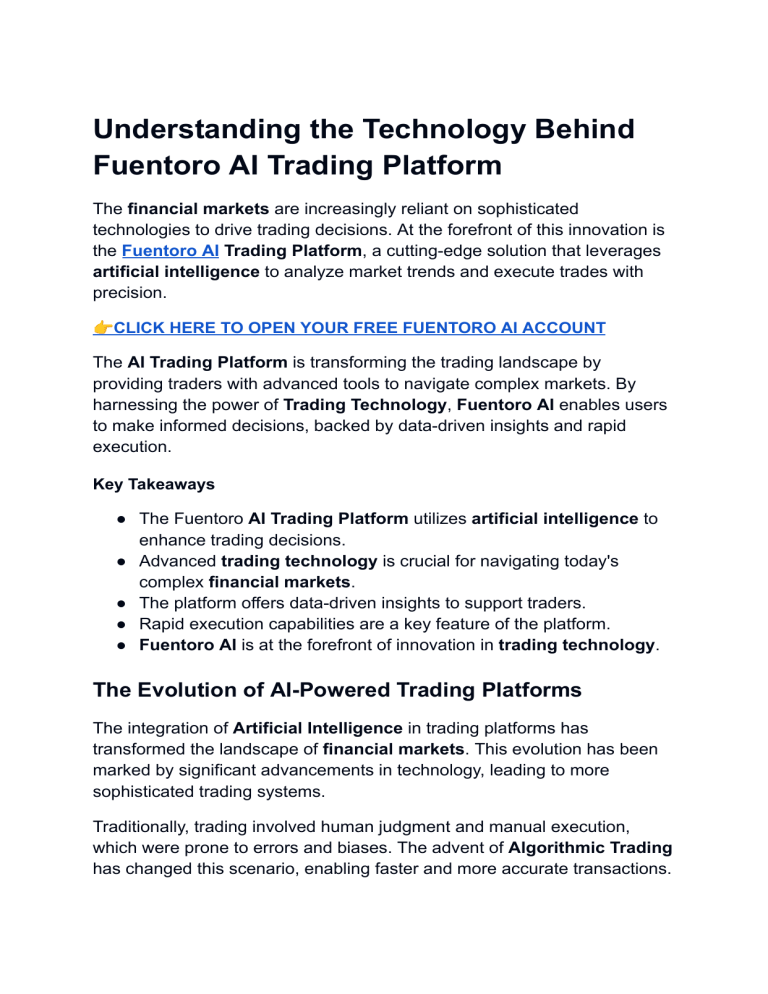 Understanding the Technology Behind Fuentoro AI Trading Platform The financial markets are increasingly reliant on sophisticated technologies to drive trading decisions. At the forefront of this innovation is the Fuentoro AI Trading Platform, a cutting-edge solution that leverages artificial intelligence to analyze market trends and execute trades with precision. πCLICK HERE TO OPEN YOUR FREE FUENTORO AI ACCOUNT The AI Trading Platform is transforming the trading landscape by providing traders with advanced tools to navigate complex markets. By harnessing the power of Trading Technology, Fuentoro AI enables users to make informed decisions, backed by data-driven insights and rapid execution. Key Takeaways ββ The Fuentoro AI Trading Platform utilizes artificial intelligence to enhance trading decisions. ββ Advanced trading technology is crucial for navigating today's complex financial markets. ββ The platform offers data-driven insights to support traders. ββ Rapid execution capabilities are a key feature of the platform. ββ Fuentoro AI is at the forefront of innovation in trading technology. The Evolution of AI-Powered Trading Platforms The integration of Artificial Intelligence in trading platforms has transformed the landscape of financial markets. This evolution has been marked by significant advancements in technology, leading to more sophisticated trading systems. Traditionally, trading involved human judgment and manual execution, which were prone to errors and biases. The advent of Algorithmic Trading has changed this scenario, enabling faster and more accurate transactions. Traditional Trading vs. Algorithmic Trading Algorithmic trading uses predefined rules to execute trades, reducing the impact of human emotions on trading decisions. This has led to improved efficiency and reduced costs. The table below highlights the key differences between traditional and algorithmic trading: Criteria Traditional Trading Algorithmic Trading Execution Speed Manual, slower Automated, faster Decision Making Human judgment Predefined algorithms The Rise of AI in Financial Markets The incorporation of Artificial Intelligence in financial markets has further enhanced trading capabilities. AI algorithms can analyze vast amounts of data, identify patterns, and make predictions, thereby improving trading outcomes. The use of AI in trading platforms has opened new avenues for investors, providing them with sophisticated tools to navigate complex financial markets. Fuentoro AI: Core Technology and Architecture At the heart of Fuentoro AI Review lies a complex system of algorithms and neural networks designed to analyze and predict market trends with high accuracy. This sophisticated technology enables Fuentoro AI to make informed trading decisions, maximizing returns for its users. Proprietary Machine Learning Algorithms Fuentoro AI employs proprietary machine learning algorithms that are capable of learning from vast amounts of market data. These algorithms are crucial for predicting price movements and optimizing trading strategies. Supervised Learning Models for Price Prediction Supervised learning models are used to train the system on historical data, enabling it to predict future price movements based on patterns identified in the data. Reinforcement Learning for Strategy Optimization Reinforcement learning techniques allow the system to optimize its trading strategies by learning from the outcomes of its actions, adapting to changing market conditions. π₯START TRADING SMARTER WITH FUENTORO AI — JOIN HERE Neural Network Infrastructure The neural network infrastructure of Fuentoro AI is designed to recognize complex patterns in market data. This infrastructure is critical for making accurate predictions and informed trading decisions. Deep Learning Networks for Pattern Recognition Deep learning networks play a key role in pattern recognition, enabling the system to identify subtle trends and anomalies in the market data. Technology Description Application Machine Learning Algorithms that learn from data Price Prediction Neural Networks Complex networks for pattern recognition Trend Analysis Deep Learning Advanced networks for subtle pattern recognition Anomaly Detection Data Processing and Analysis Capabilities At the heart of Fuentoro AI's success is its robust data processing and analysis infrastructure. The platform's ability to handle vast amounts of data in real-time is crucial for making informed trading decisions. Real-Time Market Data Integration Fuentoro AI integrates real-time market data, enabling traders to react swiftly to market changes. This feature is crucial for staying competitive in the fast-paced trading environment. Big Data Analytics Framework The Big Data Analytics framework is a cornerstone of Fuentoro AI's data processing capabilities. It allows for the analysis of structured and unstructured data, providing a comprehensive view of market trends. Structured and Unstructured Data Processing Fuentoro AI can process both structured and unstructured data, including financial reports, news articles, and social media feeds. This capability is essential for gaining a complete understanding of market dynamics. Predictive Analytics Models Fuentoro AI Reviews Trustpilot The platform utilizes predictive analytics models to forecast market movements. These models are continuously refined to improve accuracy. Cloud Computing Resources and Scalability Fuentoro AI leverages cloud computing resources to ensure scalability and flexibility. This allows the platform to handle increased data loads without compromising performance. The combination of real-time data integration, big data analytics, and cloud computing resources makes Fuentoro AI a powerful tool for traders. As illustrated in the diagram: , the platform's infrastructure is designed to support complex data analysis. By harnessing the power of big data and cloud computing, Fuentoro AI provides traders with the insig