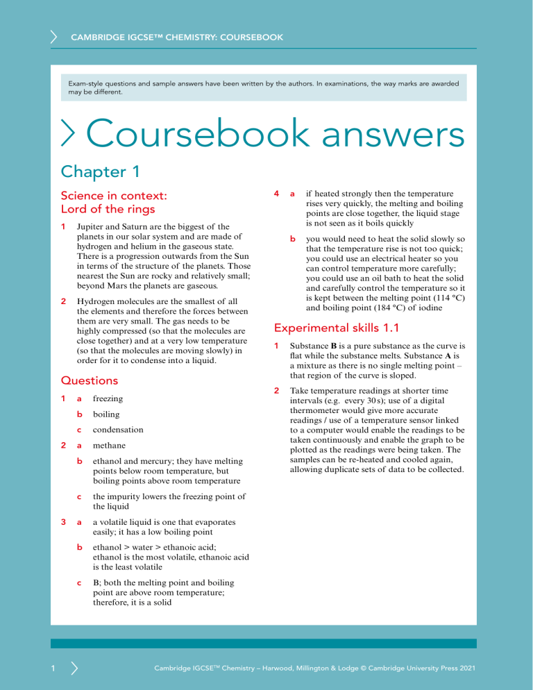 CAMBRIDGE IGCSE™ CHEMISTRY: COURSEBOOK Exam-style questions and sample answers have been written by the authors. In examinations, the way marks are awarded may be different. Coursebook answers Chapter 1 Science in context: Lord of the rings 1 2 Jupiter and Saturn are the biggest of the planets in our solar system and are made of hydrogen and helium in the gaseous state. There is a progression outwards from the Sun in terms of the structure of the planets. Those nearest the Sun are rocky and relatively small; beyond Mars the planets are gaseous. Hydrogen molecules are the smallest of all the elements and therefore the forces between them are very small. The gas needs to be highly compressed (so that the molecules are close together) and at a very low temperature (so that the molecules are moving slowly) in order for it to condense into a liquid. Questions 1 2 3 1 4 a freezing b boiling c condensation a methane b ethanol and mercury; they have melting points below room temperature, but boiling points above room temperature c the impurity lowers the freezing point of the liquid a a volatile liquid is one that evaporates easily; it has a low boiling point b ethanol > water > ethanoic acid; ethanol is the most volatile, ethanoic acid is the least volatile c B; both the melting point and boiling point are above room temperature; therefore, it is a solid a if heated strongly then the temperature rises very quickly, the melting and boiling points are close together, the liquid stage is not seen as it boils quickly b you would need to heat the solid slowly so that the temperature rise is not too quick; you could use an electrical heater so you can control temperature more carefully; you could use an oil bath to heat the solid and carefully control the temperature so it is kept between the melting point (114 °C) and boiling point (184 °C) of iodine Experimental skills 1.1 1 Substance B is a pure substance as the curve is flat while the substance melts. Substance A is a mixture as there is no single melting point – that region of the curve is sloped. 2 Take temperature readings at shorter time intervals (e.g. every 30 s); use of a digital thermometer would give more accurate readings / use of a temperature sensor linked to a computer would enable the readings to be taken continuously and enable the graph to be plotted as the readings were being taken. The samples can be re-heated and cooled again, allowing duplicate sets of data to be collected. Cambridge IGCSETM Chemistry – Harwood, Millington & Lodge © Cambridge University Press 2021 CAMBRIDGE IGCSE™ CHEMISTRY: COURSEBOOK Chapter 1 continued 10 In a the liquid levels are the same as there is air both inside and outside the porous pot cylinder; in b hydrogen diffuses into the pot faster than air molecules diffuse out because hydrogen molecules have less mass than the air molecules; this produces an increase in pressure inside the pot and so the liquid level is pushed down on the left (and up on the right). Questions Temperature / °C 5 80 liquid freezing 0 solid –20 Time 6 A = solid; B = energy released; C = energy absorbed 7 A = solid; B = liquid; C = liquid and gas (vapour); D = gas Experimental skills 1.2 1 silver iodide 2 silver nitrate + potassium iodide → silver iodide + potassium nitrate 3 the rates of diffusion of silver and iodide ions 4 because the rates of diffusion of the ions are not the same – silver ions are less heavy and so diffuse slightly more quickly Questions 8 9 2 Exam-style questions 1 6 7 8 9 Evaporation of bromine takes place as molecules escape from the surface of the liquid, the gaseous bromine molecules then spread throughout the gas jar to completely fill the container, there are collisions with air molecules, bromine molecules move from a region of high concentration to low concentration and so are completely mixed with the air and at the same concentration throughout. a Methylamine molecules have a greater mass than ammonia molecules and so diffuse more slowly; the white smoke ring will be more central than for ammonia/ hydrogen chloride, slightly to the right of centre as methylamine diffuses slightly faster than hydrogen chloride. b hydrogen bromide (from hydrobromic acid) or hydrogen iodide (from hydroiodic acid) B [1] ; 2 D [1] ; 3 C [1] ; 4 B [1] ; 5 A [1] ; a Moving slowly [1] ; close to each other [1] ; b They vibrate more quickly ; [1] c evaporation ; [1] d changing from liquid to solid ; [1] a evaporation of the liquid [1] ; and diffusion of the gas particles [1] ; b particles moved more slowly [1] ; because the temperature was lower [1] ; a a solid [1] ; is cooling down [1] ; b they are moving more slowly [1] ; and closer together [1] ; c heat comes from the formation of bonds (interactive forces) between the particles [1] ; a ammonia, which is alkaline, reached the indicator first to change its colour [1] ; because it moved faster [1] ; because it was lighter [1] ; b C 50 s ; [1] rate of diffusion is inversely related to the molecular mass ; heavier molecules, such as HCl here, diffuse more slowly than lighter molecules Answers A and D are too short ; answer B too long. Simple proportion would suggest about 73 s, but the rate of diffusion is inversely related to the square root of the molecular mass. Ammonia molecules diffuse 1.46 times as fast as hydrogen chloride molecules. ; [1] Cambridge IGCSETM Chemistry – Harwood, Millington & Lodge © Cambridge University Press 2021 CAMBRIDGE IGCSE™ CHEMISTRY: COURSEBOOK Chapter 2 Getting started 1 2 ‘H’ and ‘O’ are the chemical symbols for a hydrogen atom and an oxygen atom, respectively. Water consists of two hydrogen atoms chemically bonded to one oxygen atom. When atoms join together like this, they form a molecule. A molecule must have more than one atom in it. You may have heard of protons, neutrons and electrons; these are subatomic particles, and they come together to make the many different types of atom. Science in context: See