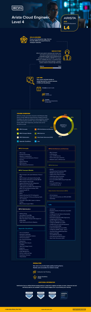 Arista Cloud Engineer, Level 4 ACE Cloud Professional L4 Skills Acquired Focus on the Enterprise edge, Service Provider WAN and Large Enterprise Transport networks. Who is it for? ACE:L4 is best suited for individuals with at least a midlevel network engineering background, and are comfortable with layer 2 and 3 architectures and concepts such as EVPN and MP-BGP. This course is suitable for candidates who are in, or would like to find, mid-to-senior level network engineer or operation positions related to enterprise edge networking. Expert Beginner Lab Time This course includes hands-on virtual labs built on current versions of EOS and CloudVision. 3 weeks access to Labs 3 Weeks 1 week Instructor Led 2 weeks Work on labs independently to refine skills Course Overview 10% ACE:L4 is a 5-day course that is focused on the Enterprise edge, 20% Service Provider WAN and Large Enterprise Transport networks. 10% Candidates will explore the advanced routing capabilities available within Arista hardware and EOS. Topics such as MPLS, Segment Routing, EVPN, Traffic Engineering, and Data Center will be discussed at length. Applicable t I 10% MPLS Concepts MPLS Architecture and Services MPLS Transport Models MPLS Services MPLS Optimization Data Center Interconnect (DCI) Appendix: CloudVision La o nstructor Led Training 25% 25% bs MPLS Concepts MPLS Architecture and Services MPLS Transpor MPLS Toda 3 VPN Service Layer 2 EVPN Service Point to Point Layer 2 Service Multipoint Layer 2 VPN Services Essential Terminolog Migration Consideration Label Actions and Distribution Protoco Signalin Segment Routin MPLS Service MPLS Deployment Scenarios MPLS Services BG MP- MPLS Transport Models Virtual Routing BG MPMPLS Transport with Label Distribution Protocol L (LDP L ( & Forwarding (VRF P Label Advertisemen 3VPN Control Plane Processin 3VPN Data Plane Processin MPLS Transport with Segment Routing SR E-Line with LDP Pseudowir MPLS Transport SR Options: S- S-SR, E-Line with EVPN VWPS Virtual Private Wire I I I I BG I I BG ( P-S Service MPLS Transport with S- S-S fi Segment Routing: S- S SR Con guratio E-Line with EVPN Type- MPLS Transport with L P-S 3 EVPN (Route-type 5) Traffic Engineering, RSVP Traffic Engineering (RSVP-TE), and Segment Routing Traffic ( Engineering SR-TE Data Center Interconnect (DCI) RSVP-T SR-T I I fi I Segment Routing: S- S TE Con guratio DC Architectur Segment Routing: TE Policy and Steering Traffic Layer into a TE Polic Case Study U sing fi BG P to 2 & 3 Connectivity over MPLS-SR WA B ind MPLS Labels to Address Pre xe MPLS Feature Support Matrix bs La Lab Acces MPLS Optimization I I Assigning nterface P addresses using Static Nexthop U BG fi Grou fi fi Con glet Con guring Provider Network Reachabilit IB ser-de ned Tunnel R Enable MPLS and LD Hop Resolution RIB Flow Aware Transport (FAT) Support on I I P Next- Static S- S Segment-Routing Traffic Engineerin fi Con guring SR-TE Polic EVPN VPW Steering Traffic into a TE Polic fi fi Traffic Steering and Service Mapping BG Con guring MP- 3VP P and L Con guring E-Line with LDP Pesudowir E-Line with EVPN VPW 2 (L2 EVPN 3EVPN - Route - type Troubleshooting L3EVPN Data Plan E-LAN with EVPN Type- Appendix: CloudVision fi Con guring L I ntro to CloudVisio I System-Tunnel-R IB Automation Landscap Tunnel R CloudVision Deployment Option Path Selectio Color Steering with SR-TE Polic I CVP Communicatio ( I) Data Center nterconnect DC Z ero Touch Provisionin Deploymen B ug Alerts EOL Lifecycl fi Con glet Tasks and Change Contro Snapshot Rollback Overvie I mage Managemen Devices, Labels and Tag CloudVision Telemetr U sing Studios Modalities Our aim is to provide high quality training that is flexible and accessible for modern needs. Instructor-led Training Arista Academy P R O Additional Information Veri fication from an official Arista training partner is required to register and take an exam. Instructor-led and self-study options are available. Look for these badges prior to purchasing your training. +1-866-SDN-PROS (736-7767) www.sdn-pros.com trainin g@sdn-pros.com