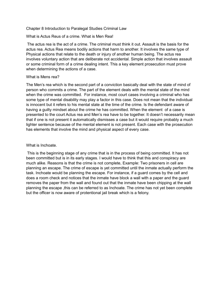 Chapter 8 Introduction to Paralegal Studies Criminal Law What is Actus Reus of a crime. What is Men Rea! The actus rea is the act of a crime. The criminal must think it out. Assault is the basis for the actus rea. Actus Rea means bodily actions that harm to another. It involves the same type of Physical actions that relate to the death or injury of another human being. The actus rea involves voluntary action that are deliberate not accidental. Simple action that involves assault or some criminal form of a crime dealing intent. This a key element prosecution must prove when determining the actions of a case. What is Mens rea? The Men’s rea which is the second part of a conviction basically deal with the state of mind of person who commits a crime. The part of the element deals with the mental state of the mind when the crime was committed. For instance, most court cases involving a criminal who has some type of mental disability may play a factor in this case. Does not mean that the individual is innocent but it refers to his mental state at the time of the crime. Is the defendant aware of having a guilty mindset about the crime he has committed. When the element of a case is presented to the court Actus rea and Men’s rea have to be together. It doesn’t necessarily mean that if one is not present it automatically dismisses a case but it would require probably a much lighter sentence because of the mental element is not present. Each case with the prosecution has elements that involve the mind and physical aspect of every case. What is Inchoate. This is the beginning stage of any crime that is in the process of being committed. It has not been committed but is in its early stages. I would have to think that this and conspiracy are much alike. Reasons is that the crime is not complete, Example: Two prisoners in cell are planning an escape. The crime of escape is yet committed until the inmate actually perform the task. Inchoate would be planning the escape. For instance, if a guard comes by the cell and does a room check and notices that the inmate have block a wall with a paper and the guard removes the paper from the wall and found out that the inmate have been chipping at the wall planning the escape ,this can be referred to as Inchoate. The crime has not yet been complete but the officer is now aware of protentional jail break which is a felony.