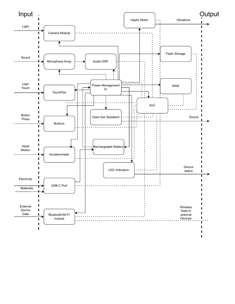 Input Output Haptic Motor Vibrations Light Camera Module Flash Storage Sound Microphone Array User Touch TouchPad Audio DSP Power Management IC RAM SoC Button Press Open-Ear Speakers Sound Buttons Head Motion Rechargeable Battery Accelerometer LED Indicators Device status Electricity Materials External Device Data USB-C Port Bluetooth/Wi-Fi module Wireless Data to external Devices
