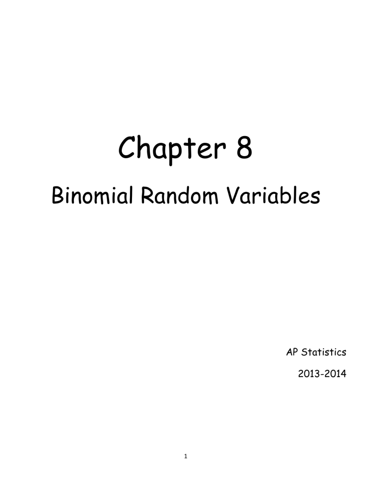 Chapter 8 Binomial Random Variables AP Statistics 2013-2014 1 AP Statistics rd 3 Six weeks (2013-2014) TUESDAY MONDAY November 11 12 Sampling Designs Random Rectangle Activity HW: 5.20,5.21,5.24, 5.25,5.26,5.28,5.30 18 Randomized Experiments WEDNESDAY 13 HW: What Sampling Method Would be Best? 19 Quiz 5.2 Take Home Quiz 5.1 Go over Random Rectangle Activity THURSDAY 14 Experimental Designs HW: WS HW: 5.35 and 5.36 20 Chapter 5 Review 21 Chapter 5 Test FRIDAY 15 Computer Lab for Fall Project 22 Intro to Random Variables Work WS Free Response in class. HW: 5.38-5.43 5.45-5.48 25 Continuous Random Variables HW: 7.6-7.8, 7.137.17odd Project Due Dec 2 Means and Variances of Random Variables HW: Review 26 Activity: Simulation 3 Calculating Expected Value/Law of Large Numbers HW: 7.22, 7.28, 7.34, 7.36, 7.37, 7.41,7.46, 7.60, 7.61 HW: Worksheet 7.24,7.25,7.32,7.33 9 Binomial Formula 10 Normal Approximation to a Binomial Distribution HW: 7.3, 7.4, 7.5 HW: 5.74,5.75,5.83,5.87 27 28 29 Thanksgiving Holiday Thanksgiving Holiday Thanksgiving Holiday 4 Chapter 7 Review 5 6 Binomial Distribution Chapter 7 Test HW: Review Sheet 11 Quiz 8.1 HW: WS 12 Final Exam Review 13 Final Exam Review 19 20 HW: WS HW: Final Exam Review HW: WS 16 17 Final Exams 18 Final Exams Final Exams Final Exams Final Exams **All assignments subject to last minute changes! 2 4th six weeks (2013-2014) MONDAY January 6 TUESDAY WEDNESDAY HW: Worksheet 8 Review Normal Approximations/ Standard Normal Calculations 13 Simulation 14 Chapter 8 Review HW: WS 15 Chapter 8 Test HW: Review Sheet 20 HW: Review Sheet 21 Holiday 7 Review Binomial AP Stats THURSDAY 9 Intro To Geometric Distributions FRIDAY 10 Binomial/Geometric Distributions Mixed HW: WS #2 Holiday 27 Chapter 9 Test Quiz – 9.3 HW: WS 9-3 #2 28 Confidence Intervals and z* HW: AP Quiz Review #1 HW: 10.5 – 10.11 February 3 Tests of Significance 4 Tests of Significance (continued) 16 Sampling Distributions. (Video) HW: Short Sampling Dist. Activity 22 More Sampling Distribution Practice WS #3 in class HW: 9.1-9.4, 9.109.13 23 Chapter 9 Review HW: Review 29 Desired Sample Size HW: AP Problem Set 30 Quiz 10.1 HW: 10.12 – 10.18 Skip 10.17 5 Quiz 10.2 HW: AP Problem Set 6 Practical vs Statistical Significance/Tests from Confidence Intervals HW: Review #2 HW: Worksheet Review #1 10 Error of a Decision 11 Type II Error and Power HW: Worksheet HW: WS 17 Professional Learning Day Student Holiday 18 Intro to T – Tests 17 Intro to Sample Means HW: WS 9-3 #1 24 Intro to Confidence Intervals HW: Activity Write-up 10.1-10.4 31 Intro to Tests of Significance HW: W/S and 10.2910.32 7 Test 10.1 and 10.2 HW: AP Quiz Review #5 HW: Review 12 Type II Error and Power 13 HW: Quiz Review 10.72, 10.73 optional 19 HW: Review Sheet Test 10.1 to 10.4 HW: WS 11.3,11.4,11.8,11. 10 Quiz 14 Review 20 Matched Pairs TTests 21 HW: Worksheet HW: Probability Review Half Day **All assignments are subject to last minute changes!!! 3 Name ________________________________ Period _________________ Binomial Distributions Questions A free-throw shooter has a 70% average for making free-throws. Out of 20 attempts, find the following probabilities: 1. P(10 makes) 2. P(at least 10 makes) 3. P(17 makes) 4. P(at most 17 makes) 5. P(20 makes) 6. P(5 makes) 7. P(16 or more makes) 8. P(11 makes) 9. P(at most 11 makes 10. P(at least 11 makes) 11. P(between 12 to 17 makes) 12. P(from 12 to 17 makes inclusive) 12. How many free-throws do you expect this shooter to make? 13. If the probability that a light bulb is defective is .1, what is the probability that exactly 3 of 8 light bulbs are defective? At most 3 of 8 are defective? 14. Suppose that 30% of employees in a large factory are smokers. What is the probability that there will be exactly two smokers in a randomly chosen five-person work group? At least 2 smokers in the same group? 4 15. Joe DiMaggio had a career batting average of .325. What was the probability that he would get at least one hit in five official at-bats? 16. A manager notes that there is a .125 probability that any employee will arrive late for work. What is the probability that exactly one person in a six person department will arrive late? 17. A manufacturer has the following quality control check at the end of a production line: If at least 8 of 10 randomly selected articles meet all specifications, the whole shipment is approved. If, in reality, 85 % of a particular shipment meets all specifications, what is the probability that the shipment will make it through the control check? 5 Name ____________________________ Period _________________ Binomial Distribution Worksheet 1) List the four rules of a binomial setting. 1. 2. 3. 4. 2) Consider a basketball player shooting 8 free-throws. Produce a probability histogram for a 20% success rate, a 50% success rate and an 80% success rate. Draw them in the grids provided. Comment on the differences in the histograms. 3) Calculate the mean and standard deviation for each of the three success rates listed in problem #2. At which probability value is the spread (standard deviation) the biggest? 20% 4) 50% 80% Write out the formula for calculating probabilities in a binomial setting. Then use the formula to calculate the above free-throw shooter makes exactly 5 free-throws, assuming an 80% success rate. 6 5) A certain tennis player makes a successful serve 70% of the time. Assume that each serve is independent of the others. If she serves 6 times, what is the probability that she gets a) all 6 serves in? b) exactly 4 serves in? c) at least 4 serves in? d) no more than 4 serves in? 6) An orchard owner knows he’ll have to use 6% of the apples he harvests for cider because they will have bruises or blemishes. He expects a tree to produce 300 apples. a) Describe an appropriate model for the number of cider apples that may come from a tree. Justify your model. b) Find the probability there will be no more than a dozen cider apples. c) Is it likely there will be more 