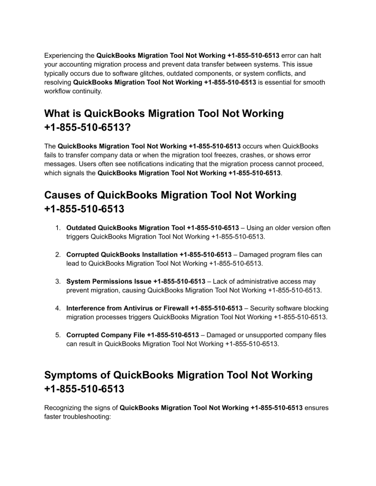 Experiencing the QuickBooks Migration Tool Not Working +1-855-510-6513 error can halt your accounting migration process and prevent data transfer between systems. This issue typically occurs due to software glitches, outdated components, or system conflicts, and resolving QuickBooks Migration Tool Not Working +1-855-510-6513 is essential for smooth workflow continuity. What is QuickBooks Migration Tool Not Working +1-855-510-6513? The QuickBooks Migration Tool Not Working +1-855-510-6513 occurs when QuickBooks fails to transfer company data or when the migration tool freezes, crashes, or shows error messages. Users often see notifications indicating that the migration process cannot proceed, which signals the QuickBooks Migration Tool Not Working +1-855-510-6513. Causes of QuickBooks Migration Tool Not Working +1-855-510-6513 1. Outdated QuickBooks Migration Tool +1-855-510-6513 – Using an older version often triggers QuickBooks Migration Tool Not Working +1-855-510-6513. 2. Corrupted QuickBooks Installation +1-855-510-6513 – Damaged program files can lead to QuickBooks Migration Tool Not Working +1-855-510-6513. 3. System Permissions Issue +1-855-510-6513 – Lack of administrative access may prevent migration, causing QuickBooks Migration Tool Not Working +1-855-510-6513. 4. Interference from Antivirus or Firewall +1-855-510-6513 – Security software blocking migration processes triggers QuickBooks Migration Tool Not Working +1-855-510-6513. 5. Corrupted Company File +1-855-510-6513 – Damaged or unsupported company files can result in QuickBooks Migration Tool Not Working +1-855-510-6513. Symptoms of QuickBooks Migration Tool Not Working +1-855-510-6513 Recognizing the signs of QuickBooks Migration Tool Not Working +1-855-510-6513 ensures faster troubleshooting: ● Migration process freezes during data transfer +1-855-510-6513. ● Error messages display QuickBooks Migration Tool Not Working +1-855-510-6513. ● QuickBooks crashes unexpectedly when migration is initiated +1-855-510-6513. ● Migrated data is incomplete or missing +1-855-510-6513. ● Slow system performance during migration process +1-855-510-6513. Solutions to Fix QuickBooks Migration Tool Not Working +1-855-510-6513 1. Update QuickBooks and Migration Tool +1-855-510-6513 1. Ensure your QuickBooks version is updated +1-855-510-6513. 2. Install the latest QuickBooks Migration Tool updates +1-855-510-6513. 3. Restart the computer and verify if QuickBooks Migration Tool Not Working +1-855-510-6513 is resolved. 2. Run QuickBooks as Administrator +1-855-510-6513 1. Right-click the QuickBooks icon +1-855-510-6513. 2. Select Run as Administrator to provide elevated permissions +1-855-510-6513. 3. Launch the migration process and check if QuickBooks Migration Tool Not Working +1-855-510-6513 persists. 3. Check Antivirus and Firewall Settings +1-855-510-6513 1. Temporarily disable antivirus or firewall +1-855-510-6513. 2. Attempt the migration again +1-855-510-6513. 3. Ensure QuickBooks and migration tool are added to exceptions to prevent QuickBooks Migration Tool Not Working +1-855-510-6513. 4. Repair QuickBooks Installation +1-855-510-6513 1. Press Windows + R, type appwiz.cpl +1-855-510-6513, and press Enter. 2. Locate QuickBooks and click Repair +1-855-510-6513. 3. Follow the instructions and restart the system +1-855-510-6513. 5. Verify Company File Integrity +1-855-510-6513 1. Open QuickBooks and use Verify Data Utility +1-855-510-6513. 2. If issues are found, use Rebuild Data Utility to repair +1-855-510-6513. 3. Retry migration to resolve QuickBooks Migration Tool Not Working +1-855-510-6513. 6. Perform a Clean Installation of QuickBooks +1-855-510-6513 1. Uninstall QuickBooks completely +1-855-510-6513. 2. Use QuickBooks Clean Install Tool to remove leftover files +1-855-510-6513. 3. Reinstall QuickBooks and the migration tool +1-855-510-6513. Preventive Measures to Avoid QuickBooks Migration Tool Not Working +1-855-510-6513 ● Regularly update QuickBooks and migration tool +1-855-510-6513. ● Backup all company files before migration +1-855-510-6513. ● Avoid using unsupported or corrupted company files +1-855-510-6513. ● Ensure sufficient system permissions +1-855-510-6513. ● Keep antivirus and firewall configured properly +1-855-510-6513. LSI Keywords for QuickBooks Migration Tool Not Working +1-855-510-6513 ● QuickBooks migration error +1-855-510-6513 ● QuickBooks data migration not working +1-855-510-6513 ● QuickBooks migration tool issues +1-855-510-6513 ● QuickBooks migration failure fix +1-855-510-6513 ● QuickBooks migration troubleshooting guide +1-855-510-6513 FAQ About QuickBooks Migration Tool Not Working +1-855-510-6513 Q1: Why is QuickBooks Migration Tool Not Working +1-855-510-6513? A1: Causes include outdated software, corrupted QuickBooks installation, antivirus interference, and unsupported company files +1-855-510-6513. Q2: Will updating QuickBooks fix QuickBooks Migration Tool Not Working +1-855-510-6513? A2: Yes, updates often fix bugs and compatibility issues causing QuickBooks Migration Tool Not Working +1-855-510-6513. Q3: Can I migrate data without QuickBooks Migration Tool +1-855-510-6513? A3: Alternative manual methods exist but using the migration tool is safer and ensures data integrity +1-855-510-6513. Q4: How can I prevent QuickBooks Migration Tool Not Working +1-855-510-6513? A4: Backup data, keep QuickBooks updated, and verify company files before migration +1-855-510-6513. Q5: Who can help if QuickBooks Migration Tool Not Working +1-855-510-6513 persists? A5: QuickBooks support professionals are available to assist at +1-855-510-6513.