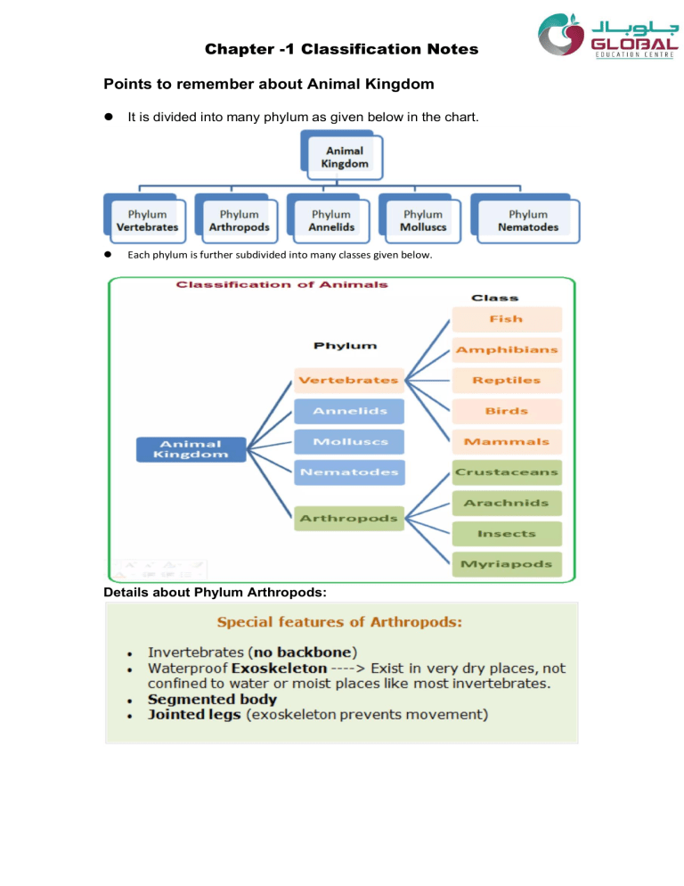 Chapter -1 Classification Notes Points to remember about Animal Kingdom It is divided into many phylum as given below in the chart. Each phylum is further subdivided into many classes given below. Details about Phylum Arthropods: Chapter -1 Classification Notes Arthropods is divided into four classes Athropods Key features of Insects: 3 pairs of jointed legs 2 pairs of wings 1 pair of antennae 3 body segments: Head, Thorax, Abdomen 1 pair of compound eyes Breath through tracheae Key features of Crustaceans: 5-7 pairs of legs 2 pairs of antennae 2 body segments: Cephalothorax(fused head and thorax), Abdomen Exoskeleton often calcified to form a particularly hard carapace, for Chapter -1 Classification Notes protection . Compound eyes Breath via Gills, live in water! Key features of Arachnids: 4 pairs of legs no wings 2 body parts: Cephalothorax, Abdomen all have piercing jaws since all are predator chelicerae (pointed mouthparts) for biting and poisoning prey Key features of Millipedes: long, thin body with many segments for moving easily through soil and leaf litter each segment has jointed legs (>9 pairs) 1 pair of antennae as sense organs in dark habitats Chapter -1 Classification Notes Other phylum of invertebrates: Nematods: long worms, thin body with no segments. They live in diverse habitats. Some of them are parasitic. Other phylum of invertebrates: Annelids: Annelids are worms, with bodies made up of ring-like segments. Most of them live in water, some like the earthworm live in moist soil. Compound eyes. Other phylum of invertebrates: Mollusca: Molluscs are soft-bodies animals, sometimes with a shell (snails) or without (slugs). slimy bodied Radula is the rasping organ. Mantle cavity is present. Eyes on tentacles.