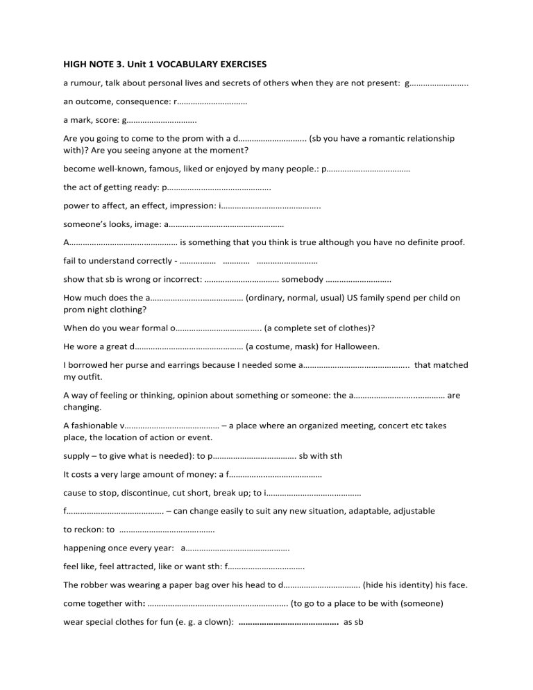 HIGH NOTE 3. Unit 1 VOCABULARY EXERCISES a rumour, talk about personal lives and secrets of others when they are not present: g…………………….. an outcome, consequence: r…………………….…… a mark, score: g…………………………. Are you going to come to the prom with a d…………………….….. (sb you have a romantic relationship with)? Are you seeing anyone at the moment? become well-known, famous, liked or enjoyed by many people.: p…………….………………… the act of getting ready: p………………………………………. power to affect, an effect, impression: i…………………………………….. someone’s looks, image: a…………………………………………… A………………………………………… is something that you think is true although you have no definite proof. fail to understand correctly - ……….…… ………… ……………………… show that sb is wrong or incorrect: …………………………… somebody ……………………….. How much does the a…………………..……………… (ordinary, normal, usual) US family spend per child on prom night clothing? When do you wear formal o……………………………….. (a complete set of clothes)? He wore a great d………………………………………… (a costume, mask) for Halloween. I borrowed her purse and earrings because I needed some a……………………………………….. that matched my outfit. A way of feeling or thinking, opinion about something or someone: the a…………………..…..………… are changing. A fashionable v…………………………………… – a place where an organized meeting, concert etc takes place, the location of action or event. supply – to give what is needed): to p………………………………. sb with sth It costs a very large amount of money: a f……………..…………………… cause to stop, discontinue, cut short, break up; to i…………………………………… f……………………………………. – can change easily to suit any new situation, adaptable, adjustable to reckon: to ….………………………….……. happening once every year: a………………………………………. feel like, feel attracted, like or want sth: f……………………………. The robber was wearing a paper bag over his head to d……………………………. (hide his identity) his face. come together with: ………………….…………………………………. (to go to a place to be with (someone) wear special clothes for fun (e. g. a clown): ……………………………………. as sb take part in (the conversation): ……………………………………………… I watched the interview and felt he …………………….……………………….. (seemed) as quite arrogant. you don’t respect sb: you ……………………………………………………………………. you respect, admire sb very much: you ………………………………………………….. start (a company): ……………………………………………… (a company) WORD BUILDING Unit 1 …………………………….…………..………………. often cost a fortune. (prepare) The American film and TV culture have great …………………...…………..………….. . (influential) Don't judge her by her sloppy ………………………….…………………. . (appear) It can be deceptive. It was ……………………………………………………… to hit the ball so close to the window. (responsible) I want to thank everyone who has …………..…..…………………………… and supported me. (courage) ………………………………….…………., we can get it wrong / we make a ………………………………………….. when we judge people by their appearance. (fortune) Trudy is a sales a………………………………………. In a boutique in a shopping centre in Oxford. (assist) She wants to become a fashion ……..……………………..………… in the future. (design) Because he was so late, she made the …….………………………………………. that he had missed the bus. (assume) His ……………………………….………….. became increasingly violent. (behave) Our results have shown some ………………………………………………….. this month. (Improve) Some supermodels are far too …………………….………………….. . (skin) He was fast and strong, with a slender, ……………………….…………………….. body. (muscle) The sales staff are all ……………………………………………………………., helpful, and cheerful. (knowledge) I feel a lot of …………………..…………………… to do well in school. (press) The maths teacher ……………………………………. books, rulers, and paper for the last test. (provision) An increasing number of students are organizing their own cheaper, more relaxed …………………………. . (celebrate). I don't want to be …………………..……………… to anyone, so you'll all get a chance. (fair) Water had got into the radio, and it was completely ……………………………………………. . (use) The price for the holiday includes flights and ……………………………………………….. . (accommodate) I've got a nice dress at a ……………………….……………………. price. (reason) The workers’ struggle for ……………………………………………. power. (politics) The carpet must have cost a ………………………….……………………. . (unfortunately) Roger never turns down an ………..………….…………………………. to dinner. (invite) I'd like to 