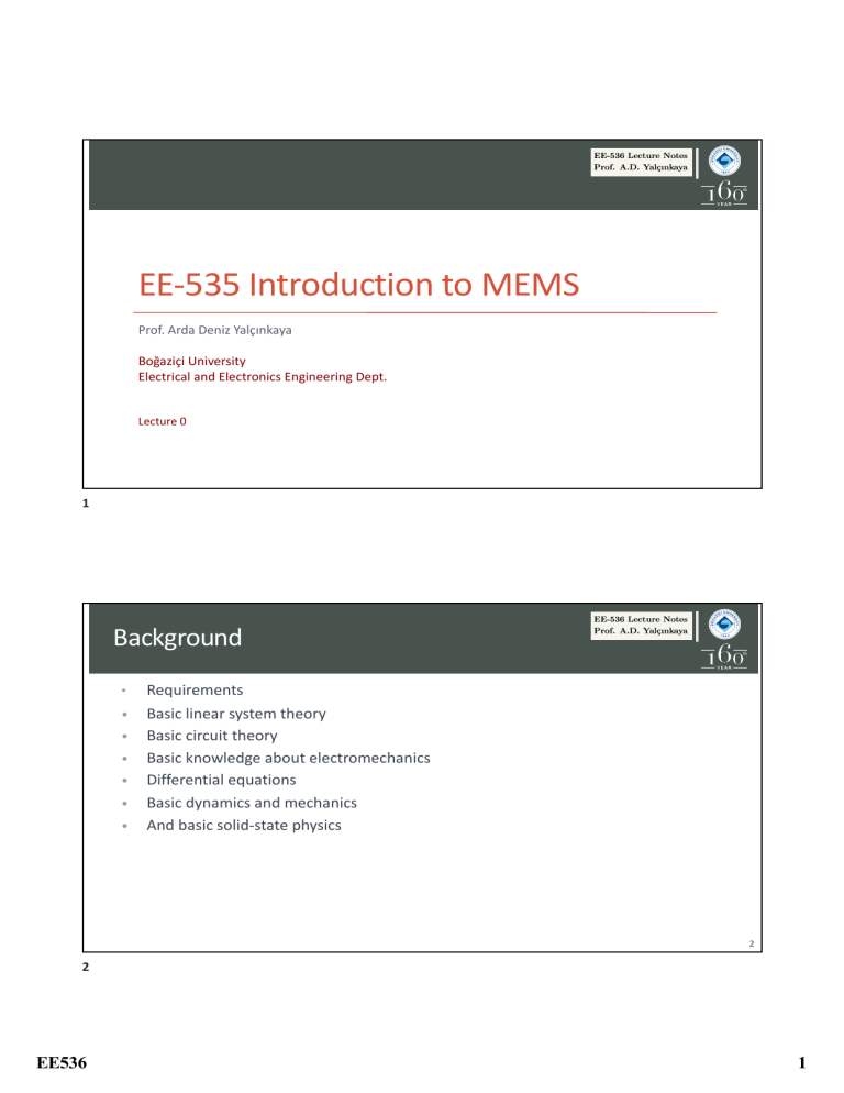 EE-535 Introduction to MEMS Prof. Arda Deniz Yalçınkaya Boğaziçi University Electrical and Electronics Engineering Dept. Lecture 0 1 Background • • • • • • • Requirements Basic linear system theory Basic circuit theory Basic knowledge about electromechanics Differential equations Basic dynamics and mechanics And basic solid-state physics 2 2 EE536 1 Course Outline 3 Syllabus 4 4 EE536 2 MEMS Basics • • • • • • • • • • • • Definition: Micro-structures that can move (narrow def.) Main drivers: Sensing and Actuation Accelerometers/Gyroscopes Pressure/Stress sensors Optical switches/routers Mechanical resonators RF passive components Microfluidics Optical scanning Micro & Nano manipulators/grippers Biosensors Spectroscopy/Imaging systems 5 Feynman's challenge #1 $ 1000 to the first person who builds an operational electric motor which fits into 1/64 inch-cube. a) b) Richard Feynman viewing the micromotor built by William McLellan (left) who won the challenge to build the first motor smaller than 1/64th of an inch. The motor, 3.81 mm wide, photographed under an optical microscope. The huge object above it is the head of a pin. From Physics Web 6 EE536 3 Feynman's challenge #2 • $ 1000 for the first person fitting entire Ency. Brittanica on the head of a pin (60,000 pages) 5.9 μm Silicon Nitride Membrane E-Beam Lithography Pease and Newman, 1985 7 Feynman Grand Prize • Feynman Grand Prize of $250,000 • The Feynman Grand Prize will be awarded to the first team who designs, constructs, and demonstrates both a functional nano-scale robotic arm and a functional nano-scale computing device with specified features. 8 EE536 4 Motivation and Challenges for MEMS • MEMS is a “spin-off” from IC technology • Same motivation as microelectronics: Inexpensive fabrication in large quantities • Challenges: • Expensive fabrication facilities (cleanrooms) (For R&D $ 5-10M, for volume production fab ~$ 1B) • Complex nature of the devices (interactions between different domains) • Prototyping and packaging: long fabrication periods • Virgin research fields 9 Capabilities of MEMS • Miniaturization (with submicron precision) • Small size • Small mass (no gravity effects) • Small cost • Low power • Many functionalities on one-chip • Movable mechanical structures (sensors and actuators) • Optical components • Electronics • Production • Wafer scale fabrication (Batch) • Mass (Volume) production 10 EE536 5 Three Main Disciplines Micro Optics Optomechanics Micro Mechanics Integrated Photonics w. MEMS MEMS on Electronics OptoElectronics Micro Electronics 11 Some MEMS Examples CC-beam resonator (Nanoresonator) SOI torsional resonator GaAs force sensor TI-Digital Light Processor (DLP) Roukes, 2001. 12 EE536 6 MEMS Design and Modeling Designer Inputs System High-level simulations Device Analytical, Macro-models Physical Sim ula Numerical, FEA tio n Ver ific ati on Process TCAD 13 Two-port Approach Electrical port Electrical port Electro Mechanical System Electro Mechanical System Mechanical port Mechanical port Electro Mechanical System Electrical port Intrinsic cascading ! 14 EE536 7 Analogies 15 MEMS Fabrication • Start with a Substrate (wafer) • Deposit thin films (organic, metal, semiconductor, insulator … ) Create masks (Pattern surface structures) Remove sacrificial layers (surface micromachining) Remove parts of the substrate (bulk machining) • • • 16 EE536 8 Fabrication Loop Patterning: Photoresist Thin film Substrate Deposition: -Epitaxy -Oxidation -Physical Vapor Deposition -Chemical Vapor Deposition -Spin-on method -Sol-gel method -Bonding -Optical lithography -E-beam writing -Laser direct writing -AFM lithography -Self-assembly etc. Etching: -Wet -Dry Alternatively; -Isotropic -Anisotropic 17 Actuation-sensing and fabrication 18 EE536 9