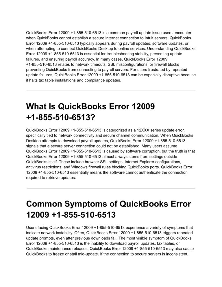 QuickBooks Error 12009 +1-855-510-6513 is a common payroll update issue users encounter when QuickBooks cannot establish a secure internet connection to Intuit servers. QuickBooks Error 12009 +1-855-510-6513 typically appears during payroll updates, software updates, or when attempting to connect QuickBooks Desktop to online services. Understanding QuickBooks Error 12009 +1-855-510-6513 is essential for troubleshooting stability, preventing update failures, and ensuring payroll accuracy. In many cases, QuickBooks Error 12009 +1-855-510-6513 relates to network timeouts, SSL misconfigurations, or firewall blocks preventing QuickBooks from connecting to payroll servers. For users frustrated by repeated update failures, QuickBooks Error 12009 +1-855-510-6513 can be especially disruptive because it halts tax table installations and compliance updates. What Is QuickBooks Error 12009 +1-855-510-6513? QuickBooks Error 12009 +1-855-510-6513 is categorized as a 12XXX series update error, specifically tied to network connectivity and secure channel communication. When QuickBooks Desktop attempts to download payroll updates, QuickBooks Error 12009 +1-855-510-6513 signals that a secure server connection could not be established. Many users assume QuickBooks Error 12009 +1-855-510-6513 is caused by software corruption, but the truth is that QuickBooks Error 12009 +1-855-510-6513 almost always stems from settings outside QuickBooks itself. These include browser SSL settings, Internet Explorer configurations, antivirus restrictions, and Windows firewall rules blocking QuickBooks ports. QuickBooks Error 12009 +1-855-510-6513 essentially means the software cannot authenticate the connection required to retrieve updates. Common Symptoms of QuickBooks Error 12009 +1-855-510-6513 Users facing QuickBooks Error 12009 +1-855-510-6513 experience a variety of symptoms that indicate network instability. Often, QuickBooks Error 12009 +1-855-510-6513 triggers repeated update prompts, even after previous downloads fail. The most visible symptom of QuickBooks Error 12009 +1-855-510-6513 is the inability to download payroll updates, tax tables, or QuickBooks maintenance releases. QuickBooks Error 12009 +1-855-510-6513 may also cause QuickBooks to freeze or stall mid-update. If the connection to secure servers is inconsistent, QuickBooks Error 12009 +1-855-510-6513 might also appear while trying to sign in to payroll subscription accounts or QuickBooks online services. Users may also see internet timeout errors alongside QuickBooks Error 12009 +1-855-510-6513. Primary Causes of QuickBooks Error 12009 +1-855-510-6513 QuickBooks Error 12009 +1-855-510-6513 is commonly caused by misconfigured internet settings. Incompatible or disabled SSL settings prevent QuickBooks from using secure lines of communication, triggering QuickBooks Error 12009 +1-855-510-6513. Another frequent cause of QuickBooks Error 12009 +1-855-510-6513 is interference from third-party security software. Firewalls, VPNs, and antivirus tools can block QuickBooks ports, resulting in QuickBooks Error 12009 +1-855-510-6513. If multiple security layers restrict outgoing connections, QuickBooks Error 12009 +1-855-510-6513 becomes inevitable. Unstable internet networks also trigger QuickBooks Error 12009 +1-855-510-6513. Incorrect default browser settings and outdated Internet Explorer configurations are additional causes. How SSL Settings Trigger QuickBooks Error 12009 +1-855-510-6513 SSL configuration issues are among the top contributors to QuickBooks Error 12009 +1-855-510-6513. Since QuickBooks Desktop relies on Internet Explorer settings for secure connectivity, any SSL mismatch can cause QuickBooks Error 12009 +1-855-510-6513. If SSL 2.0 or SSL 3.0 settings are disabled or misaligned, QuickBooks Error 12009 +1-855-510-6513 interrupts updates. Outdated browser certificates can also cause QuickBooks Error 12009 +1-855-510-6513 by preventing QuickBooks from validating server identity. Resetting these SSL configurations often resolves QuickBooks Error 12009 +1-855-510-6513 quickly. Firewall and Antivirus Conflicts Causing QuickBooks Error 12009 +1-855-510-6513 Firewalls and antivirus programs frequently block the ports needed for QuickBooks updates, leading to QuickBooks Error 12009 +1-855-510-6513. Many users unknowingly run network security tools that restrict QuickBooks, causing QuickBooks Error 12009 +1-855-510-6513 during update processes. When QuickBooks is unable to transmit data through secure channels, QuickBooks Error 12009 +1-855-510-6513 occurs. Whitelisting QuickBooks programs in firewall settings often eliminates QuickBooks Error 12009 +1-855-510-6513 immediately. Internet Explorer Settings and QuickBooks Error 12009 +1-855-510-6513 QuickBooks uses Internet Explorer as its default web engine; therefore mismatched IE settings often lead to QuickBooks Error 12009 +1-855-510-6513. Outdated browser versions, disabled TLS protocols, or misconfigured advanced options will cause QuickBooks Error 12009 +1-855-510-6513. Ensuring IE is updated and configured correctly is a key step in resolving QuickBooks Error 12009 +1-855-510-6513. Network Timeouts and QuickBooks Error 12009 +1-855-510-6513 Network timeouts occur when internet speeds drop below the minimum threshold required for secure communication, leading to QuickBooks Error 12009 +1-855-510-6513. In high-latency environments, QuickBooks Error 12009 +1-855-510-6513 becomes frequent because data packets fail to reach payroll servers. Ensuring a stable connection is critical to eliminating QuickBooks Error 12009 +1-855-510-6513. How to Fix QuickBooks Error 12009 +1-855-510-6513 To resolve QuickBooks Error 12009 +1-855-510-6513, begin by verifying internet connectivity. Resetting IE settings, enabling SSL/TLS options, and configuring firewalls typically resolves QuickBooks Error 12009 +1-855-510-6513. Manual update downloads may also bypass QuickBooks Error 12009 +1-855-510-6513 in some cases. Step-by-