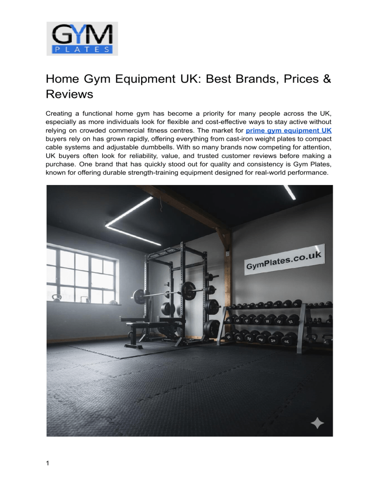 Home Gym Equipment UK: Best Brands, Prices & Reviews Creating a functional home gym has become a priority for many people across the UK, especially as more individuals look for flexible and cost-effective ways to stay active without relying on crowded commercial fitness centres. The market for prime gym equipment UK buyers rely on has grown rapidly, offering everything from cast-iron weight plates to compact cable systems and adjustable dumbbells. With so many brands now competing for attention, UK buyers often look for reliability, value, and trusted customer reviews before making a purchase. One brand that has quickly stood out for quality and consistency is Gym Plates, known for offering durable strength-training equipment designed for real-world performance. 1 Why UK Fitness Enthusiasts Are Investing in Home Gym Equipment Home workouts in the UK have evolved far beyond resistance bands and improvised setups. Many people are now investing in full strength-training kits that allow effective training without monthly membership fees. Having your own equipment at home doesn’t just save time; it provides the freedom to train whenever it suits, whether that’s early in the morning or late at night. Quality equipment has also become more accessible, with specialist retailers providing solid, long-lasting gear at fair prices. What Makes Gym Plates a Leading Choice for UK Shoppers GymPlates.co.uk has become a popular destination for home gym users due to its focus on strength equipment that meets professional standards. The brand is known for offering a wide selection of weight plates, barbells, flooring, and training accessories designed to withstand heavy use. Customers frequently highlight the durability of their plates, noting that the build quality feels similar to what you would expect in a commercial gym. Another reason the brand has gained recognition in the UK is its straightforward pricing, ensuring buyers get premium equipment without inflated costs. Understanding Price Ranges for Home Gym Equipment in the UK The cost of setting up a home gym varies depending on the type and quality of equipment chosen. Basic dumbbells and smaller accessories remain affordable, while Olympic barbells, bumper plates, and racks represent a more serious investment. UK shoppers appreciate brands that strike the right balance between quality and value, and GymPlates.co.uk has positioned itself strongly by offering competitively priced sets that remain accessible even to beginners building their first training space. Many customers find that purchasing a few essential items first and expanding gradually helps them manage costs without compromising on performance. Customer Experiences and Reviews from UK Home Lifters Reviews from UK buyers often highlight how important customer service and delivery reliability are when choosing a home gym brand. GymPlates.co.uk is frequently praised for fast delivery, clear communication, and equipment that arrives in excellent condition. Lifters also comment positively on the accuracy of the weight plates, the grip and feel of the barbells, and the overall durability of the materials. For many, finding a brand that consistently delivers on expectations makes all the difference when choosing equipment they’ll use for years to come. 2 Building the Ideal Home Gym with Premium Equipment Creating the perfect training space at home doesn’t require a huge amount of room. Most UK homeowners and renters start with a barbell, a set of plates, and a stable lifting area. Over time, they add more specialised items such as benches or cable attachments to increase training variety. Investing in high-quality plates and bars from reputable suppliers such as GymPlates.co.uk ensures that your equipment remains dependable as your strength progresses. Durable steel plates, solid rubber bumpers, and well-balanced bars all contribute to a safer and more enjoyable workout environment. Final Thoughts on Choosing the Best Home Gym Equipment in the UK The UK fitness landscape has changed dramatically, and home training continues to rise in popularity. With more people looking to exercise in a convenient and cost-effective way, choosing the right equipment matters more than ever. Reliable brands like GymPlates.co.uk make it easier for beginners and experienced lifters alike to build a home gym that supports long-term progress. Whether you are assembling a full powerlifting setup or simply looking for a quality set of plates to enhance your training routine, investing in well-made equipment ensures your home workouts remain effective, safe, and enjoyable. 3