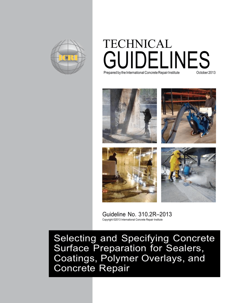 TECHNICAL GUIDELINES Prepared by the International Concrete Repair Institute October 2013 Guideline No. 310.2R–2013 Copyright ©2013 International Concrete Repair Institute Selecting and Specifying Concrete Surface Preparation for Sealers, Coatings, Polymer Overlays, and Concrete Repair TECHNICAL GUIDELINES Prepared by the International Concrete Repair Institute October 2013 Selecting and Specifying Concrete Surface Preparation for Sealers, Coatings, Polymer Overlays, and Concrete Repair Guideline No. 310.2R-2013 Copyright © 2013 International Concrete Repair Institute All rights reserved. International Concrete Repair Institute 10600 West Higgins Road, Suite 607, Rosemont, IL 60018 Phone: 847-827-0830 Fax: 847-827-0832 E-mail: info@icri.org Web: www.icri.org About ICRI Guidelines The International Concrete Repair Institute (ICRI) was founded to improve the durability of concrete repair and enhance its value for structure owners. The identification, development, and promotion of the most promising methods and materials are primary vehicles for accelerating advances in repair technology. Working through a variety of forums, ICRI members have the opportunity to address these issues and to directly contribute to improving the practice of concrete repair. A principal component of this effort is to make carefully selected information on important repair subjects readily accessible to decision makers. During the past several decades, much has been reported in the literature on concrete repair methods and materials as they have been developed and refined. Nevertheless, it has been diffi to fi critically reviewed information on the state of the art condensed into easy-to-use formats. To that end, ICRI guidelines are prepared by sanctioned task groups and approved by the ICRI Technical Activities Committee. Each guideline is designed to address a specifi area of practice recognized as essential to the achievement of durable repairs. All ICRI guideline documents are subject to continual review by the membership and may be revised as approved by the Technical Activities Committee. Technical Activities Committee Kevin A. Michols, Chair James E. McDonald, Secretary Frank Apicella Jorge Costa Andrew S. Fulkerson Fred Goodwin Gabriel A. Jimenez Ralph C. Jones Peter R. Kolf David Rodler Lee Sizemore Aamer Syed David Whitmore Producers of this Guideline ICRI Committee 310, Surface Preparation Andrew S. Fulkerson, Chair Patrick Winkler, Secretary* Randal M. Beard Don Caple Fred Goodwin David G. Karins Kenneth M. Lozen Kevin A. Michols Beth Newbold Jeffery Smith * Subcommittee Chair Synopsis Proper surface preparation is a key element in determining the success of a concrete restoration project. Improper surface preparation may lead to the failure of the protective system or repair material, resulting in further repairs, added expense, and loss of use, and may ultimately compromise the integrity of the structure. Surface preparation is the process by which a sound, clean, and suitably roughened surface is produced on a concrete substrate. Surface preparation includes the removal of laitance, dirt, oil, films, paint, coatings, sound and unsound concrete, and other materials that will interfere with the adhesion or penetration of a sealer, coating, polymer overlay, or repair material. Surface preparation will open the pore structure of the concrete substrate and establish profiles suitable for the application of the specified protective system or repair material. Keywords Abrasive blasting; acid etching; detergent scrubbing; grinding; handheld concrete breakers; high- and ultra-high-pressure water jetting; lowpressure water cleaning; microcracking; needle scaling; rotomilling; scabbling; scarifying; shotblasting; surface preparation; surface profile; surface retarders. This document is intended as a voluntary guideline for the owner, design professional, and concrete repair contractor. It is not intended to relieve the professional engineer or designer of any responsibility for the specification of concrete repair methods, materials, or practices. While we believe the information contained herein represents the proper means to achieve quality results, the International Concrete Repair Institute must disclaim any liability or responsibility to those who may choose to rely on all or any part of this guideline. 310.2R-2013 SELECTING AND SPECIFYING CONCRETE SURFACE PREPARATION FOR SEALERS, COATINGS, POLYMER OVERLAYS, AND CONCRETE REPAIR Contents 1.0 Introduction .................................................................................................................. 1 1.1 Surface Preparation .................................................................................................... 1 1.2 Guideline Tools .............................................................................................................................. 1 2.0 Definitions .................................................................................................................... 1 3.0 Selecting Surface Preparation Method(s) .................................................................... 1 3.1 Project Evaluation ....................................................................................................... 1 3.2 Evaluate Surface Preparation Method(s)........................................................................... 2 3.3 Select and Specify Surface Preparation Method(s) ........................................................... 2 3.4 Quality Control ............................................................................................................ 2 4.0 Mechanics of Concrete Removal ..................................................................................... 2 4.1 Introduction ................................................................................................................. 2 4.2 Cleaning .....................................................................