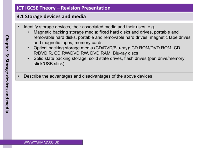ICT IGCSE Theory – Revision Presentation 3.1 Storage devices and media Chapter 3: Storage devices and media • Identify storage devices, their associated media and their uses, e.g. • Magnetic backing storage media: fixed hard disks and drives, portable and removable hard disks, portable and removable hard drives, magnetic tape drives and magnetic tapes, memory cards • Optical backing storage media (CD/DVD/Blu-ray): CD ROM/DVD ROM, CD R/DVD R, CD RW/DVD RW, DVD RAM, Blu-ray discs • Solid state backing storage: solid state drives, flash drives (pen drive/memory stick/USB stick) • Describe the advantages and disadvantages of the above devices WWW.YAHMAD.CO.UK ICT IGCSE Theory – Revision Presentation 3.1 Storage devices and media What is Storage Chapter 3: Storage devices and media • Secondary Storage devices ensures data is stored permanently so that it can be used again at a later date. • Storage medium is the name given to the device that actually holds the data. • Sometimes the storage medium is fixed i.e. magnetic coated disks build into hard drive. • Sometimes the storage medium is removable from the device i.e. CD ROM that can be taken out of the drive. Think about what we store: Documents, Images, Video, Music, Software, Games etc. WWW.YAHMAD.CO.UK ICT IGCSE Theory – Revision Presentation 3.1 Storage devices and media File Sizes Chapter 3: Storage devices and media Storage devices or files sizes are measured in: Kilobytes (KB), Megabytes (MB), Gigabytes (GB) and Terabytes (TB) 1 KB 1000 Bytes * 1000 1 MB 1000 KB * 1000 1000 MB 1 GB * 1000 1 TB WWW.YAHMAD.CO.UK 1000 GB Diagram not to scale ICT IGCSE Theory – Revision Presentation 3.1 Storage devices and media Data Storage Capacity Chapter 3: Storage devices and media Floppy Disk 1.4MB CD-ROM 700MB DVD 4.7GB Data storage devices have very different capacities. Over time the capacity has increased which has allowed for more data to be stored: Blu-Ray 25 GB – 128GB Increase in storage capacity Hard Drive 8 TB Magnetic Tape Up to 185 TB WWW.YAHMAD.CO.UK ICT IGCSE Theory – Revision Presentation 3.1 Storage devices and media Type of Access Chapter 3: Storage devices and media Serial (sequential Access) • • • Start 1 2 Files are stored one by one in a sequence Must search through the files one by one until you get to the one you want. Example: VHS tape, Cassette Tape, Magnetic Tape 3 4 5 6 7 8 9 End 10 Direct (Random Access) • • • Start 1 2 Stores files so that they can instantly be accessed No need to search through files to get to the one you want Example: DVD, CD ROM, Blu-ray, external hard drive, flash drive 3 WWW.YAHMAD.CO.UK 4 5 6 7 8 9 End 10 ICT IGCSE Theory – Revision Presentation 3.1 Storage devices and media Main Memory Vs Backing Storage Chapter 3: Storage devices and media Main Memory • • • • • Sometimes known as Internal Memory or primary memory. Includes RAM and ROM Usually used to store data temporarily (in the case of RAM). Usually used to store data while it is being processed by the CPU. Is volatile – means data will be lost if computer is turned of. Backing Storage • Backing storage some known as secondary storage. • Name for all other storage devices which are part of a computer like hard drive. • Usually used to store data over a long time. • Usually used to store application software, operating system software, files etc. • Is Non-volatile - Means data will not be lost of computer is turned off. WWW.YAHMAD.CO.UK ICT IGCSE Theory – Revision Presentation 3.1 Storage devices and media Fixed Internal Hard Drive Magnetic Storage Devices Chapter 3: Storage devices and media Use: Main backing storage device used by all computers to store: • Operating Systems & System Files • Applications • Files (Documents, Images, videos, audio etc.) Access Type: Direct (Random Access) Advantages: Disadvantages • Less likely to break as fixed. • High storage capacities compared to external drives. • Fast data transfer rate. • More moving parts compared to solid state drives. • Incorrect shut down procedure could cause hard drive to malfunction. WWW.YAHMAD.CO.UK • Magnetic storage media devices store data in the form of tiny magnetised dots. • These dots are created, read and erased using magnetic fields created by very tiny electromagnets. ICT IGCSE Theory – Revision Presentation 3.1 Storage devices and media Magnetic Storage Devices Chapter 3: Storage devices and media Use: Portable Hard Drive This device connects to the computer using the USB Port. External Hard drives are used to store: • Personal backup data. • Transfer files between computers/devices Access Type: Direct (Random Access) Advantages: Disadvantages • Portable – transfer files between computers. • High Storage capacity compared to optical disks. • More prone to errors than fixed hard drive. • Could be damaged if incorrectly ejected from computer. WWW.YAHMAD.CO.UK • Magnetic storage media devices store data in the form of tiny magnetised dots. • These dots are created, read and erased using magnetic fields created by very tiny electromagnets. ICT IGCSE Theory – Revision Presentation 3.1 Storage devices and media Magnetic Storage Devices Chapter 3: Storage devices and media Use: Magnetic Tapes • Large organisations make daily backups of their networks on to Magnetic Tapes • Long-term archiving of data. Access Type: Serial Advantages: • Huge storage capacity compared to fixed and portable hard drives. • Stored away in a fire proof safe. • Robust – last for long time WWW.YAHMAD.CO.UK • Magnetic storage media devices store data in the form of tiny magnetised dots. • These dots are created, read and erased using magnetic fields created by very tiny electromagnets. Disadvantages • Slower Access Tape reader has to start at the beginning of the tape and continue fast forwarding until it gets to the piece of data that needed. ICT IGCSE Theory – Revision Pres