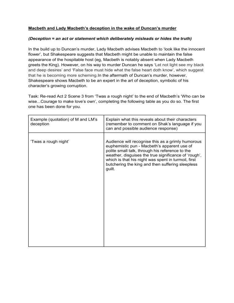 Macbeth and Lady Macbeth’s deception in the wake of Duncan’s murder (Deception = an act or statement which deliberately misleads or hides the truth) In the build up to Duncan’s murder, Lady Macbeth advises Macbeth to ‘look like the innocent flower’, but Shakespeare suggests that Macbeth might be unable to maintain the false appearance of the hospitable host (eg, Macbeth is notably absent when Lady Macbeth greets the King). However, on his way to murder Duncan he says ‘Let not light see my black and deep desires’ and ‘False face must hide what the false heart doth know’, which suggest that he is becoming more scheming.In the aftermath of Duncan’s murder, however, Shakespeare shows Macbeth to be an expert in the art of deception, symbolic of his character’s growing corruption. Task: Re-read Act 2 Scene 3 from ‘Twas a rough night’ to the end of Macbeth’s ‘Who can be wise...Courage to make love’s own’, completing the following table as you do so. The first one has been done for you. Example (quotation) of M and LM’s deception Explain what this reveals about their characters (remember to comment on Shak’s language if you can and possible audience response) ‘Twas a rough night’ Audience will recognise this as a grimly humorous euphemistic pun - Macbeth’s apparent use of polite small talk, through his reference to the weather, disguises the true significance of ‘rough’, which is that his night was spent in turmoil, first butchering the king and then suffering sleepless guilt. Example (quotation) of M and LM’s deception Explain what this reveals about their characters (remember to comment on Shak’s language if you can and possible audience response)