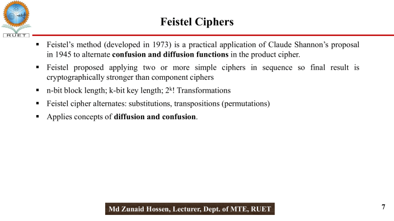 Feistel Ciphers ▪ Feistel’s method (developed in 1973) is a practical application of Claude Shannon’s proposal in 1945 to alternate confusion and diffusion functions in the product cipher. ▪ Feistel proposed applying two or more simple ciphers in sequence so final result is cryptographically stronger than component ciphers ▪ n-bit block length; k-bit key length; 2k! Transformations ▪ Feistel cipher alternates: substitutions, transpositions (permutations) ▪ Applies concepts of diffusion and confusion. Md Zunaid Hossen, Lecturer, Dept. of MTE, RUET 7 Substitutions Vs Transpositions (Permutations) ▪ Substitution: Each plaintext element or group of elements is uniquely replaced by a corresponding cipher text element or group of elements. ▪ Permutation: A sequence of plaintext elements is replaced by a permutation of that sequence. That is, no elements are added or deleted or replaced in the sequence, rather the order in which the elements appear in the sequence is changed Md Zunaid Hossen, Lecturer, Dept. of MTE, RUET 8 Feistel Encryption and Decryption ▪ Substitution: Each plaintext element or group of elements is uniquely replaced by a corresponding cipher text element or group of elements. ▪ Permutation: A sequence of plaintext elements is replaced by a permutation of that sequence. That is, no elements are added or deleted or replaced in the sequence, rather the order in which the elements appear in the sequence is changed Md Zunaid Hossen, Lecturer, Dept. of MTE, RUET 9 Feistel Encryption Step 01: Plaintext block of length 2n bits and a key K. The plaintext block is divided into two halves, L0 and R0. Step 02: Each round i has as inputs Li-1 and Ri-1 derived from the previous round, as well as a subkey Ki derived from the overall K. Step 03: A round function F to the right half of the data and then taking the exclusive-OR of the output of that function and the left half of the data. Step 04: The round function has the same general structure for each round but is parameterized by the round subkey K i. Step 05: A permutation is performed that consists of the interchange of the two halves of the data. Figure 04: Feistel Encryption Md Zunaid Hossen, Lecturer, Dept. of MTE, RUET 10 Feistel Encryption Design Features… ▪ Block size • Larger block sizes mean greater security (all other things being equal) but reduced encryption/decryption speed for a given algorithm. • The greater security is achieved by greater diffusion. • Traditionally, a block size of 64 bits has been considered a reasonable tradeoff and was nearly universal in block cipher design. • However, the new AES uses a 128-bit block size. ▪ Key size • Larger key size means greater security but may decrease encryption/ decryption speed. • The greater security is achieved by greater resistance to brute-force attacks and greater confusion. • Key sizes of 64 bits or less are now widely considered as inadequate, and 128 bits has become a common size. Md Zunaid Hossen, Lecturer, Dept. of MTE, RUET 11 Feistel Encryption Design Features… ▪ Number of rounds • The essence of the Feistel cipher is that a single round offers inadequate security but that multiple rounds offer increasing security. • A typical size is 16 rounds. ▪ Subkey generation algorithm • Greater complexity in this algorithm should lead to greater difficulty of cryptanalysis. ▪ Round function F • Again, greater complexity generally means greater resistance to cryptanalysis. ▪ Fast software encryption/decryption • In many cases, encryption is embedded in applications or utility functions in such a way as to preclude a hardware implementation. • Accordingly, the speed of execution of the algorithm becomes a concern. Md Zunaid Hossen, Lecturer, Dept. of MTE, RUET 12 Feistel Encryption Design Features… ▪ Ease of analysis • Although we would like to make our algorithm as difficult as possible to cryptanalyze, there is great benefit in making the algorithm easy to analyze. • That is, if the algorithm can be concisely and clearly explained, it is easier to analyze that algorithm for cryptanalytic vulnerabilities and therefore develop a higher level of assurance as to its strength. • DES, for example, does not have an easily analyzed functionality. Md Zunaid Hossen, Lecturer, Dept. of MTE, RUET 13 Feistel Decryption ▪ The process of decryption with a Feistel cipher is essentially the same as the encryption process. ▪ Use the cipher text as input to the algorithm, but use the sub keys Ki in reverse order. ▪ Use Kn in the first round, Kn-1 in the second round, and so on, until K1 is used in the last round. Figure 05: Feistel decryption Md Zunaid Hossen, Lecturer, Dept. of MTE, RUET 14 Feistel Encryption and Decryption Md Zunaid Hossen, Lecturer, Dept. of MTE, RUET 15