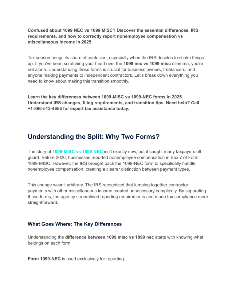 Confused about 1099 NEC vs 1099 MISC? Discover the essential differences, IRS requirements, and how to correctly report nonemployee compensation vs miscellaneous income in 2025. Tax season brings its share of confusion, especially when the IRS decides to shake things up. If you've been scratching your head over the 1099 nec vs 1099 misc dilemma, you're not alone. Understanding these forms is crucial for business owners, freelancers, and anyone making payments to independent contractors. Let's break down everything you need to know about making this transition smoothly. Learn the key differences between 1099-MISC vs 1099-NEC forms in 2025. Understand IRS changes, filing requirements, and transition tips. Need help? Call +1-866-513-4656 for expert tax assistance today. Understanding the Split: Why Two Forms? The story of 1099-MISC vs 1099-NEC isn't exactly new, but it caught many taxpayers off guard. Before 2020, businesses reported nonemployee compensation in Box 7 of Form 1099-MISC. However, the IRS brought back the 1099-NEC form to specifically handle nonemployee compensation, creating a clearer distinction between payment types. This change wasn't arbitrary. The IRS recognized that lumping together contractor payments with other miscellaneous income created unnecessary complexity. By separating these forms, the agency streamlined reporting requirements and made tax compliance more straightforward. What Goes Where: The Key Differences Understanding the difference between 1099 misc vs 1099 nec starts with knowing what belongs on each form. Form 1099-NEC is used exclusively for reporting: ● Payments of $600 or more to independent contractors ● Nonemployee compensation for services performed ● Fees paid to attorneys (in most cases) ● Commissions and professional service payments Form 1099-MISC now covers: ● Rent payments exceeding $600 ● Royalties ● Prize and award money ● Medical and healthcare payments ● Crop insurance proceeds ● Other miscellaneous income categories The 1099 misc vs 1099 nec vs 1099 k comparison adds another layer. Form 1099-K specifically tracks payment card and third-party network transactions, which is an entirely different reporting category. Filing Deadlines: A Critical Distinction Here's where things get important. The 1099 nec vs 1099 misc 2024 filing requirements include different deadlines. Form 1099-NEC must be filed by January 31st, whether you're submitting paper or electronic versions. This earlier deadline ensures the IRS can match contractor income during tax season. Form 1099-MISC has more flexibility, with a February 28th deadline for paper filing and March 31st for electronic submissions (though some boxes require January 31st filing). Need assistance navigating these deadlines? Contact the experts at +1-866-513-4656 for personalized guidance. Making the Transition: Practical Steps Transitioning between these forms doesn't have to be overwhelming. Here's your roadmap: 1. Review Your Payment Records Categorize all payments made to independent contractors and service providers. Separate genuine contractor payments from other miscellaneous income types. 2. Update Your Accounting Software Most modern platforms now distinguish between these forms automatically. Ensure your system reflects current 1099 nec instructions and 1099 misc instructions from the IRS. 3. Verify Recipient Information Collect accurate W-9 forms from all contractors. Incorrect taxpayer identification numbers can trigger IRS penalties. 4. Choose Your Filing Method Electronic filing through the IRS FIRE system is mandatory if you're submitting 250 or more forms. Smaller volumes can be filed on paper using the official 1099 misc vs 1099 nec pdf forms available on IRS.gov. 5. Meet the Deadlines Mark your calendar for January 31st (1099-NEC) and understand which 1099-MISC boxes require early filing. Special Considerations for Different Industries The 1099 misc vs 1099 nec for attorneys situation deserves special attention. Attorney fees generally belong on Form 1099-NEC unless they're related to specific scenarios outlined in 1099 misc irs guidance. Legal settlements might require both forms depending on the payment breakdown. Whether you're using the 1099 misc vs 1099 nec calculator or processing forms manually, understanding these industry-specific nuances prevents costly mistakes. Also Read This: https://segisocial.com/how-to-report-1099-misc-vs-1099-nec-on-your-tax-return-2025/ Common Questions About Tax Rates Many people wonder about the 1099 misc vs 1099 nec tax rate. Here's the truth: the tax rates themselves don't change based on which form you receive. Both forms report income that's subject to self-employment tax and regular income tax. The form type simply helps the IRS categorize the income source. If you're using 1099 misc vs 1099 nec copyright or similar software, the program will calculate your tax liability regardless of which form reported your income. Resources and Support The irs form 1099 misc vs 1099 nec documentation provides comprehensive details, but sometimes you need a human touch. Whether you're determining when to use a 1099 misc vs 1099 nec or figuring out who gets a 1099 misc vs 1099 nec, professional assistance saves time and reduces errors. For immediate help understanding what goes on 1099 misc vs 1099 nec, call +1-866-513-4656 to speak with tax professionals who can clarify your specific situation. Conclusion Mastering the transition from 1099-MISC to 1099-NEC doesn't require a degree in taxation—just clear information and attention to detail. By understanding which payments belong on each form and meeting the appropriate deadlines, you'll navigate tax season with confidence. Remember, the form 1099 misc vs 1099 nec distinction exists to make your life easier, not harder. Frequently Asked Questions Q: When should I use 1099-NEC instead of 1099-MISC? A: Use Form 1099-NEC when paying $600 or more to independent contractors for services. U