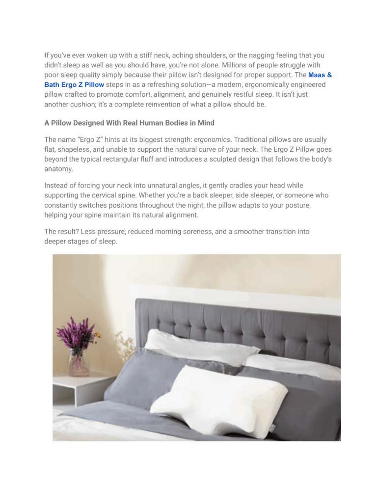 If you’ve ever woken up with a stiff neck, aching shoulders, or the nagging feeling that you didn’t sleep as well as you should have, you’re not alone. Millions of people struggle with poor sleep quality simply because their pillow isn’t designed for proper support. The Maas & Bath Ergo Z Pillow steps in as a refreshing solution—a modern, ergonomically engineered pillow crafted to promote comfort, alignment, and genuinely restful sleep. It isn’t just another cushion; it’s a complete reinvention of what a pillow should be. A Pillow Designed With Real Human Bodies in Mind The name “Ergo Z” hints at its biggest strength: ergonomics. Traditional pillows are usually flat, shapeless, and unable to support the natural curve of your neck. The Ergo Z Pillow goes beyond the typical rectangular fluff and introduces a sculpted design that follows the body’s anatomy. Instead of forcing your neck into unnatural angles, it gently cradles your head while supporting the cervical spine. Whether you’re a back sleeper, side sleeper, or someone who constantly switches positions throughout the night, the pillow adapts to your posture, helping your spine maintain its natural alignment. The result? Less pressure, reduced morning soreness, and a smoother transition into deeper stages of sleep. Official Website- https://www.onehealthgiant.com/ergo-z-pillow-reviews/ Adaptive Memory Foam for Personalized Comfort One of the standout features of the Maas And Bath Ergo Z Pillow Reviews is its adaptive memory foam composition. Unlike ordinary foam that compresses too quickly or feels too firm, this version responds slowly and intelligently to weight and temperature. The moment your head rests on it, the foam begins to contour, distributing pressure evenly so your muscles can relax completely. The foam is engineered to offer medium firmness—soft enough to feel plush, but supportive enough to prevent your head from sinking too deeply. This balance is crucial because too-soft pillows cause spinal misalignment, while too-hard ones create tension. The Ergo Z Pillow intentionally sits at this perfect equilibrium point. Cooling Technology for Sweat-Free Nights If overheating at night is something you struggle with, the Ergo Z Pillow addresses that issue too. Many users don’t realize that heat retention is a major reason they toss and turn. To counter this, the pillow integrates ventilation channels within the foam and a breathable outer cover that encourages airflow. This cooling system prevents heat buildup, ensuring the pillow stays comfortable even during warm seasons. Instead of waking up soaked or flipping your pillow again and again to reach the “cool side,” you get consistent temperature regulation throughout the night. Support for Every Sleeping Position The versatility of the Ergo Z Pillow makes it especially appealing. Here’s how it benefits different types of sleepers: ✔ Side Sleepers The contoured edges elevate the head just enough to keep the neck aligned with the spine. This reduces pressure on the shoulders and prevents the “crunched” feeling that causes numbness or stiffness. ✔ Back Sleepers The central cavity supports the natural curve of the neck, promoting healthier breathing patterns and reducing the likelihood of waking up with strained muscles. ✔ Combination Sleepers Since the pillow maintains its shape and offers consistent support no matter the angle, it accommodates shifting positions without forcing you to readjust it constantly. Facebook https://www.facebook.com/ErgoZPillowBenefits/ https://www.facebook.com/groups/maasandbathergozpillowbuy https://www.facebook.com/groups/ergozpillowamazon https://www.facebook.com/groups/ergozpillowofficialwebsite https://www.facebook.com/groups/maasandbathergozpillowreviewsbuy https://www.facebook.com/groups/ergozpillowdiscountcode https://www.facebook.com/groups/ergozpillowexperience Hypoallergenic and Skin-Friendly Anyone with sensitive skin or allergies understands how important pillow materials are. The Ergo Z Pillow features a hypoallergenic, washable cover that resists dust mites, allergens, and bacteria. This not only contributes to a cleaner sleep environment but also prevents irritation for people with breathing sensitivities or skin concerns. Its smooth fabric feels gentle on the skin and enhances the luxurious experience of laying down after a long day. Durability That Outlasts Ordinary Pillows Cheap pillows flatten within months, losing their structure and support. The memory foam in the Ergo Z Pillow is built for long-term use. It’s resilient, retains its contouring ability, and doesn’t clump or sag. Even after nightly use, it bounces back to its original shape. This makes the pillow a solid long-term investment—not just a temporary sleeping accessory. Instead of buying new pillows every few months, the Ergo Z saves you money and offers consistent comfort for the long run. Reduces Neck Pain, Snoring, and Daily Fatigue The benefits of proper spinal alignment reach far beyond just feeling comfortable. The Ergo Z Pillow Amazon may also help with: ● Neck and shoulder pain relief Because it supports the cervical spine, tension is reduced. ● Better breathing and reduced snoring A properly aligned airway encourages smoother airflow. ● Improved focus and energy levels during the day Higher-quality sleep directly enhances daytime performance. ● Less tossing and turning Ergonomic support reduces the need to constantly shift positions. These improvements stack together to create a more restorative sleep cycle, leaving you feeling refreshed rather than drained when you wake up. Modern Aesthetics with Practicality The Ergo Z Pillow doesn’t just feel good—it looks sleek and modern. Its sculpted shape, textured cover, and minimalist design make it a stylish addition to any bedroom. Even with its contemporary appearance, it remains practical and easy to maintain. The removable cover zips off effortlessly, and 