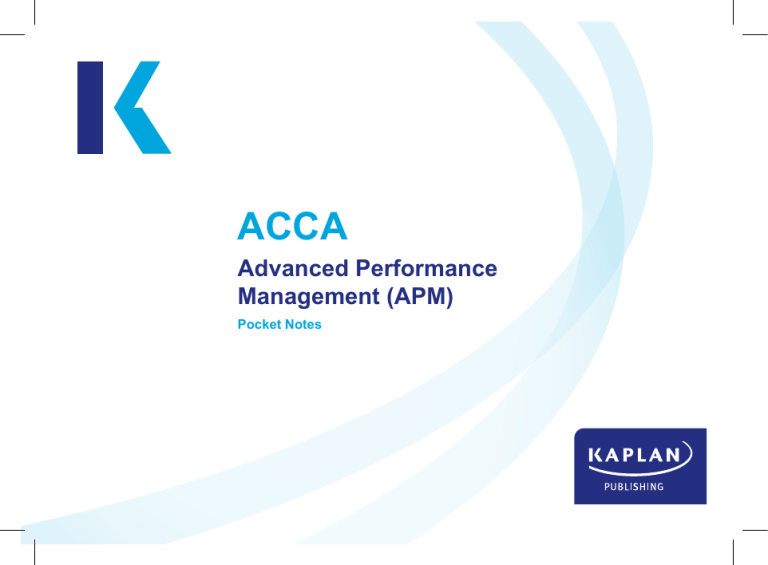 ACCA Advanced Performance Management (APM) Pocket Notes Advanced Performance Management (APM) British library cataloguing-in-publication data A catalogue record for this book is available from the British Library. Published by: Kaplan Publishing UK Unit 2 The Business Centre Molly Millars Lane Wokingham Berkshire RG41 2QZ ISBN 978-1-83996-724-5 © Kaplan Financial Limited, 2024 Printed and bound in Great Britain. P.2 The text in this material and any others made available by any Kaplan Group company does not amount to advice on a particular matter and should not be taken as such. No reliance should be placed on the content as the basis for any investment or other decision or in connection with any advice given to third parties. Please consult your appropriate professional adviser as necessary. Kaplan Publishing Limited and all other Kaplan group companies expressly disclaim all liability to any person in respect of any losses or other claims, whether direct, indirect, incidental, consequential or otherwise arising in relation to the use of such materials. All rights reserved. No part of this publication may be reproduced, stored in a retrieval system, or transmitted, in any form or by any means, electronic, mechanical, photocopying, recording or otherwise, without the prior written permission of Kaplan Publishing. KAPLAN PUBLISHING Advanced Performance Management (APM) Acknowledgments: This product contains material that is ©Financial Reporting Council Ltd (FRC). Adapted and reproduced with the kind permission of the Financial Reporting Council. All rights reserved. For further information, please visit www.frc.org.uk or call +44 (0)20 7492 2300. KAPLAN PUBLISHING P.3 Advanced Performance Management (APM) Contents Chapter 1: Introduction to performance management.................................................................... 1 Chapter 2: Strategy and performance........................................................................................... 11 Chapter 3: Managing risk and uncertainty.................................................................................... 23 Chapter 4: Environmental, social and governance factors........................................................... 29 Chapter 5: Budgeting and control.................................................................................................47 Chapter 6: Business structure and performance management.................................................... 63 Chapter 7: Information systems and developments in technology .............................................. 79 Chapter 8: Performance reports for management ....................................................................... 99 Chapter 9: Human resource aspects of performance management .......................................... 107 Chapter 10: Financial performance measures in the private sector ............................................ 121 Chapter 11: Divisional performance appraisal and transfer pricing ............................................. 133 Chapter 12: Performance management in not-for-profit organisations......................................... 149 Chapter 13: Non-financial performance indicators........................................................................ 159 Chapter 14: The role of quality in performance measurement..................................................... 171 Index P.4 .....................................................................................................................................I.1 KAPLAN PUBLISHING Advanced Performance Management (APM) Introduction to the syllabus The aim of this paper is to apply relevant knowledge and skills and to exercise professional judgement in selecting and applying strategic management accounting techniques in different business contexts, to contribute to the planning, control and evaluation of the performance of an organisation and its strategic and operational development. Strong underpinning knowledge is required from Performance Measurement (PM). APM is a step up from PM and focuses on interpretation and application of the topics. APM builds on knowledge gained in Performance Management (PM). It develops key aspects introduced at the PM level with a greater focus on linking the syllabus topics together and evaluation of the key topics and techniques. Assumed knowledge from PM • Risk • Environmental management accounting (EMA) • Alternative budgeting methods • Absorption costing and activity-based costing (ABC) • Beyond budgeting • Standard costing and variances • Forecasting • Information and data KAPLAN PUBLISHING P.5 Advanced Performance Management (APM) • Big data • Data analytics • Management information systems (MIS) • Financial performance measures • Divisional performance measures • Transfer pricing • Not-for-profit organisations • Non-financial performance indicators • Balanced scorecard • Building Block model APM also includes knowledge contained in the Strategic Business Leader (SBL) exam but it is not a problem if you are yet to study for this exam and there is no expectation that you will have any SBL knowledge in place. It is important to draw a distinction between the two exams. You need to approach the common topics from an APM perspective, i.e. how do they influence performance management and measurement. P.6 KAPLAN PUBLISHING Advanced Performance Management (APM) Main capabilities On successful completion of this exam, candidates should be able to: A Use stategic planning and control models to plan and monitor organisational performance B Identify and evaluate the design features of effective performance management information and monitoring systems and recognise the impact of developments in technology on performance measurement and management systems C Apply appropriate strategic performance measurement techniques in evaluating and improving organisational performance D Advise clients and senior