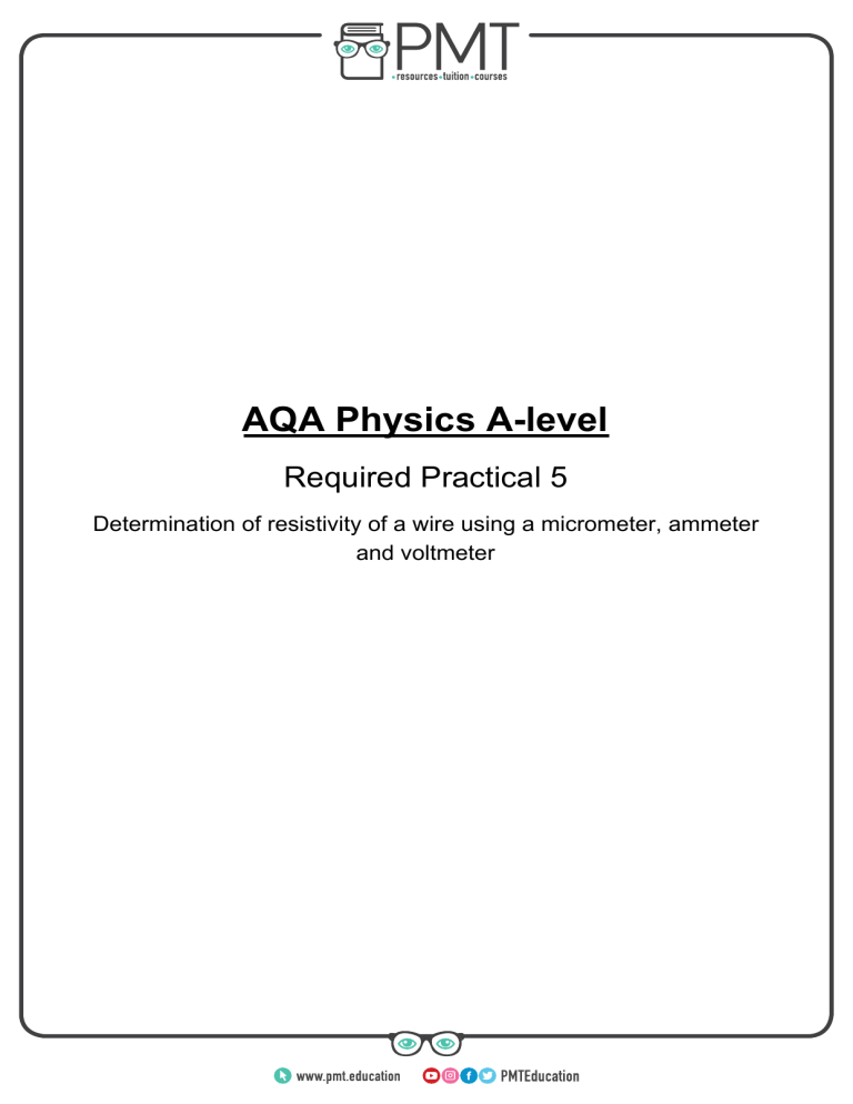 AQA Physics A-level Required Practical 5 Determination of resistivity of a wire using a micrometer, ammeter and voltmeter www.pmt.education ● ● ● ● ● Equipment: ○ 1m long constantan wire ○ Voltmeter ○ Ammeter ○ Low voltage power supply ○ Micrometer ○ Metre ruler Method: ○ Measure the diameter d of the constantan wire at various points along it using the micrometer and find and record the mean diameter. ○ Set up the apparatus as shown in the diagram. ○ Adjust the length l to 0.100m using the crocodile clips, measured using the metre ruler. ○ Read and record the current I on the ammeter and the voltage V on the voltmeter. Calculate the resistance R by using R=V/I and record this. ○ Increase l by 0.100m and repeat this, increasing it by 0.100m each time up to 0.800m. ○ Repeat the experiment twice more and find and record the mean R for each l. Graphs and calculations: 2 ○ Calculate the cross-sectional area A of the wire by A = πd4 ○ Plot a graph of the mean value of R against l and draw a line of best fit. The resistivity will be the gradient multiplied by the cross-sectional area of the wire. ○ ρ = RA l = GA where G is the gradient. Safety: ○ Disconnect the crocodile clips in between measurements to avoid the wire heating up and causing burns if touched. If the current rises too high, reduce the voltage using the variable power supply. ○ If the wire is tight, safety goggles should be worn in case it snaps and injures eyes. Improvements and notes: ○ The wire heating up might additionally cause the resistance of the wire to change, affecting measurements. To reduce this, disconnect it in between measurements or reduce the voltage of the supply so the current is lower. ○ The wire should be free from kinks and held straight so the measurement of the length is as accurate as possible. www.pmt.education