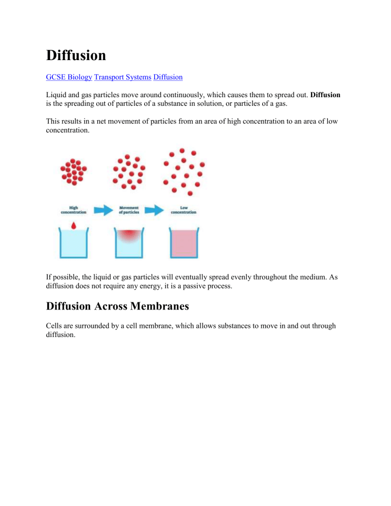 Diffusion GCSE Biology Transport Systems Diffusion Liquid and gas particles move around continuously, which causes them to spread out. Diffusion is the spreading out of particles of a substance in solution, or particles of a gas. This results in a net movement of particles from an area of high concentration to an area of low concentration. If possible, the liquid or gas particles will eventually spread evenly throughout the medium. As diffusion does not require any energy, it is a passive process. Diffusion Across Membranes Cells are surrounded by a cell membrane, which allows substances to move in and out through diffusion. Substances such as carbon dioxide, oxygen, water, food and waste can be transported across the cell membrane by diffusion. Cells must take in useful substances and remove waste substances for the cell to function. Example Cells need oxygen for respiration, which takes place in the mitochondria. When we inhale oxygen, it enters our lungs and reaches the alveoli. Oxygen diffuses across the barrier between the alveoli and the surrounding capillaries. Carbon dioxide diffuses from the blood to the alveoli, where it is exhaled. Cells are exposed to a high concentration of oxygen, as it is constantly transported by the bloodstream from the lungs. Since there’s a higher concentration of oxygen outside the cell than inside, a concentration gradient is established. Therefore, oxygen passes across the membrane and into the cell by diffusion. Oxygen is used for respiration in the cell, producing carbon dioxide (CO2) as a waste product, which then diffuses out of the cell.