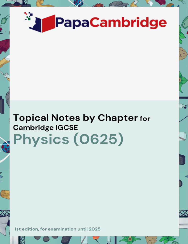 Topical Notes by Chapter for Cambridge IGCSE Physics (0625) 1st edition, for examination until 2025 © r/IGCSE Resources 2024 Chapter 1 : Motion, Forces And Energy *motion physical quantities and techniques measurement Rulers and measuring cylinders are for length and Falling object W/O air resistance unit time volume Velocity is speed in a given direction measuring a variety of time intervals using clocks Average speed and timer digital Average Value of sum : all values per unit time number of values SCALAR quantities that · only magnitude have Eg : , , , , Velocity ~ both its speed and the direction Eg force weight acceleration : , , , . and gravitational field strength necessary to mention , the resultant force of two vectors at right angles graphically draw N find angle using N , 4 resultant > 5 M/52 forces > 50 N ~= on graph draw resultant 52 + 52 SOH CAH TOA , T Pythagoras 5m/s2 time acceleration : . A deceleration is negative acceleration and use this in calculations Acceleration of free fall g for object near to the surface of the earth is approximately constant an and is approx constant and is 9 8 m/52 . for force and use a weight density Density is p weight is the effect of a gravitational field Weight W = Mass x MG . 9 Wm = = Gravitational field mass fall : This is a density in solids. Regular solid irregular solid * W g strength is force per unit equivalent to acceleration of free . Weights density V-volume How to determine . Gravitational field strength M= = · measure length , width , place object into a measuring · height 3 multiply to find Cup till it is submerged in volgume water, the increase in water . Place object on balance . to find its mass volume is the volume. · (and mass) can be compared . balance using volume m = mass . - mass per unit = Where p . strength on mass . , : mass Itenoughtobalancedownwardright protracter for angle object at rest relative to the observer. Weight a gravitational force on an object that has , Vector , measure length of the quantity of matter in an a measure as air resistance increases = S Mass initially the upward air resistance isn't high meaning there is unbalanced forces speed-gradient of distance-time & mass and accelerating . momentum electric field strength Calculation . - gradient of speed-time of object forces are balanced * distance travelled= area under the the object now falls at constant called Terminal Velocity speed . speed-time graph · is also vector because it is > speed of falling object decelerating e speed ↳ rest , The force of air resistance increases with n line= gravitational field objects . experience weight and friction increasing constan decrease · quantities that have both magnitude and direction · =A Falling object with air resistance In uniform velocity speed. time VECTORS . · higher af distance is also scalar as it has no direction Speed time mass energy and temperature · steeper rate total time taken speed . · ↑ a object falls with same acceleration, speed of falling object increases at a steady total distance travelled = Acceleration is change in Period of oscillation- time taken/number of swings · & speed is distance travelled per * p = Place object on a balance · M to find mass · p = m Which object floats ? any object with a density lower than that of liquid . will float above the liquid If liquid doesn't mix, does it float ? lower density liquids float on denser liquids if not mixed - . Chapter 1 : Motion, Forces And Energy Chapter 1 : Motion, Forces And Energy useful energy out total energy in wasted energy wasted energy Chapter 2 : Thermal Physics Chapter 2 : Thermal Physics Chapter 3 : Waves Chapter 3 : Waves Chapter 3 : Waves Chapter 4 : Electricity & Magnetism Chapter 4 : Electricity & Magnetism Chapter 4 : Electricity & Magnetism Chapter 4 : Electricity & Magnetism Chapter 5 : Nuclear Physics Chapter 5 : Nuclear Physics Chapter 6 : Space Physics Chapter 6 : Space Physics