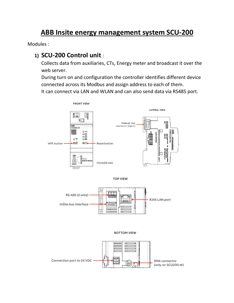ABB Insite energy management system SCU-200 Modules : 1) SCU-200 Control unit : Collects data from auxiliaries, CTs, Energy meter and broadcast it over the web server. During turn on and configuration the controller identifies different device connected across its Modbus and assign address to each of them. It can connect via LAN and WLAN and can also send data via RS485 port. 2) INS-E3 : It is the Energy metering module which can measure the 3 phase energy of the incomer. 3 CT’s are need to measure 3 phase power. 3) INS-PS-1 : Power supply for the control unit and other devices. 4) Auxiliary contact : It keeps a track of the on/off/tripping condition of the breaker. Testing condition: Following picture shows the devices used during testing: Features identified after testing General features: Load consumption monitoring (*load monitoring couldn’t be performed during testing due to unavailability of ABB measuring CTs) Circuit condition monitoring (on/off/tripped) Cost estimation for energy consumption Logging data and data representation in graphical format Details of the web interface identified during testing: Login page of the web server.
