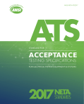 ANSI/NETA ATS-2017 STANDARD FOR ACCEPTANCE TESTING SPECIFICATIONS FOR ELECTRICAL POWER EQUIPMENT & SYSTEMS ANSI/NETA ATS-2017 AMERICAN NATIONAL STANDARD STANDARD FOR ACCEPTANCE TESTING SPECIFICATIONS for Electrical Power Equipment and Systems Secretariat InterNational Electrical Testing Association American National Standards Institute – This page intentionally left blank – ANSI/NETA ATS-2017 American National Standard Approval of an American National Standard requires verification by ANSI that the requirements for due process, consensus, and other criteria for approval have been met by the standards developer. Consensus is established when, in the judgment of the ANSI Board of Standards Review, substantial agreement has been reached by directly and materially affected interests. Substantial agreement means much more than a simple majority, but not necessarily unanimity. Consensus requires that all views and objections be considered, and that a concerted effort be made toward their resolution. The use of American National Standards is completely voluntary; their existence does not in any respect preclude anyone, whether he has approved the standards or not, from manufacturing, marketing, purchasing, or using products, processes, or procedures not conforming to the standards. The American National Standards Institute does not develop standards and will in no circumstances give an interpretation of any American National Standard in the name of the American National Standards Institute. Requests for interpretations should be addressed to the secretariat or sponsor whose name appears on the title page of this standard. Caution Notice: This American National Standard may be revised or withdrawn at any time. The procedures of the American National Standards Institute require that action be taken periodically to reaffirm, revise, or withdraw this standard. Purchasers of American National Standards may receive current information on all standards by calling or writing the American National Standards Institute. Published by InterNational Electrical Testing Association 3050 Old Centre Ave., Suite 102 Portage, MI 49024 269.488.6382· FAX 269.488.6383 www.netaworld.org neta@netaworld.org Melissa Richard - Executive Director Copyright© 2017 InterNational Electrical Testing Association All rights reserved Printed in the United States of America No part of this publication may be reproduced in any form, in an electronic retrieval system or otherwise, without the prior written permission of the publisher. ANSI/NETA ATS-2017 Copyright Information and Alteration of Content ANSI/NETA Standard for Acceptance Testing Specifications for Electrical Power Equipment and Systems, 2017 edition, (ANSI/NETA ATS-2017) is protected under the copyright laws of the United States, and all rights are reserved. Further, the ANSI/NETA ATS-2017 may not be copied, modified, sold, or used except in accordance with such laws and as follows: Purchasers may reproduce and use all or a portion of the ANSI/NETA ATS-2017 provided ANSI/NETA Standard for Acceptance Testing Specifications for Electrical Power Equipment and Systems are clearly identified in writing as the source of all such uses or reproductions. Section 7 of the ANSI/NETA Standard for Acceptance Testing Specifications for Electrical Power Equipment and Systems may be reproduced and used on a “cut and paste” basis for the particular type of equipment to be tested. The following sections of the ANSI/NETA Standard for Acceptance Testing Specifications for Electrical Power Equipment and Systems must be incorporated by reference as part of any subsection: 3. 4. 5. Qualifications of Testing Organization and Personnel 3.1 Testing Organization 3.2 Testing Personnel Division of Responsibility 4.1 The Owner’s Representative 4.2 The Testing Organization General 5.1 Safety and Precautions 5.2 Suitability of Test Equipment 5.3 Test Instrument Calibration 5.4 Test Report 5.5 Test Decal The purchaser is required to include the above sections with any section(s) of 7. © Copyright 2017 InterNational Electrical Testing Association 3050 Old Centre Avenue, Suite 102 Portage, MI 49024 E-mail: neta@netaworld.org • Web: www.netaworld.org ANSI/NETA ATS-2017 Standards Review Council These specifications were submitted for public comment and reviewed by the NETA Standards Review Council. James G. Cialdea Timothy J. Cotter Lorne J. Gara Roderic L. Hageman Leif Hoegberg Daniel D. Hook David G. Huffman Ralph E. Patterson Alan D. Peterson Melissa A. Richard Kristen K. Wicks Ronald A. Widup Ballot Pool Members for ANSI/NETA Standard for Acceptance Testing Specifications for Electrical Power Equipment and Systems, 2017 Edition Ken Bassett Tom Bishop Scott Blizard Michael Bowers John Cadick Michel Castonguay James Dollard Peter Green James Harvey Kerry Heid Andrew Kobler Korey Kruse Mark Lautenschlager Eric Nation Steve Park Lee Perry Tony Perry Mose Ramieh Diego Robalino Eddie Roland Randall Sagan ANSI/NETA ATS-2017 Mark Siira Jeremy Smith Richard Sobhraj Charles Sweetser Adis Talovic Alan Turpen Gary Walls John White Jean-Pierre Wolff Chris Zavadlov NOTICE In no event shall the InterNational Electrical Testing Association be liable to anyone for special, collateral, incidental, or consequential damages in connection with or arising out of the use of these materials. This document is subject to periodic review, and users are cautioned to obtain the latest edition. Comments and suggestions are invited from all users for consideration by the Association in connection with such review. Any such suggestions will be fully reviewed by the Association after giving the commenter, upon request, a reasonable opportunity to be heard. This document should not be confused with federal, state, or municipal specifications or regulations, insurance requirements, or national safety codes. While the Association recommends reference to or use of this document by government agencies and others, use of this 