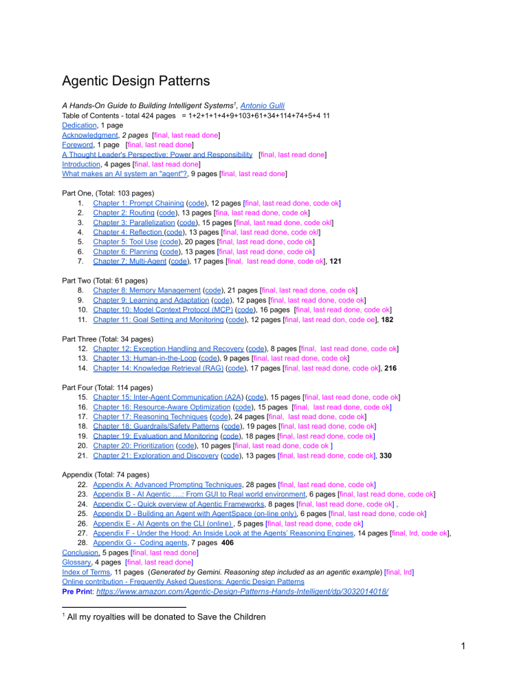 Agentic Design Patterns A Hands-On Guide to Building Intelligent Systems1, Antonio Gulli Table of Contents - total 424 pages = 1+2+1+1+4+9+103+61+34+114+74+5+4 11 Dedication, 1 page Acknowledgment, 2 pages [final, last read done] Foreword, 1 page [final, last read done] A Thought Leader's Perspective: Power and Responsibility [final, last read done] Introduction, 4 pages [final, last read done] What makes an AI system an "agent"?, 9 pages [final, last read done] Part One, (Total: 103 pages) 1. Chapter 1: Prompt Chaining (code), 12 pages [final, last read done, code ok] 2. Chapter 2: Routing (code), 13 pages [fina, last read done, code ok] 3. Chapter 3: Parallelization (code), 15 pages [final, last read done, code okl] 4. Chapter 4: Reflection (code), 13 pages [final, last read done, code okl] 5. Chapter 5: Tool Use (code), 20 pages [final, last read done, code ok] 6. Chapter 6: Planning (code), 13 pages [final, last read done, code ok] 7. Chapter 7: Multi-Agent (code), 17 pages [final, last read done, code ok], 121 Part Two (Total: 61 pages) 8. Chapter 8: Memory Management (code), 21 pages [final, last read done, code ok] 9. Chapter 9: Learning and Adaptation (code), 12 pages [final, last read done, code ok] 10. Chapter 10: Model Context Protocol (MCP) (code), 16 pages [final, last read done, code ok] 11. Chapter 11: Goal Setting and Monitoring (code), 12 pages [final, last read don, code oe], 182 Part Three (Total: 34 pages) 12. Chapter 12: Exception Handling and Recovery (code), 8 pages [final, last read done, code ok] 13. Chapter 13: Human-in-the-Loop (code), 9 pages [final, last read done, code ok] 14. Chapter 14: Knowledge Retrieval (RAG) (code), 17 pages [final, last read done, code ok], 216 Part Four (Total: 114 pages) 15. Chapter 15: Inter-Agent Communication (A2A) (code), 15 pages [final, last read done, code ok] 16. Chapter 16: Resource-Aware Optimization (code), 15 pages [final, last read done, code ok] 17. Chapter 17: Reasoning Techniques (code), 24 pages [final, last read done, code ok] 18. Chapter 18: Guardrails/Safety Patterns (code), 19 pages [final, last read done, code ok] 19. Chapter 19: Evaluation and Monitoring (code), 18 pages [final, last read done, code ok] 20. Chapter 20: Prioritization (code), 10 pages [final, last read done, code ok ] 21. Chapter 21: Exploration and Discovery (code), 13 pages [final, last read done, code ok], 330 Appendix (Total: 74 pages) 22. Appendix A: Advanced Prompting Techniques, 28 pages [final, last read done, code ok] 23. Appendix B - AI Agentic ….: From GUI to Real world environment, 6 pages [final, last read done, code ok] 24. Appendix C - Quick overview of Agentic Frameworks, 8 pages [final, last read done, code ok] , 25. Appendix D - Building an Agent with AgentSpace (on-line only), 6 pages [final, last read done, code ok] 26. Appendix E - AI Agents on the CLI (online) , 5 pages [final, last read done, code ok] 27. Appendix F - Under the Hood: An Inside Look at the Agents’ Reasoning Engines, 14 pages [final, lrd, code ok], 28. Appendix G - Coding agents, 7 pages 406 Conclusion, 5 pages [final, last read done] Glossary, 4 pages [final, last read done] Index of Terms, 11 pages (Generated by Gemini. Reasoning step included as an agentic example) [final, lrd] Online contribution - Frequently Asked Questions: Agentic Design Patterns Pre Print: https://www.amazon.com/Agentic-Design-Patterns-Hands-Intelligent/dp/3032014018/ 1 All my royalties will be donated to Save the Children 1 2