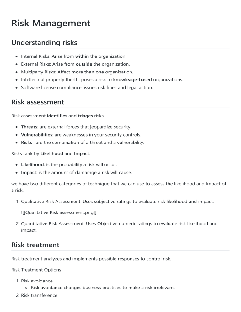 Risk Management Understanding risks Internal Risks: Arise from within the organization. External Risks: Arise from outside the organization. Multiparty Risks: Affect more than one organization. Intellectual property therft : poses a risk to knowleage-based organizations. Software license compliance: issues risk fines and legal action. Risk assessment Risk assessment identifies and triages risks. Threats: are external forces that jeopardize security. Vulnerabilities: are weaknesses in your security controls. Risks : are the combination of a threat and a vulnerability. Risks rank by Likelihood and Impact. Likelihood: is the probability a risk will occur. Impact: is the amount of damamge a risk will cause. we have two different categories of technique that we can use to assess the likelihood and Impact of a risk. 1. Qualitative Risk Assessment: Uses subjective ratings to evaluate risk likelihood and impact. ![[Qualitative Risk assessment.png]] 2. Quantitative Risk Assessment: Uses Objective numeric ratings to evaluate risk likelihood and impact. Risk treatment Risk treatment analyzes and implements possible responses to control risk. Risk Treatment Options 1. Risk avoidance Risk avoidance changes business practices to make a risk irrelevant. 2. Risk transference Risk treatment analyzes and implements possible responses to control risk. 3. Risk mitigation Risk mitigation reduces the likelihood or impact of a risk. 4. Risk acceptance Risk acceptance is the choice to continue operations in the face of a risk. Selecting security controls Security controls reduce the likelihood or impact of a risk and help identify issues. Two different ways of security controls 1. Control Purpose i. Preventive Preventive controls stop a security issue from occcurring. ii. Detective Detective controls identify security issues requiring investigation. iii. Corrective Recovery controls remediate security issues that have occurred. 2. Control Mechanism i. Technical use technology to achieve control objectives. ii. Administrative use processes to achieve control objectives. iii. Physical Impact the physical world. Configuration managment Tracks specific device settings Baselines: Provide a configuration snapshot. Versioning: Assigns numbers to each varsion. Diagrams serve as important configuration artifacts. Standardize Device Configurations Naming conventions IP adderessing schemes Change and management help ensure a stable operating environment.