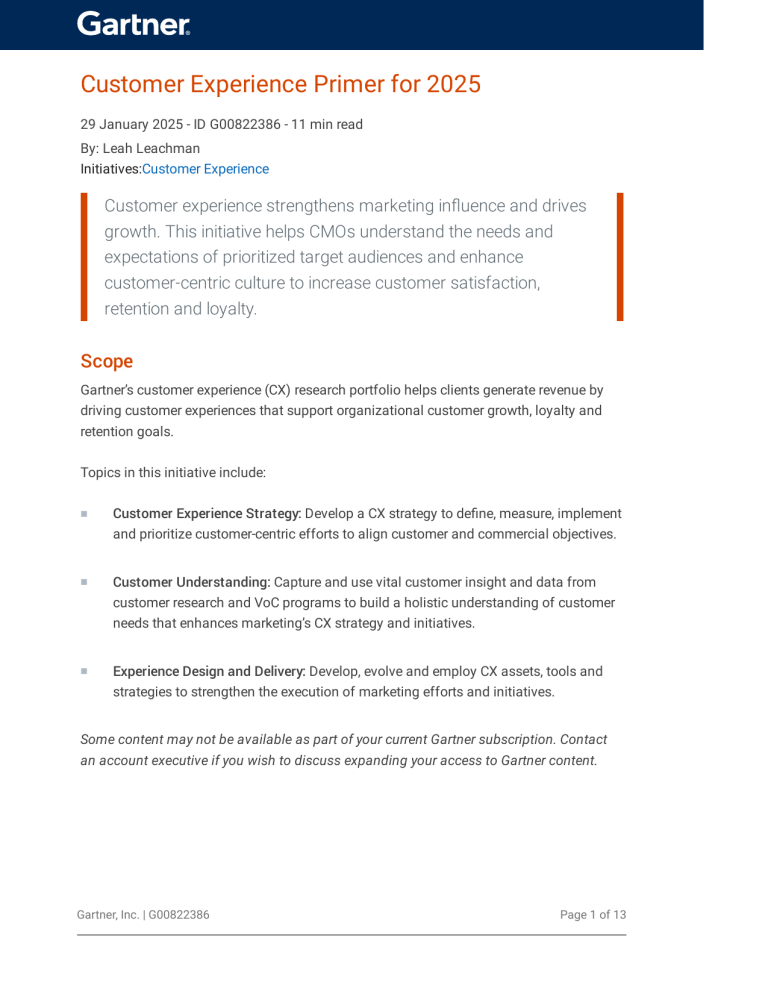 Customer Experience Primer for 2025 29 January 2025 - ID G00822386 - 11 min read By: Leah Leachman Initiatives:Customer Experience Customer experience strengthens marketing influence and drives growth. This initiative helps CMOs understand the needs and expectations of prioritized target audiences and enhance customer-centric culture to increase customer satisfaction, retention and loyalty. Scope Gartner’s customer experience (CX) research portfolio helps clients generate revenue by driving customer experiences that support organizational customer growth, loyalty and retention goals. Topics in this initiative include: ■ Customer Experience Strategy: Develop a CX strategy to define, measure, implement and prioritize customer-centric efforts to align customer and commercial objectives. ■ Customer Understanding: Capture and use vital customer insight and data from customer research and VoC programs to build a holistic understanding of customer needs that enhances marketing’s CX strategy and initiatives. ■ Experience Design and Delivery: Develop, evolve and employ CX assets, tools and strategies to strengthen the execution of marketing efforts and initiatives. Some content may not be available as part of your current Gartner subscription. Contact an account executive if you wish to discuss expanding your access to Gartner content. Gartner, Inc. | G00822386 Page 1 of 13 Analysis Figure 1: Customer Experience Overview Most CEOs and CFOs expect that growth should come from better customer experiences, yet CMOs overindex their marketing channel budgets on acquisition (almost 79%) rather than loyalty and advocacy (20.6%). 1,2 This strategy isn’t working. The 2024 Gartner Channel and Campaign Management Survey found that the majority of CMOs (87%) faced campaign performance issues in the last 12 months. 3 And customers aren’t impressed either — over half of U.S. consumers do not believe that brands understand their needs and preferences. 4 Gartner, Inc. | G00822386 Page 2 of 13 In order for brands to compete on customer experience, marketing needs a new approach to growth. The best growth signals come from organizations’ own customers, yet marketing leaders are failing to listen to those signals.This critical capability represents a major “say-do” gap for organizations. Of the over 700 organizations completing Gartner’s Marketing Score for Customer Experience, the biggest difference between an organization’s maturity and the importance of that activity exists in three areas: 5 ■ How organizations capture, use and communicate voice of the customer (VoC) insights ■ The way that organizations measure and analyze performance with customers ■ The ability to prioritize investments to develop a strong CX strategy CMOs should see these three areas as opportunities — a clear path for steering their brand toward commercial and customer success. In fact, CMOs from companies that exceed profitability goals invest more in customer loyalty and advocacy than those from companies that do not meet these goals. 2 This initiative includes the resources to help organizations achieve their objectives now and in the future. Topics CMOs must exploit the drivers that improve customer retention and lifetime value by solving problems that increase dissatisfaction and attrition. Sound plans rely on an outside-in view of customer objectives and expectations, informed by multiple research methods that create insight into customers’ criteria for success. These insights shape tools such as personas and journey maps that enable customer-centric decisions and well-orchestrated experiences. But, more broadly, they help CMOs build CX execution plans that justify investment, drive cross-functional collaboration and support the integration among brand, CX and organizational culture. Our research in this area addresses the following topics: Customer Experience Strategy Successful CX strategies clearly define how delivering against customer needs will support and accelerate commercial objectives. Mapping the ideal customer journey and translating that into action that supports the execution of a consistent customer experience. The successful execution of a CX strategy cannot be the responsibility of a single department. It requires active participation from cross-functional leadership toward a long-term goal of continuously improving CX. Gartner, Inc. | G00822386 Page 3 of 13 Questions Your Peers Are Asking ■ How do we build an effective CX strategy that will generate stakeholder support, drive brand preference and improve customer loyalty and retention? ■ How do we identify the customer groups/audiences that we should target and with channels and technology? ■ What are the steps that we need to take to launch or mature our CX program at my organization? ■ How do we measure the value of CX initiatives to the business? ■ What type of selection criteria should our organization use to prioritize CX projects or initiatives? Recommended Content Some recommended content may not be available as part of your current Gartner subscription. ■ Drive Growth by Aligning Brand, Customer Experience and User Experience ■ The 2-Prong Strategy of Strategic and Tactical Customer Experience Success ■ How to Measure Customer Experiences That Drive Growth and Loyalty ■ Case Study: Using Customer Data Analytics to Prove the Business Value of CX and Drive Action ■ 5 Action Items for CMOs to Lead Organizations From Product to Customer Centricity Planned Research ■ How to effectively connect CX with business outcomes ■ How to prioritize CX initiatives for business value ■ How to build and communicate CX metrics across different roles ■ How to empower customer-centric decisions Gartner, Inc. | G00822386 Page 4 of 13 Customer Understanding Understanding customers’ current and shifting needs requires a commitment to ongoing listening and research that balances what customers say with how they behave.