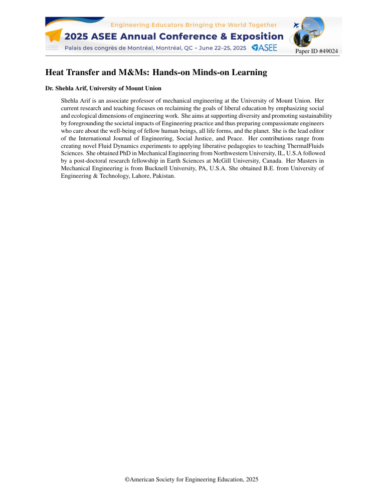 Paper ID #49024 Heat Transfer and M&Ms: Hands-on Minds-on Learning Dr. Shehla Arif, University of Mount Union Shehla Arif is an associate professor of mechanical engineering at the University of Mount Union. Her current research and teaching focuses on reclaiming the goals of liberal education by emphasizing social and ecological dimensions of engineering work. She aims at supporting diversity and promoting sustainability by foregrounding the societal impacts of Engineering practice and thus preparing compassionate engineers who care about the well-being of fellow human beings, all life forms, and the planet. She is the lead editor of the International Journal of Engineering, Social Justice, and Peace. Her contributions range from creating novel Fluid Dynamics experiments to applying liberative pedagogies to teaching ThermalFluids Sciences. She obtained PhD in Mechanical Engineering from Northwestern University, IL, U.S.A followed by a post-doctoral research fellowship in Earth Sciences at McGill University, Canada. Her Masters in Mechanical Engineering is from Bucknell University, PA, U.S.A. She obtained B.E. from University of Engineering & Technology, Lahore, Pakistan. ©American Society for Engineering Education, 2025 Heat Transfer and M&Ms: Hands-on Minds-on Learning Drawing on hands-on minds-on learning theory, this activity is designed to help students better understand and retain somewhat abstract concepts. Heat Transfer through the mechanisms of conduction, convection, and radiation are fundamental concepts but their micro-structural aspects are obscure to students as evidenced by class discussions after assigned readings on the subject. In this activity, fourth-year mechanical engineering students are asked to create physical representations using multi-colored M&Ms (colorful round chocolate candies) of atomic and molecular-scale phenomena pertaining to conduction, convection, and radiation in solid, liquid, and gas phases of matter. Students are assigned the reading a few days in advance and asked to come to the laboratory session having thought about their physical representations. During the 100-minutes-long laboratory session, students work in teams. Each team is assigned either a solid, liquid, or gas phase. They are provided with M&Ms and cookie sheets (baking trays). They discuss, plan, and enact their representations in the first half of the session. Then, the whole class walks to each station. The students at the station give a brief informal presentation on their representation and answer questions. During this informal question & answer session, faculty organizes key features of the three modes of heat transfer on the board. Students actively contribute to the information jot on the board. Post-activity, they are provided one week to reflect on the process. In this paper, I shall present their reflections along with the activity prompts and student representations. Students have indicated superior learning outcomes due to (i) having to think about and enact physical representations; (ii) debrief information jot on the board after the activity during the question-and-answer session. In the subsequent lectures during the semester, this activity is often referred to while discussing various specific topics of Heat Transfer. Having performed this activity in the first week of classes, students present deeper modes of understanding and interest in the subject during the semester as evidenced by enhanced class participation and performance in the exams. Introduction: The study of heat is a difficult subject. One of the known challenges in learning Thermodynamics and Heat Transfer is the abstract nature of concepts [1]. Quantities such as amount of heat, rate of heat transfer, temperature can be measured but not seen. No wonder, people explained heat transfer as the movement of a physical substance called “caloric” until the 19th century [2]. Understanding heat transfer requires cultivation of abstract thinking abilities: e.g., conduction occurs as a result of lattice vibrations and movement of free electrons; convection occurs due to molecular collisions and diffusion alongside the movement of the medium as a continuum; radiation results from intra-atomic energy transitions. Engineering students have an earlier exposure to classical mechanics, which is concrete and deterministic. They often struggle with abstract and stochastic concepts in Thermodynamics and Heat Transfer [1]. Additionally, modern life riddled with many distractions is not conducive to abstract thinking [3]. Finally, when students are passive receivers of knowledge in a lecture setting, they often disengage with the material and do not retain information [4], [5]. Hands-on Minds-on Learning theory derives from the earlier work of Jean Piaget [6] and involves moving back and forth between concrete objects and abstract ideas [7]. Building of tools through our earliest history has indeed contributed to the development of mind circuitry [8]. Engaging mind and hands together to produce a tactile output (such as knitting a sweater) has been shown to support brain health in managing neurological disorders such as depression, Parkinsons, and dementia [9]. Furthermore, the connection between art and abstract thinking has also been studied [10]. Thus, the inspiration for this activity draws from three sources: (i) The role of neuro-muscular engagement in sharpening the mind. (ii) The role of Art in supporting and expressing abstract thinking. (iii) The role of liberative pedagogies in facilitating whole-person engagement with the learning process. Context and motivation: Heat Transfer is a required course in the Mechanical Engineering curriculum. In our institution, it is taught as a culminating course in a sequence of Thermo-Fluids courses spanning 2nd year (Thermo-Fluids I), 3rd year (Thermo-Fluids II), and 4th year (Heat Transfer). Thus, students bring the knowledge of the fundamentals of Thermodynamics and F