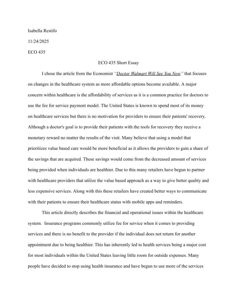 Isabella Restifo 11/24/2025 ECO 435 ECO 435 Short Essay I chose the article from the Economist “Doctor Walmart Will See You Now” that focuses on changes in the healthcare system as more affordable options become available. A major concern within healthcare is the affordability of services as it is a common practice for doctors to use the fee for service payment model. The United States is known to spend most of its money on healthcare services but there is no motivation for providers to ensure their patients' recovery. Although a doctor's goal is to provide their patients with the tools for recovery they receive a monetary reward no matter the results of the visit. Many believe that using a model that prioritizes value based care would be more beneficial as it allows the providers to gain a share of the savings that are acquired. These savings would come from the decreased amount of services being provided when individuals are healthier. Due to this many retailers have begun to partner with healthcare providers that utilize the value based approach as a way to give better quality and less expensive services. Along with this these retailers have created better ways to communicate with their patients to ensure their healthcare status with mobile apps and reminders. This article directly describes the financial and operational issues within the healthcare system. Insurance programs commonly utilize fee for service when it comes to providing services and there is no benefit to the provider if the individual does not return for another appointment due to being healthier. This has inherently led to health services being a major cost for most individuals within the United States leaving little room for outside expenses. Many people have decided to stop using health insurance and have begun to use more of the services being provided within retail stores. This is due to convenience and affordability as the primary care services they offer are expanding. Value based services have proven to save consumers money and reward providers with the extra savings from previously used services. Although this does prove beneficial to the individual and retail companies it can be extremely damaging for those who are still utilizing healthcare insurance as those in poor health will most likely be paid more for the services as healthier individuals no longer feel the need to have the insurance. I would suggest that the healthcare system as a whole should switch over to the Value Based Model as it would provide more benefits to the consumers and the providers within the system. Taking the time to focus more on providing beneficial services and checking in with patients over time can save the patient and the company money. Many other countries like South Korea are shown to spend significantly less than we do on healthcare services and our costs are projected to increase in the future. Most of this spending comes from the federal programs Medicare and Medicaid. I think investing in mobile apps that track an individual’s health day to day and remind them of upcoming appointments can promote healthier lifestyles. In general the value based model will lower costs and create a more patient centered experience.