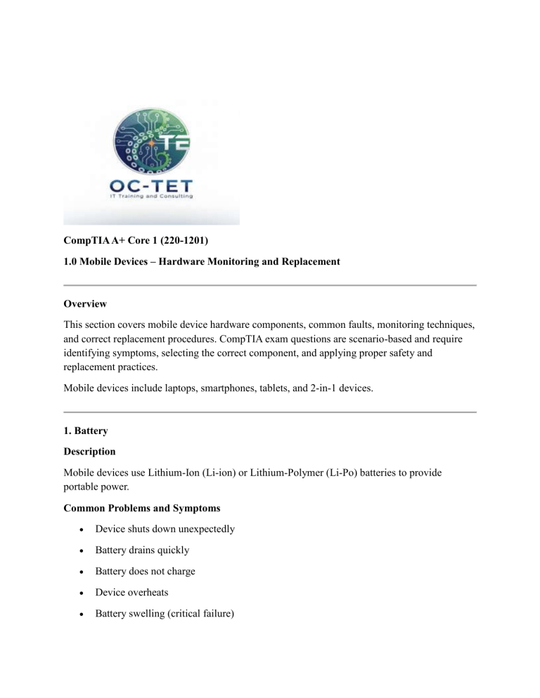 CompTIA A+ Core 1 (220-1201) 1.0 Mobile Devices – Hardware Monitoring and Replacement Overview This section covers mobile device hardware components, common faults, monitoring techniques, and correct replacement procedures. CompTIA exam questions are scenario-based and require identifying symptoms, selecting the correct component, and applying proper safety and replacement practices. Mobile devices include laptops, smartphones, tablets, and 2-in-1 devices. 1. Battery Description Mobile devices use Lithium-Ion (Li-ion) or Lithium-Polymer (Li-Po) batteries to provide portable power. Common Problems and Symptoms Device shuts down unexpectedly Battery drains quickly Battery does not charge Device overheats Battery swelling (critical failure) Monitoring and Diagnostics BIOS or UEFI battery health (laptops) Operating system power settings Manufacturer diagnostic tools Physical inspection for swelling or heat Replacement Techniques Removable batteries can be replaced externally after powering off the device. non-removable batteries require opening the device, disconnecting the battery first, and installing a compatible replacement. Example A laptop works when plugged in but shuts down immediately when unplugged. This indicates a failing battery. 2. Keyboard and Keys (Laptop) Description Laptop keyboards are integrated input devices connected to the motherboard using ribbon (ZIF) cables. Common Problems and Symptoms Keys do not respond Sticky or repeating keys Entire keyboard not working Random characters appear when typing Monitoring and Troubleshooting Test with an external USB keyboard Test keyboard functionality in BIOS Inspect ribbon cable connections Replacement Techniques Replacing a laptop keyboard usually involves removing the palm rest or top cover and carefully disconnecting the ribbon cable. Example If a keyboard does not work in BIOS, the issue is hardware-related. 3. Random-Access Memory (RAM) Description RAM temporarily stores data used by the operating system and applications. Mobile RAM Types SO-DIMM (laptops) LPDDR (phones and tablets, soldered) Common Problems and Symptoms Random restarts Blue screen errors Application crashes Device fails to boot Monitoring and Diagnostics BIOS memory detection Built-in diagnostic tools Memory testing software Replacement Techniques Laptop RAM can be replaced by opening the memory compartment and installing compatible modules. RAM in phones and tablets is not replaceable. Example A laptop powers on but displays a black screen. Improperly seated RAM is a likely cause. 4. Hard Disk Drive (HDD) and Solid-State Drive (SSD) Description Storage devices store the operating system, applications, and user data. Mobile Storage Types 2.5-inch HDD 2.5-inch SATA SSD M.2 SATA or NVMe SSD eMMC or UFS (phones and tablets) Common Problems and Symptoms Slow system performance Freezing or crashing Boot errors Clicking noises (HDD) Monitoring and Diagnostics BIOS detection SMART monitoring Manufacturer diagnostic tools Replacement Techniques Laptop storage devices can be replaced and data cloned or the operating system reinstalled. Phone and tablet storage is usually soldered and not replaceable. Example A laptop is very slow and makes clicking noises. This indicates a failing hard drive. 5. Wireless Cards (Wi-Fi and Bluetooth) Description Wireless cards enable Wi-Fi and Bluetooth connectivity. Wireless Card Types Mini-PCIe (older laptops) M.2 (modern laptops) Common Problems and Symptoms No Wi-Fi networks detected Bluetooth missing Weak wireless signal Monitoring and Diagnostics BIOS detection Device Manager Driver verification Antenna cable inspection Replacement Techniques Replacing a wireless card involves removing the card and reconnecting antenna cables correctly. Example A laptop detects Wi-Fi but has very weak signal strength. This often indicates loose antenna cables. 6. Physical Privacy and Security Components Biometrics Description Biometric devices include fingerprint readers, facial recognition cameras, and iris scanners used for authentication. Common Issues Authentication failure Sensor not detected Dirty or damaged sensor Replacement Biometric components may be modular in laptops but are usually integrated in mobile phones. Near-Field Communication (NFC) Description NFC enables short-range contactless communication for payments, access control, and device pairing. Key Characteristics Very short operating range Low power usage Replacement NFC components are often integrated into the motherboard or antenna assembly. 7. Wi-Fi Antenna Connector and Placement Description Wi-Fi antennas improve signal strength and reliability. Common Problems Weak signal Frequent disconnections Important Notes Incorrect antenna routing or loose connectors can cause poor wireless performance even when the wireless card is functional. Example A laptop only connects to Wi-Fi when close to the router. This suggests an antenna issue. 8. Camera and Webcam Description Cameras and webcams are used for video calls and authentication. Common Problems and Symptoms Black screen Poor image quality Camera not detected Monitoring and Diagnostics Operating system camera tests BIOS diagnostics Driver verification Replacement Techniques Webcams are typically located in the display bezel and connected via ribbon cables. 9. Microphone Description Microphones capture audio input and may be single microphones or microphone arrays. Common Problems and Symptoms No audio input Distorted or low-quality sound Replacement Techniques Microphones are often integrated with webcams or charging port assemblies rather than being standalone components. Example Audio works with a headset but not with the internal microphone, indicating an internal microphone fault
