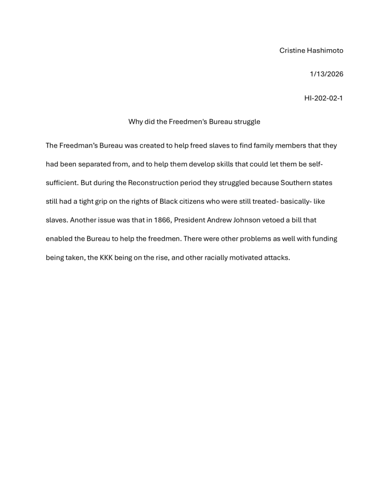 Cristine Hashimoto 1/13/2026 HI-202-02-1 Why did the Freedmen's Bureau struggle The Freedman’s Bureau was created to help freed slaves to find family members that they had been separated from, and to help them develop skills that could let them be selfsufficient. But during the Reconstruction period they struggled because Southern states still had a tight grip on the rights of Black citizens who were still treated- basically- like slaves. Another issue was that in 1866, President Andrew Johnson vetoed a bill that enabled the Bureau to help the freedmen. There were other problems as well with funding being taken, the KKK being on the rise, and other racially motivated attacks.
