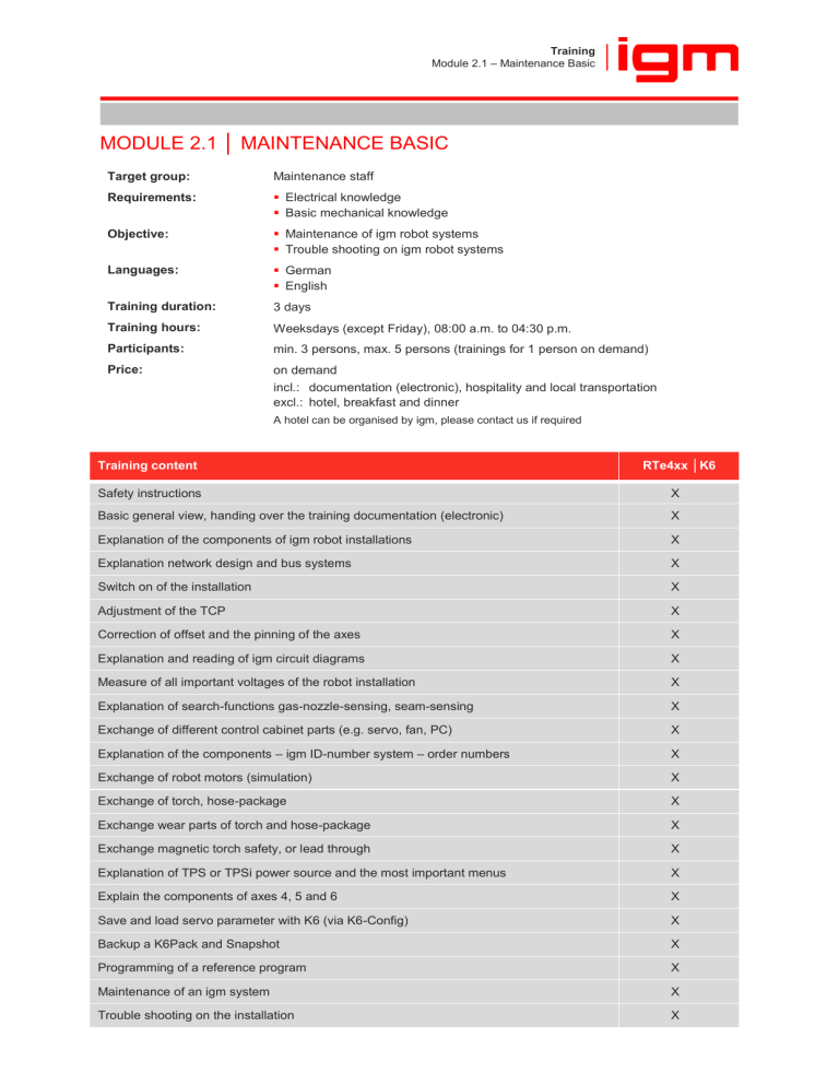 Training Module 2.1 – Maintenance Basic MODULE 2.1 │ MAINTENANCE BASIC Target group: Maintenance staff Requirements: Electrical knowledge Basic mechanical knowledge Objective: Maintenance of igm robot systems Trouble shooting on igm robot systems Languages: German English Training duration: 3 days Training hours: Weeksdays (except Friday), 08:00 a.m. to 04:30 p.m. Participants: min. 3 persons, max. 5 persons (trainings for 1 person on demand) Price: on demand incl.: documentation (electronic), hospitality and local transportation excl.: hotel, breakfast and dinner A hotel can be organised by igm, please contact us if required Training content RTe4xx │K6 Safety instructions X Basic general view, handing over the training documentation (electronic) X Explanation of the components of igm robot installations X Explanation network design and bus systems X Switch on of the installation X Adjustment of the TCP X Correction of offset and the pinning of the axes X Explanation and reading of igm circuit diagrams X Measure of all important voltages of the robot installation X Explanation of search-functions gas-nozzle-sensing, seam-sensing X Exchange of different control cabinet parts (e.g. servo, fan, PC) X Explanation of the components – igm ID-number system – order numbers X Exchange of robot motors (simulation) X Exchange of torch, hose-package X Exchange wear parts of torch and hose-package X Exchange magnetic torch safety, or lead through X Explanation of TPS or TPSi power source and the most important menus X Explain the components of axes 4, 5 and 6 X Save and load servo parameter with K6 (via K6-Config) X Backup a K6Pack and Snapshot X Programming of a reference program X Maintenance of an igm system X Trouble shooting on the installation X
