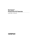 Synopsys® PrimeTime PX Tutorials Version 000-1, June 2013 Copyright Notice and Proprietary Information 2013 Synopsys, Inc. All rights reserved. This software and documentation contain confidential and proprietary information that is the property of Synopsys, Inc. The software and documentation are furnished under a license agreement and may be used or copied only in accordance with the terms of the license agreement. No part of the software and documentation may be reproduced, transmitted, or translated, in any form or by any means, electronic, mechanical, manual, optical, or otherwise, without prior written permission of Synopsys, Inc., or as expressly provided by the license agreement. Destination Control Statement All technical data contained in this publication is subject to the export control laws of the United States of America. Disclosure to nationals of other countries contrary to United States law is prohibited. It is the reader’s responsibility to determine the applicable regulations and to comply with them. Disclaimer SYNOPSYS, INC., AND ITS LICENSORS MAKE NO WARRANTY OF ANY KIND, EXPRESS OR IMPLIED, WITH REGARD TO THIS MATERIAL, INCLUDING, BUT NOT LIMITED TO, THE IMPLIED WARRANTIES OF MERCHANTABILITY AND FITNESS FOR A PARTICULAR PURPOSE. Trademarks Synopsys and certain Synopsys product names are trademarks of Synopsys, as set forth at http://www.synopsys.com/Company/Pages/Trademarks.aspx. All other product or company names may be trademarks of their respective owners. Third Party Links Any links to third-party websites included in this document are for your convenience only. Synopsys does not endorse and is not responsible for such websites and their practices, including privacy practices, availability, and content. Synopsys, Inc. 700 E. Middlefield Road Mountain View, CA 94043 www.synopsys.com ii Contents Introduction ...................................................................................................................... 4 Averaged Power Analysis Mode Tutorial ......................................................................... 4 Related Files .......................................................................................................................... 4 PrimeTime PX Script File ....................................................................................................... 5 Gate-Level Netlist ................................................................................................................................. 6 Technology Library ............................................................................................................................... 6 SDC File ............................................................................................................................................... 6 Parasitic File ......................................................................................................................................... 6 Switching Activity ................................................................................................................................. 6 Steps for Analyzing Power ..................................................................................................... 6 Changing Your Working Directory........................................................................................................ 7 Running PrimeTime PX ........................................................................................................................ 7 Viewing the Power Report .................................................................................................................... 7 Vector-Free Power Analysis Mode Tutorial ..................................................................... 8 Related Files .......................................................................................................................... 8 PrimeTime PX Script .............................................................................................................. 8 Steps for Analyzing Power ..................................................................................................... 9 Running PrimeTime PX ........................................................................................................................ 9 Viewing the Power Report .................................................................................................................... 9 Time-Based Power Analysis Mode Tutorial ................................................................... 10 Related Files ........................................................................................................................ 10 PrimeTime PX Script ............................................................................................................ 10 Steps for Analyzing Power ................................................................................................... 11 Running PrimeTime PX ...................................................................................................................... 11 Reviewing the Power Report and Waveforms ................................................................................... 12 Viewing Power Waveforms Using nWave Waveform Viewer ............................................................ 12 iii Introduction PrimeTime PX supports two modes of power analysis: the averaged and the time-based power analysis mode. The tool installation directory contains tutorials for both modes of power analysis. To use the tutorial, copy the tutorial file to your own directory and follow the instructions in this chapter. The design used in the tutorials consists of a multiplier, an adder, and logic to connect them. The design example, the activity data files, the scripts, and the steps you complete to run the examples are described in the following sections: Averaged Power Analysis Mode Tutorial Vector-Free Pow
