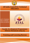 All India Council for Technical Education Faculty Development Programmes Scheme Document 2024-25 Training and Learning Bureau 1. FORWARD The field of higher education is currently undergoing a transformative phase in order to adapt to global trends. The National Education Policy (NEP) of 2020 serves as a guiding light for this transformative journey. The community of quality teachers holds great potential in driving these changes and plays a crucial role in the development, sharing, and dissemination of knowledge. In the present scenario, with disruptive technological advancements, the role of higher education teachers has become more important than ever before. NEP-2020 aims to empower these teachers by providing them with capacity building training and workshops, enabling them to identify, define, and implement the necessary changes. Without the active involvement of a competent body of quality higher education teachers, the vision of achieving the status of a global knowledge leader, known as Vishwa Guru, cannot be realized. In a world characterized by rapid change, complexity, and uncertainty, the skills of the past are no longer sufficient for today or tomorrow. Technological advancements have multiplied since the time of the Industrial Revolution, and social change along with demographic diversity has given rise to a multitude of innovative thinkers. Each new generation faces a world that is changing faster than ever before. In addition to digitalization, other significant megatrends such as globalization, sustainability, and automation are shaping our society. The COVID-19 pandemic has further accelerated change in all aspects of work and life. In light of these developments, the skills required for Education 4.0 go beyond mere digital proficiency. They encompass complex problem-solving, critical thinking, creativity, people management, teamwork and collaboration, emotional intelligence, judgment and decisionmaking, service orientation, negotiation, project management, cognitive flexibility, and motivation. It is through a faculty that possesses these diverse and energized skills that the foundation for Education 4.0 is built. 1 2. FACULTY DEVELOPMENT PROGRAMMES (FDPs) The objective of AICTE’s Training and Learning (ATAL) is to impart quality training through Faculty Development Programmes (FDPs) for Faculty Members, Postgraduate students, Research scholars and Industry Professionals so that the participants: 1. will acquire a sound domain knowledge and associated skills set to apply in real life with industry connect. 2. are equipped with Institutional Leadership skills for academic leadership. 3. are understanding their roles in community wellbeing, national building and also their own career development. 4. can effectively communicate knowledge and skill sets to the students in an efficient manner and their teaching-learning effectiveness is assessed. AICTE approved institutions can conduct ATAL Faculty Development Programmes in core and emerging areas of Engineering and Technology, Management, Design, Hotel Management and Catering Technology, Applied Arts & Crafts, Planning and Computer application. The FDPs will be purely in offline mode under the following categories: ➢ BASIC FDPS (six days/ one week) - 250 FDPs for UG/PG/ Research Institutions (50 FDPs for Pedagogy) - 100 FDPs for Polytechnics - 100 FDPs for newly approved BCA/BBA institutions ➢ ATAL Advanced FDPS (Twelve days/ two weeks) - 50 FDPs (for PG/ Research institutions complying with the following) 1. Proposed Coordinator should have successfully conducted at least one ATAL FDP in the previous years. 2. Institutions should have either: o o o o at-least 50% of their department NBA accredited & valid till 2025 April or listed in the top 100 by NIRF. or NAAC accreditation with CGPA more than 3.01 or graded autonomy awarded by AICTE or UGC. 2 2.1. ATAL BASIC FDPs 2.1(i) Target Group Assistant Professors/Associate Professor/Ph.D. Scholars/PG students Min/Max Limit- 30/50 participants from the Higher Education Institutions from the same city/ within 100 km of the host institute. (A maximum of 30% of participants can be from the host institution). Participants should be nominated by the respective Heads of Institutions. *For North-East region, Jammu, Kashmir, Ladakh and Andaman & Nicobar Islands, the Min / Max Limit is 20/50. 2.1(ii) What will be taught 1. Emerging/Core subject area domain knowledge/content 2. Applied knowledge/Lab practical related to the content. 3. Research Avenues/Industrial emerging trends. 4. Analysis & reflection of 2 quality research journal articles on the topic 5. Related Pedagogical approaches including technology integration. 6. Comprehensive assessment/evaluation designing (theory & practical) 7. One of the sessions should be on any of the four categories: a. National Education Policy (NEP) 2020 Implementation b. Indian values & ethos, Classroom conduct & behavior (teaching learning psychology) c. Life Skills such as time and stress management (more may be added) d. Research Methodology 2.1(iii) FDP Flow Mode: - In house (offline) for both theory and practical/labs/ experiential learning. At least 1 industrial visit to nearby Institute of National Importance/ IoE/prominent multidisciplinary university/CSIR or DST labs/Training Institute/Incubation centers/MSME centers/ Studios etc. 1. 2. 3. 4. 5. 6. 7. Explain the importance of the topic, suggest study, review of 2 research journal articles on the topic. Deliver Concepts of applications/emerging trends Share real-world applications of the topic Ask topical questions at the beginning of the session (rotate) Ask key takeaways at the end of session for understanding. Form small groups to discuss and report back to the class. Invite guest speakers from the industry/corporate/research labs to share their broader perspectives. 2.1(iv) Pedagogy Collaborative, Experiential, and Outcome Based Teaching and Learning based live Sessions, Case Stud