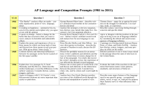 AP Language and Composition Prompts (1981 to 2011) YEAR Question 1 Question 2 Question 3 1981 “The Rattler”- analyze effect on reader – consider organization, point of view, language, detail. A reading on happiness – summarize his reasons for his opinion and explain why you agree or not with his opinion A quote on change - Select a change for the better that has occurred or that you want to occur; analyze its desirable and undesirable effects Explain the nature and importance of two or three means by which you keep track of time and discuss how these means reveal your person. (Hint given about “inner clocks.”) Contrast stylistic and rhetorical differences between two passages on the Soviet Launch of the first space satellite George Bernard Shaw letter – describe writer’s attitude toward mother & her cremation – diction and detail Analyze the strategies or devices (organization, diction, tone, detail) that make Gov. Stevenson’s Cat Veto argument effective. Excerpt from Thomas Carlyle’s Past and Present – define Carlyle’s attitude toward work and analyze how he uses language to convince…. Percy Bysshe Shelley and John Milton – two very short quotes on freedom – describe the concept of freedom in each; discuss the differences. Discuss the probable reasons for an anonymous writer’s additions and deletions and the ways in which those revisions change the effect of the paragraph. Two drafts that record the writer’s thoughts on how the experience of war affected his attitude toward language. Choose one or more pairs of words from a list and discuss and elaborate on the distinctions between the paired words. Consider how, when, why, and by whom each word might be used. Analyze how Zora Neale Hurston enriches our sense of her childhood world through her diction and manipulation of point of view. Thomas Szasz – argue for or against his position on the struggle for definition. Use readings, study, or experience. Describe a place, conveying feeling through concrete and specific detail. 1982 1983 1984 1985 1986 1987 Explain how two passages by N. Scott Momaday and Dee Brown, which describe similar landscapes, reveal the differences in the authors’ purposes. Consider diction, syntax, imagery, and tone. Agree or disagree with E. M. Forster’s view that personal relations are more important than causes or patriotism. Agree or disagree with the position in the passage on living in an era of language inflation by considering the ethical and social consequences of language inflation. A passage on a boxing match between Benny Paret, a Cuban, and Emile Griffith – Analyze how diction, syntax, imagery, and tome produce an effect on the reader. Defend a position or one or more issues raised in the passage about the state of television in the United States. Evaluate the truth of the assertion in the quotation that human nature wants patterns, standards, and structures of behavior. Describe some major features of the language used in one specific group – occupational, ethnic, social, or age, etc. Indicate the purpose these features serve or what influences they reflect. 1988 Evaluate Alexis De Tocqueville’s assertions about democracy and aristocracy and his assertion that democracy “throws [man] back forever upon himself alone.” Analyze Frederick Douglass’ language, especially the figures of speech and syntax, to convey his states of mind upon escaping slavery and arriving in New York in 1838. 1989 Argue for or against the validity of the implied criticism of a church bulletin [text given] reprinted without other comment in a magazine under the heading “The Religious Life.” From an autobiography of a professional woman pilot in Africa, analyze how the author’s juxtaposition of ideas, choice of details, and other aspects of style reveal her personality. Describe the rhetorical purpose of Martin Luther King’s Why We Can’t Wait. Analyze its stylistic, narrative, and persuasive devices. 1991 Analyze the language and rhetorical devices Igor Stravinsky uses to convey his point of view about orchestra conductors. 1992 Analyze Queen Elizabeth I’s diction, imagery, and sentence structure to achieve her purpose in her speech to her troops at Tilbury, 1588. Analyze how Richard Rodriquez’s presentation of the events in the passage suggests his attitude toward his family and himself. Consider narrative structure, detail, manipulation of language, and tone. Using your observation, experience, or reading, defend, challenge, or qualify Joseph Addison’s assertion that men use ridicule to “laugh men out of virtue and good sense.” 1993 Compare the rhetorical strategies – such as arguments, assumptions, attitudes, diction – used by characters from Jane Austen (1813) and Charles Dickens (1865). Comment on both intended and probable effects of the proposals on the women being addressed From an excerpt of Sir George Savile’s essay about King Charles II (1630 – 1685), define the attitude Savile would like us to adopt about Charles II and analyze the rhetorical strategies employed to promote that attitude. 1990 1994 Analyze stylistic and rhetorical differences between two nineteenth century descriptions of the Galapagos Islands Defend, challenge, or qualify H. L. Mencken’s views about the artist’s relation to society. Refer to particular writers, composers, or other artists. Defend, challenge, or qualify Barbara Tuchman’s claim that “wooden- headedness plays a remarkably large role … in human affairs.” Use evidence and/or your observations. (From The March of Folly) Pretend to contribute to a magazine or newspaper; write an article describing a place you know well that might be of interest to readers. Define the significance, use descriptive detail to make attitude clear. Missing Vividly and concretely describe one person seen at two different times or in two different situations so readers understand the difference in your attitude, thus proving