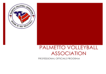 PALMETTO VOLLEYBALL ASSOCIATION PROFESSIONAL OFFICIALS PROGRAM PROGRAM OBJECTIVE One of the new charges of the Palmetto Region is educating, training, and evaluating officials for the sport of volleyball. Beginning this season, the Palmetto Region will provide Professional Officials at each Sanctioned event for Junior’s official training, supervision, ratings and refereeing duties of the highest playoff matches. The Palmetto Region will now be using USA Volleyball Official Training & Education as our official clinic/exam system. The clinics introduce the rules of the game to our members and provides them with the guidance and support to make their tournament experiences structured, fair, and hopefully, more enjoyable. If you have any questions about the Palmetto Region Junior Officials Program, please contact our Officials Chairperson, Amber Cornett at palmettovbofficialchair@gmail.com PROFESSIONAL ADVANCEMENT For those wishing to pursue certification, advancement and assignment to Palmetto Region events, the following activities are encouraged. Be a student of the game: know the rules and keep up to date with current interpretations. Be professional: look your best and behave according to the standards outlined in USAV training materials. Look for opportunities to practice your officiating. Officials improve through working matches. Since assigned matches are limited, look for volunteer opportunities with local club scrimmages and as a R2 or Scorer at local sanctioned events. These activities will increase your experience and exposure with peers and tournament/event management. Seek feedback and be open to receiving it. Work with other more experienced officials and ask for tips for improving your game. Be receptive when the feedback is given, even if you don’t agree. Take in the comments and reflect on them. Being able to use that information to improve is an important part of being a certified referee. Apply for additional formal evaluations at region events when the opportunity is available. Again, it is important to be receptive to all feedback from ratings and evaluations. Attend any and all training opportunities that are offered in the region and make use of the excellent online training from USA Volleyball. PROFESSIONAL OFFICIAL REQUIREMENTS Register as a member of the Palmetto Region each year, through the region website, www.palmettovb.com. All certified officials must be a member in good standing of the Palmetto Region, USA Volleyball. The Palmetto Region will reimburse the cost of your membership and background screen at the end of each season if you work at least 4 Palmetto Region Sanctioned events. You MUST work a minimum of 2 tournaments to be considered in good standing with the Palmetto Region. Pass the USAV mandatory background screen (good for 2 seasons); this screening must be current for all officials before they take the court at a Juniors event. Background screens done through other government or private organizations are NOT accepted. Send a brief resume of your volleyball officiating experience and a list of three volleyball references to palmettovbofficialchair@gmail.com. Review training materials at http://www.volleyballreftraining.com/training_materials_indoor.php These materials introduce the rules, interpretations, mechanics, best practices and professionalism that are all part of being successful as a USAV official. Complete mandatory attendance to the appropriate clinics (detailed specifically in the presentation): PAVO clinics ARE acceptable as Clinic Requirements PROFESSIONAL OFFICIAL REQUIREMENTS Complete exam as instructed below, all corrections must be submitted to palmettovbofficialchair@gmail.com by February 1st. Apprentice: Pass Form C test (on line) corrected to 100%. Provisional: Pass Form A test (on line) corrected to 100%. Regional: Pass Form A test (on line) with 80% corrected to 100%. Jr. National & National: Pass Form A test (on line) with 90% corrected to 100% . This exam is timed. Candidates must also complete requirements to become a certified scorer. Take Scoring Exam B by Feb. 1 st and correct to 100% (corrections submitted to palmettovbofficialchair@gmail.com). Practical on-court Rating: Pass 1 as R1 (first referee) and 1 as R2 (second referee) by member of the approved Rating Team. Oncourt practical evaluation will take place at a sanctioned tournament. In order to prepare, review all training materials. Also it is recommended that you volunteer your time to practice at a club practice or as a R1/R2 at a local tournament. For training and evaluation matches, prospective officials are not required to have the official uniform, but are required to wear clothing and have equipment similar to that of professional referees - navy blue slacks (no jeans), white polo shirt, white socks, white gym shoes, whistle, red & yellow cards and a flipping coin. Prospective officials are not required to purchase new uniform clothing until they have successfully completed the process. Ratings are good for 2 seasons. An official must complete clinic & exam annually to renew certification. PALMETTO VOLLEYBALL ASSOCIATION Preliminary Instructions for all Professional Official Certifications STEP BY STEP Preliminary Instructions Be in “Good Standing” (be a member of the Palmetto Region)and Have your USAV Membership Number Handy. Go to PVA Website at: http://www.palmettovb.c om/ and click on the “New Adult Coach/Ref Tab. STEP BY STEP Preliminary Instructions New Members will be directed to the New Member Registration Page. Renewing Members will be directed to the Webpoint Log In page STEP BY STEP Preliminary Instructions Use your Log In credentials to Log In to the “Members Area” Once you are in the Member’s Area click on “My Information” STEP BY STEP Preliminary Instructions After you select “My Information” you will easily be able to locate your “Member ID” under the “Main Info” Tab located at the top of the page. STEP BY ST