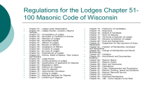 Regulations for the Lodges Chapter 51100 Masonic Code of Wisconsin Chapter 51 – Chapter 52 – Temples Chapter 53 – Chapter 54 – Chapter 55 – Chapter 56 – Chapter 57 – Chapter 58 – Chapter 59 – Chapter 60 – Chapter 61 – Chapter 62 – Chapter 63 – and Orphans Chapter 64 – Chapter 65 – Chapter 66 – Chapter 67 – Chapter 68 – Chapter 69 – Chapter 70 – Chapter 71 – Chapter 72 – Chapter 73 – Lodges under Dispensation Lodges Charter, Location, Masonic Consolidation of Lodges Surrender or Forfeiture of Charter Members of Lodges Worshipful Master Officers of Lodges Election of Officers Installation of Officers Trustees of Lodges By-Laws of Lodges Expenditures of Lodges Charity, Relief of Masons, Their widows Lodge Rooms Communications of Lodges Qualifications of Applicants for Degrees Repealed in 2000 Petitions for Degrees Fees for degrees Interviewing Committee Voting in Lodges Rejected Applicant for Degrees Conferring of Degrees Chapter 74 – Proficiency of Candidates Chapter 75 – Objections Chapter 76 – Default of Candidate Chapter 77 – Work by Request Chapter 78 – Territorial Jurisdiction of Lodges Chapter 79 – Personal Jurisdiction of Lodges Chapter 80 – Dues and Assessments Chapter 81 – Suspension for Non-payment of Dues, Restoration Chapter 82 – Transfer of Membership, Demission and Resignation Chapter 83 – Change of Membership and Pleural Membership Chapter 84 – Visitation Chapter 85 – Avouchment and Documentary Evidence Chapter 86 – Masonic Status Chapter 87 – Masonic Claims Chapter 88 – Work and Instruction Chapter 89 – Publications Chapter 90 – Clubs, Entertainment and Processions Chapter 91 – Masonic Clothing, Jewels and Emblems Chapter 92 – Masonic Memorial Service Chapter 93 – Insurance Chapter 94 – Perpetual Membership Chapter 95 – 100 – extra chapters to be Filled Chapter 51 – Lodges under Dispensation Chapter 52 – Lodges Charter, Location, Masonic Temples Chapter 51 – it has 16 subsections covering petitioning, voting, dispensation, members officers, petitioners and powers of new Lodges. Chapter 52 – Has 21 subsections covering the charter, seal, annual report, affiliated foundations, representation at GL and notice of GL proceedings, Lodge location, number which constitutes a Lodge, change of name, location or meeting place, selling or building a Lodge building, cornerstone laying, dedications and rededications, U.S. colors displayed and pledge and Lodge responsibility for conduct of members. Chapter 53 – Consolidation of Lodges Chapter 54 – Surrender or Forfeiture of Charter Chapter 53 – Proposals for consolidation from all Lodges involved, a vote by ballot, a date set by the Grand Master and notification by the Grand Secretary. All property of the Lodges become the property of the Consolidated Lodge. Chapter 54 – This covers the arrest of a charter by the GM and voting to surrender, the member transfers or resignations, the property, assets and personal property return to the Grand Lodge, any petitioners can request initiation or advancement with any other Lodge and the future restoration of the Lodge Charter. Chapter 55 – Members of Lodges Chapter 55 defines members, plural members and their responsibilities to the Lodge, the Lodge Secretary’s duties in reporting them to GL, honorary members, honorary Past Masters, life membership, membership certificates, 50 and 25 year certificates, past Master’s cards, member rights, changes in member names and destruction of Lodge records. Chapter 56 – Worshipful Master The Master: Must be a Lodge member Past Master or Warden unless by GM dispensation Elected by the members Need not be resident of Grand jurisdiction He cannot resign while Master Has long list of Powers including absolute power in the government of the Lodge, appoint committees, convene, open and close Lodge, admitting to Lodge of anyone, convene emergent communication for memorial service, delay ballot on petitions, declare business of Lodge and prohibit debate, complete unfinished work, confer or postpone conferral of degree, postpone stated communication, expound or decide on Masonic Law unless restricted by same law, set different date for stated when it falls on holiday, install officers as Master, delay elections if electioneering is suspected, exclude a member from memorial procession, order a vote by customary method, not entertain motion from floor, refuse petition, fill vacant appointed officers and refuse to hold stated and Wardens cannot usurp him and take his station. Is accountable to the GL for all his actions Has some restrictions including removing officers or trustees, waiving petitioner’s examination, levying assessments on members, refuse objection to initiating or advancing candidates, demanding reasons for objection of recommendation of a candidate’s petition, objection to the initiating or advancing of candidates subject to chapter 75 of code, or objection to the presence of a visiting brother, he can make no appeal to the lodge or override a GM appeal to the lodge. His specific duties include declaring petitions for degrees, declare a ballot box and destroy it and approve and co-sign all minutes for stated and special communications of the Lodge. Chapter 57 – Officers of Lodges Officers are WM, SW, JW, TR, SE as elected and Ch, Co, SD, JD, SS, JS, Ti, Solo, and Org as appointed by the Master. Tenure is until installation of successor Duties are prescribed by the ancient usages of Freemasonry JW is liaison to youth groups All officers must be members except tiler Wardens are not eligible for Master if vacancy must be filled by election Offices cannot be exchanged No officer can hold two offices except the treasurer and secretary If Master away or disabled SW becomes acting Master and if both WM and SW away or disabled the JW becomes acting WM until the former returns or is able to resume responsibilities An acting WM does not become a