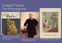 Chapter Twenty: The Progressives Teddy giving “Flim-Flam” Finance a thorough scrubbing in a 1902 cover of Puck magazine Official White House portrait of TR by John Singer Sargent (1903) 1909 illustrated postcard by E. Gustin Chapter Twenty: The Progressives The Progressive Impulse Desire for Order: Many Americans in the late 19th and early 20th century felt that rapid industrialization and urbanization had created too much chaos and social instability. Growth of Progressivism: Started with local movements that grew to national efforts; ultimately it was the presidency rather than Congress that became the chief vehicle of reform. Belief in Progress: Progressives wanted progress and growth, but not in the the uncontrolled, laissez-faire style of Gilded Age; direct and forceful human intervention was required for bettering society. “Antimonopoly”: While the progressive impulse was diverse, one strong thread was the desire to break up and limit large concentrations of wealth and power. Faith in Knowledge: Progressives thought they could solve tough social problems by applying knowledge and expertise. 2 Chapter Twenty: The Progressives The Progressive Impulse – The Muckrakers and the Social Gospel Crusading Journalists: Reporters looking to uncover social, economic, and political injustice who Teddy Roosevelt chastised for “raking up muck” were the first to embody the national reform spirit. Charles Francis Adams Jr. (1835-1915): This early “muckraker” and member of the prominent Massachusetts family exposed the ruthless practices of financiers Jay Gould and James Fisk as they tried to gain control over the Erie Railroad in 1868. Ida Tarbell (1857-1944): She wrote a series of exposés on the ruthless business practices of John D. Rockefeller and Standard Oil in McClure’s Magazine in 1903, which was published as a book a year later. Lincoln Steffens (1866-1936): Steffens wrote a series of exposés on corruption in city governments also in McClure’s, which he later published as The Shame of the Cities (1904). Tarbell and Steffens would later leave McClure’s to form The American Magazine (1906). 3 Chapter Twenty: The Progressives The Progressive Impulse – The Muckrakers and the Social Gospel The Social Gospel: This broad label applies to various efforts to drive social reform through religion (namely Protestant Christianity). Though founded in England in 1865, the Salvation Army was typical of this idea, offering spiritual and material aid to the poor in most American cities by 1900. Charles Sheldon’s In His Steps (1898), a novel about a Protestant minister who leaves a cushy job for a tough urban environment, sold 15 million copies. The Social Gospel was not the predominant strand in Progressivism, but it was influential. Lincoln Steffens 4 Salvation Army Band in Brooklyn in 1909 Ida Tarbell Chapter Twenty: The Progressives The Progressive Impulse – The Settlement House Movement Influence of Environment: Many progressive urban reformers believed that crowded immigrant slums harmed individual development. “Settlement Houses”: The idea of having middle-class “settlement workers” come in and work with the urban poor originated in England, with Toynbee Hall opened in 1884 in East London. Jane Addams and Hull-House: The social reformer Jane Addams (18601935) opened the first U.S. settlement house, Hull-House, with Ellen Gates Starr (1859-1940) in the slums of Chicago’s Near West Side neighborhood. The house began the model for 400 other similar institutions across the United States. The settlement houses gave birth to the modern profession of social work, and were viewed as respectable places for unmarried college women to go and work. Addams was the first American woman to receive the Nobel Peace Prize in 1931. 5 Chapter Twenty: The Progressives The Progressive Impulse – The Settlement House Movement Jane Addams A Hull-House worker greeting local residents at the front door of Hull-House. 6 Exterior of the Hull-House complex, which had thirteen buildings by 1911. Chapter Twenty: The Progressives The Progressive Impulse – The Allure of Expertise Expertise and University Training: In general, Progressives placed a high value on “scientific” solutions to social problems, applying academic research and training to them. Thorstein Veblen (1857-1929): This Norwegian-American economist and sociologist imagined a society governed by expert “social engineers”; followers would later call this rule by “technocrats.” – The Professions “New Middle Class”: Historians give this label this new group of highly trained professionals who emerged around the turn of the twentieth century: managers, technicians, accountants, specialized lawyers and businessmen, and scientists and engineers. Professional organizations began to develop that set standards for training. 7 Chapter Twenty: The Progressives The Progressive Impulse – The Professions 8 American Medical Association: Founded as a loose organization in 1847, the association incorporated in 1897 and reorganized in 1901 to uphold strict scientific standards for those allowed to practice medicine, fighting against “quackery” that had long plagued American medicine. States began passing medical licensing laws, and medical education improved, especially as rigorous medical schools like Johns Hopkins (1893) were created, making U.S. medical education quickly on par with that of Europe. Legal Profession: By 1916, lawyers had established bar associations in all 48 states and law schools expanded to meet the demands. Business: Businessmen began funding schools of business administration, like the Wharton School at U. Penn (1881, and creating professional organizations like National Association of Manufacturers (1895) and the U.S. Chamber of Commerce, which became powerful lobbying tools. Exclusion: Professional organizations often excluded women and people of color. Chapter Twenty: The Progressives The Prog