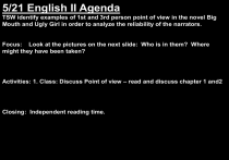 Activities: 1. Class: Discuss Point of view – read and discuss chapter 1 and2