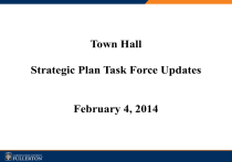 Town Hall Strategic Plan Task Force Updates February 4, 2014 Chancellor White’s 7 Key Areas in State of CSU Address 1. Tenure-track faculty hiring 2. Enhanced advising 3. Bottleneck initiative 4. Student preparation 5. High-impact practices 6. Expand data-driven decision making 7. Bolster transfer degree completion rates Challenged us to increase our First-time Full-time Freshman Graduation rate by 10% & Transfer Graduation rate by 5% throughout the CSU system. Strategic Plan Goal # 1 Develop and maintain a curricular and co-curricular environment that prepares students for participation in a global society and is responsive to workforce needs. CSUF aims to provide innovative, high-quality programs and services that offer students broad educational experiences, facilitate lifelong habits of intellectual inquiry, and prepare them for successful careers. We recognize that achieving these aims requires comprehensive and coordinated advising and actively engaging students in the learning process. A robust program of assessment will allow us to demonstrate student learning, document student achievement, and be accountable to ourselves and to our stakeholders. Objectives: • Implement a sustainable University-wide assessment process that includes curricular and co-curricular components. • Ensure that at least 75% of CSUF students participate in an advising system that integrates academic, career, and personal development components. • Increase by 25% the number of CSUF students participating in international, service learning, internship, community engagement or other innovative instructional experiences that prepare students for professional endeavors in a global society. Assessment Task Force Charge & Committee Members To support the development of an integrated university assessment plan that aligns with university strategic priorities and the new UPS on assessment and the development of a campus-wide educational effectiveness plan and recommended resources for implementation of the plan. Committee Members: Anil Puri Jochen Burgtorf Claire Cavallaro Sheryl Fontaine Kiran George Peter Nwosu Tania Perez Eileen Walsh Assessment Task Force Accomplishments & Efforts • Completed a preliminary inventory of current assessment activities at the university from available annual reports. The inventory will require verification by departments/colleges for accuracy and completeness. • Completed preliminary analysis of campus assessment activities, which reveal the following: • Campus has a history of assessment • Diffused and decentralized • No uniform assessment process • No on-going faculty development • Minimal institutional support, etc. • Recommendation for a dedicated space for the University Assessment Office and needed support structure. Assessment Task Force Next Steps - Spring 2014 • Develop a campus-wide educational effectiveness plan that includes a step-by-step process for developing and implementing program and course level assessments. • In light of this plan, identify an Assessment Management System for documenting and tracking program and institutional level assessment activities and provide data for analysis and reports that also support Program Performance Review (PPR) and accreditation. • Propose a faculty development program on assessment that includes informational and training workshops and conferences as well as direct support for program and course assessment needs. Assessment Task Force Questions: 1. Is it appropriate to incorporate assessment into the RTP process? If so, how do we recognize the value of faculty assessment activities in teaching, research, and service? 2. In the context of on-going work on assessment, what can we do to promote the culture of assessment on our campus? Advisement Task Force Charge & Committee Members Develop a plan for an integrated advising system - and suggest its structure, timeline and budget - to ensure that by 2018 at least 75% of the CSUF students receive advisement. Committee Members: Anil Puri José Cruz Susan Cooper Peter Nwosu Roger Sorochty Sean Walker Paul Levesque Lisa Kirtman Bridget Driscoll Amanda Carreno Advisement Task Force Accomplishments & Efforts • Pilot project to measure advising activity at the department level (Biology and President’s Scholars). • Advising Road Maps updated in light of Larry Abel’s visit. • Recruitment of 8 college-based advisors and a trainer. • Professional advising development activities for faculty and staff. Advisement Task Force Next Steps - Spring 2014 • Analysis of campus data on advising. • Analysis of national best practices and lessons for us (e.g. Georgia State). • Development of a structure for “integrated” advising. • Budget estimates. Advisement Task Force Questions: 1. WASC has called for “integrated” advising. How would you describe such a model for our campus? 2. What should be the role of faculty versus professional advisors? What kind of training do faculty members need for advising? 3. Please review the list of advising activities on our campus (provided) and indicate (a) what is missing? (b) where should each activity reside, e.g., Academic Affairs, Student Affairs etc.? Stewards of Place Task Force Charge & Committee Members Determine a baseline of participation in programs linking degree, career, and community. Committee Members: José Cruz Berenecea Johnson-Eanes Greg Saks Dawn Macy Steve Stambough Eliza Noh Vince Buck Jim Case Theresa Harvey Kathleen Costello Alyssa Jensen Stewards of Place Task Force Place—physical and temporal—is a precious resource that needs to be leveraged on behalf of the communities that define it. A strong sense of place enables universities to nurture civic engagement, support the generation and application of knowledge, fuel local economic development, and construct frictionless educational pathways for the students in their communities. Cal State Fullerton aims to be a strong steward of pla