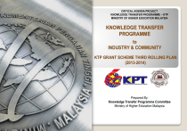 CRITICAL AGENDA PROJECT KNOWLEDGE TRANSFER PROGRAMME – KTP MINISTRY OF HIGHER EDUCATION MALAYSIA KNOWLEDGE TRANSFER PROGRAMME to INDUSTRY & COMMUNITY KTP GRANT SCHEME THIRD ROLLING PLAN (2013-2014) Prepared By: Knowledge Transfer Programme Committee Ministry of Higher Education Malaysia Knowledge Transfer Programme - KTP KTP Grant Scheme Third Rolling Plan (2013) CONTENT 1. Overview 2. Policy 3. Key Result Area (KRA) 4. Model of Implementation 5. Implementation Plan 6. Impact Measurement 7. Examples Impact of KTP 8. Roll-Out Plan (2013 – 2014) 9. KTP ADMINISTRATION @ IPTA Knowledge Transfer Programme - KTP KTP Grant Scheme Third Rolling Plan (2013) OVERVIEW • In a high income economy the demand for knowledge workers will increase. • Educational reforms will be a vital need for inclusive growth. • Human capital policies must be given top priority, as they will be crucial in making more rapid inroads towards reducing income inequality. • Labour market imperfections, including wage and employment discrimination, will have to be rectified. • Fragmented and segmented labour markets must be made more integrated. (NEM 92) • While innovative ideas and knowledge may be converted into lucrative commercial undertakings, there would also be many incidences of failure which need to be managed. Above all, intellectual property rights (IPR) and other rights should be protected. (NEM 99) Knowledge Transfer Programme - KTP KTP Grant Scheme Third Rolling Plan (2013) OVERVIEW (CONT’D) • • MoHE planned to formulate a new policy of KTP by establishing a New CAP for PSPTN The new CAP would outline the importance of KTP to be adopted by HEIs in particular the Public Universities. Requirements • How Malaysian HEIs can assist in delivering and transferring knowledge created in their institutions to the industry and or community. • Differentiation need to be made as not to overlap with other CAPs which can also contain elements of KT such as commercialisation, entrepreneurship and employability CAPs. • The knowledge to be transferred need to be based on certain fundamentals which need to be determined. Knowledge Transfer Programme - KTP KTP Grant Scheme Third Rolling Plan (2013) OVERVIEW (CONT’D) THE WORKSHOP • The initial meeting on KTP with the Minister of Higher Education was held on 11 November 2010 and the Minister has decided that the needs of the workshops on KTP to be held in order to outlined the goals, scopes, directions and the guidelines for the implementation programme of KTP. • 1st Workshop 29-30 November 2010 (Concorde Inn, KLIA) • 2nd Workshop 26-27 January 2011 (Marriott Hotel Putrajaya) Knowledge Transfer Programme - KTP KTP Grant Scheme Third Rolling Plan (2013) OVERVIEW (CONT’D) KTP LAUNCHING CEREMONY • The Knowledge Transfer Programme - KTP was officially launched by the Minister of Higher Education, Dato’ Seri Mohamed Khaled Nordin on 26 June 2012 at KLIA Pan Pacific Hotel. In the same ceremony, Mohamed Khaled also launched the book and logo of KTP, and presented a mock cheque to 15 IPTAs for the Second Rolling Plan Grant and Flagship Project – Industry Grant to 20 IPTAs involved. Knowledge Transfer Programme - KTP KTP Grant Scheme Third Rolling Plan (2013) POLICY • KTP Policy Outline • Background of KTP • Objective of KTP • Current status of KTP of IPTA in Malaysia • Issues and Challenges • Rationale of the Policy • SWOT Analysis • Strategic Thrusts of the Policy • Strategic Objective 1: Enhance and Enrich Current Knowledge Transfer in IPTA • Strategic Objective 2: KTP as Catalyst for Community or Industry Growth • Framework of the Policy • Roll-out, Milestone and Achievements Knowledge Transfer Programme - KTP KTP Grant Scheme Third Rolling Plan (2013) BACKGROUND OF KTP • KTP recognises a broad range of activities to support mutually beneficial collaborations between universities, industries and communities (government agencies / non-government organisations (NGOs) / public sector). • It provides the platform for the exchange of tangible and intangible intellectual property, expertise, learning and skills between academia, industry and the community. • The forms of interactions may include, consultancy, education, training, graduate development, conferences, sharing of physical facilities and student placements. POLICY Knowledge Transfer Programme - KTP KTP Grant Scheme Third Rolling Plan (2013) BACKGROUND OF KTP (CONT’D) • Public Higher Education Institutions (IPTAs) should effectively engage with industry and community towards mutually beneficial initiatives through role played by: • Academia: able to incorporate relevant and up to date knowledge from industry and the community into their teaching, learning and consultancy activities. • Industry : can utilize the resources of IPTAs to enhance their business capability and economic activities • Community: can benefit from the knowledge generated in IPTAs to improve quality of life within the community. • Graduate/Postgraduate Intern : enhance their personal and professional development POLICY Knowledge Transfer Programme - KTP KTP Grant Scheme Third Rolling Plan (2013) OBJECTIVE OF KTP • To recognize and promote the transfer of knowledge via the exchange of creative and innovative ideas, research findings, experiences and skills between IPTA, industries, government agencies and the wider community. POLICY Knowledge Transfer Programme - KTP KTP Grant Scheme Third Rolling Plan (2013) GOAL OF KTP • To enable the development and improvement of the quality of products, services and policies to be shared for mutual benefits between the stakeholders i.e. academia, industry, community and the graduate/postgraduate intern. POLICY Knowledge Transfer Programme - KTP KTP Grant Scheme Third Rolling Plan (2013) CURRENT STATUS OF KTP OF IPTA IN MALAYSIA • IPTA do implement KTP, however they are not comprehensive. • The practices and approach vary amongst the IP