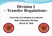 Division I – Transfer Regulations– University of Louisiana at Lafayette Rules Education Meeting March 24, 2010 Residence Requirement – General Principle – A student who transfers from any collegiate institution is required to complete one full academic year of residence at the certifying institution, unless the student satisfies the applicable transfer requirements or qualifies for an exception. In baseball and basketball, a transfer student-athlete who satisfies the applicable transfer requirements or qualifies for an exception, but initially enrolls as a fulltime student after the first term of the academic year shall not be eligible for competition until the ensuing academic year. 2 Permission to Contact An athletics staff member shall not make contact with the student-athlete of another NCAA or NAIA four-year collegiate institution, directly or indirectly, without first obtaining the written permission of the first institution's athletics director (or an athletics administrator designated by the athletics director). If you are interested in a SA at another 4 year institution, contact the compliance office and request permission to contact a SA. The compliance office will complete the “Permission to Contact/One-time Transfer Exception” form and send it to the appropriate institution. 3 Permission to Contact If permission is not granted, you (Head Coach): shall not encourage the transfer; and shall not provide athletically related financial assistance to the student-athlete until the studentathlete has attended UL for one academic year. If permission is granted to contact the student-athlete, all applicable NCAA recruiting rules apply. *Note: Other rerepresentatives of the institution's athletics interests are not allowed to be involved in any capacity in the recruitment of PSAs. Intra-Conference Transfers A SA transferring from one Sun Belt Conference institution to another Sun Belt Conference member is ineligible for participation and competition in that sport for two years from the date of transfer. An institution would have to get approval by the AD of the institution the SA was transferring from, and would need a statement from the SA verifying that he/she was not a recruited SA at the current school and why he/she wanted to go to the new SBC school. Exceptions to Intra-Conference Transfers The first institution is placed on probation in the student- athlete’s sport; or The first institution discontinues the student-athlete’s sport from varsity status. The student-athlete was not involved in any violations, which resulted in his/her previous institution being placed on probation. 4-2-4 Transfer A 4-2-4 transfer student who attended a Sun Belt institution prior to enrolling at a junior college may transfer without penalty to another Sun Belt Conference institution subsequent to graduating from the junior college and completing all NCAA requirements. University of New Orleans Any student-athletes who transfer from UNO will not have to serve the intra-conference penalty due to UNO moving to Division III status. However, you must receive “Permission to Contact” from UNO for any student-athletes you wish to speak with. Transfers and Credit-Hour Requirements 1. Is a transfer exception met? NO Student-athlete must serve an academic year in residence. NO Student-athlete must serve an academic year in residence. YES Student-athlete eligible to participate.* YES 2. Did the student-athlete complete six-credit hours during the last full-time term of enrollment or is the student-athlete transferring from a nondomestic institution? YES 3. Applicable credit-hour requirement for transfers met? NO Student-athlete is not eligible for the first term of enrollment at the certifying institution. Note: The student-athlete may regain eligibility after one term. *Must meet percentage-of-degree requirement, if applicable. 9 Six-Hour Rule All student-athletes (including incoming transfer student-athletes) are required to complete six hours of academic credit during the previous term of full-time enrollment. Exception: Transfer student-athletes from a foreign collegiate institution do not have to meet this requirement. NCAA Bylaws 14.4.3.1 and 14.4.3.1.2.1. 10 Credit-Hour Requirements for Transfer Students-Athletes Bylaw 14.4.3.1.2 One semester = six semester hours One academic year = 24-semester hours Three semesters = 30-semester hours Four semesters = applicable percentage-of-degree requirement. * Remember six-hour rule, except nondomestic student-athletes. 11 What about Percentage of Degree and GradePoint Average? Percentage of degree must be certified immediately on transfer if the student-athlete is entering his or her third year of collegiate enrollment or thereafter. Grade-point average (GPA) must be certified after the first term of full-time attendance at the certifying institution. Bylaws 14.4.3.2.2 and 14.4.3.3.1. 12 Correspondence Courses from Another Institution Credit hours earned through correspondence, extension and credit-by-examination courses from an institution other than the one in which the student-athlete was enrolled full time may not be used to fulfill the percentage-of-degree requirements at the certifying institution for continuing and transfer student-athletes. Bylaw 14.4.3.4.3 Note: Distance learning courses taken at the SA’s previous institution, while enrolled, may be used to meet all PTD requirements. Must meet applicable distance learning requirements (Bylaw 14.4.3.4.8) 4-4 Transfers 14 Exceptions for Transfers from 4Year Colleges Military Service (at least 12 months) Discontinued/Non-sponsored Sport Two-Year Nonparticipation or Minimal Participation Not engage in countable activities beyond a 14 consecutive day period, or neither practiced or competed in organized non-collegiate amateur competition while enrolled full time Return to Original Institution without Participation or with Minimal Participation (14 consecutive day period) Non-recruited Stude