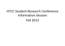 HTCC Student Research Conference Information Session Fall 2012 Honors Transfer Council of California (HTCC) Student Research Conference at UC Irvine Student Center Saturday, March 23, 2013 8:30-4:30 What: HTCC (Honors Transfer Council of California) Student Research Conference • Who: Community college Honors students and other high-performing students • Where: UC Irvine • When: Saturday, March 23, 2013 • Formats: – Oral Presentations (12-minute individual; 20-minute small group or 40minute large group) – Poster Presentations (individual or group) – Creative Performances • Deadlines: Dec. 3, 2012: 250-word proposal abstract due to Honors Program Director • Awards: Several Poster and abstract awards, $50-$1000; publication opportunity • Conference Website: http://www.honorstcc.org Benefits of Research • Improving communication, leadership skills, and problem-solving skills • Strengthening applications for potential scholarships • Boosting resumé • Gathering new knowledge • Clarifying career and academic goals/interests • Learning the methods of your field • Entering your field's professional dialogue • Developing lifelong professional and academic connections Conference Website • http://www.honorstcc.org/conference/index.htm l • Consult website for conference information and for tips on writing abstracts and creating effective presentations, poster guidelines, sample abstracts and posters, etc. • Dr. Ryals will submit all student applications to the conference. • Note: IVC has internal deadlines that differ from the deadlines listed on the conference website. Special Opportunities • HTCC Awards/Scholarships 1. Poster Awards: • Cash prizes: 1st, 2nd, 3rd in both Humanities/Social Sciences and Physical/Life Sciences categories. • 1st place: $500; 2nd place: $250; 3rd place: $100. • To apply: Awards are based on poster displays; no additional abstract needed once admitted to conference; all poster exhibits are automatically entered into the competition. 2. Competition Abstract Awards: • HTCC Outstanding Abstract Awards (up to 5 @ $500) • HTCC Director’s Award (1@ $1000) • To apply: Requires an additional 400-word abstract due to Dr. Ryals in February, as well as attendance at the conference. Only oral presentation participants are eligible for abstract awards. 3. UCI Research Grants: Through the Undergraduate Research Opportunities Program (UROP), UCI is offering up to four research grants to students who present papers at the conference and subsequently undertake research as students at UCI. Selection is based on the quality of the student abstracts, with up to a total of two grants for each of four major academic categories: humanities, mathematics, science, social sciences. • To apply: Presenters transferring to UCI next year are eligible for UCI Grant awards. Requires submission of a 400-word abstract to Dr. Ryals by February for either a poster or oral presentation and participation at the conference. Receipt of the UCI Grant is contingent upon actual transfer to UCI. If you plan to transfer to UCI and are interested in a UCI grant, please see Dr. Ryals. • Publication Opportunity All 250-word research proposals for poster or oral presentations accepted to the conference will automatically be considered for publication in the conference booklet, Building Bridges, which comes out following the conference. Students may have only one abstract published. HTCC Application Forms UCI Research Conference Honors Transfer Council of California Saturday, March 23rd, 2013 Submission Information and Deadlines To apply for the 2013 HTCC Student Research Conference, you must do the following: • • Attend an information session about the conference. Submit an electronic copy of the “HTCC Application Form” below to kryals@ivc.edu by Monday, December 3, 2012 at 5:00 p.m. • Submit a hard copy of the “Research Authentication Form” to the Honors Office (Room A209) by Monday, December 3, 2012 at 5:00 p.m. • A separate HTCC Application Form and Research Authentication Form must be submitted for each student proposal. • Forms available on Honors Program Website: http://ivc.edu/academics/honors/Pages/default.aspx • • • • • • • • • • • • • • • • • • • • • • • HTCC APPLICATION FORM Submit the following electronically by December 3, 2012 at 5:00 p.m. to kryals@ivc.edu. Applicant Information: Name: ______________________________________________ Cell Phone: ______________________________________________ Email: ______________________________________________ Major: ______________________________________________ Faculty Mentor Information: Name: ______________________________________________ IVC Phone: ______________________________________________ Email: ______________________________________________ • • • Presentation Type (check the appropriate category): • • • • • • ___Small Group Oral Presentation (2 presenters: 20 minutes for talk, 10 for discussion) ___Individual Oral Presentation (12 minutes for talk, 5 for discussion) Other presenter: Name__________________________________ Email________________________ ___Large Group Oral Presentation (3 or more presenters: 40 minutes for talk, 10 for discussion) • • • • • • • • • • • • • • Other presenters: Name__________________________________ Email________________________ Name__________________________________ Email________________________ Name__________________________________ Email________________________ Name__________________________________ Email________________________ ___Creative Performance (12 min. for presentation, 5 for discussion) ___Poster Display Research Disciplines (HTCC categories) Humanities ___Art History ___Languages / Literature ___Philosophy / Religion ___History ___Communications / Rhetoric ___Humanities / General ___Film Studies Sciences ___Mathematics ___Physics / Astronomy ___Ea