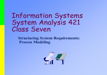 Information Systems System Analysis 421 Class Seven Structuring System Requirements: Process Modeling Learning Objectives Understand the logical modeling of processes through studying data flow diagrams How to draw data flow diagrams using rules and guidelines How to decompose data flow diagrams into lower-level diagrams Balancing of data flow diagrams 8.2 Learning Objectives Explain the differences among four types of DFDs: current physical, current logical, new physical and new logical Discuss the use of data flow diagrams as analysis tools Compare and contrast data flow diagrams with Oracle’s process modeling tool and with functional hierarchy diagrams Discuss process modeling for Internet applications 8.3 Data Modeling Entity Relationship Data Flow Diagram Prototypes System Modeling • One way to structure unstructured problems is to draw a model – A model is a representation of reality - picture worth a thousand words – Built to understand the existing system as a way to document business requirements – Data modeling is a technique for defining business requirements • Data is viewed as a resource to be shared by as many processes as possible, data must be organized in a way that is flexible and adaptable to unanticipated business requirements System Modeling • Physical model shows not only what a system does but how the system is physically and technically implemented depicts technical design • Logical models depict business requirements illustrates the essence of the system – Move biases that are the results of the way the current system is implemented – Reduce the risk of missing requirements – Allow us to communicate with end users – Help analysts and users understand business terminology and rules Process Modeling • The simplest process model of a system is based on inputs, outputs, and the system itself – Viewed a process. – The process symbol defines the boundary of the system. – The system is inside the boundary; the environment is outside that boundary. – The system exchanges inputs and outputs with its environment. – Process is work performed on, or in response to, incoming data flows or conditions. Process Modeling • Graphically represent the processes that capture, manipulate, store and distribute data between a system and its environment and among system components • Data flow diagrams (DFD) – Graphically illustrate movement of data between external entities and the processes and data stores within a system • Modeling a system’s process – Utilize information gathered during requirements determination – Structure of the data is also modeled in addition to the processes 8.8 Process Modeling • Deliverables and Outcomes – Set of coherent, interrelated data flow diagrams – Context data flow diagram (DFD) • Scope of system – DFDs of current system • Enables analysts to understand current system – DFDs of new logical system • Technology independent • Show data flows, structure and functional requirements of new system – Project dictionary and CASE repository 8.9 Data Flow Diagrams • Data modeling is done during the project definition stage and refined in physical design • Similar to ERD Data model - DFD also helps the analyst identify business vocabulary and uncover business requirements • Can be used on current system to understand requirements • Can be fit on several sheets of paper • The level of data flow diagram can be compared to a highway and street maps that you might use - National => State => City Data Flow Diagrams Tool that depicts the flow of data through a system and the work or processing performed by that system Graphical tool used to describe and analyze the movement of data through a system manual or automated Central tool in which other components are developed A data flow diagram (DFD) is a tool that depicts the flow of data through a system and the work or processing performed by that system. Synonyms include bubble chart, transformation graph, and process model DFD Symbols DFD Symbols • Named vector or arrow – Called a data flow new order – Portrays a data path • Bubble – Called a process – Portrays transformation of data • Narrow open rectangle Verify Credit 3.2 3.2 Verify Credit – Called a data store – Portrays a file or data base Customer Master File • Box – Called a source or sink – Portrays an internal or external agent – Used to define a system’s boundaries Customer DFD Symbols • Data flow - data move in a specific direction • Processes - people, procedures or device that transforms data - work to be done • Source or destination - external source or destination of data which may be people, program, organization or other entities - The squares represent external agents – the boundary of the system. • Data Store - where data is house Customer Good Sold File 2.0 Update Goods Sold DFD Symbols Customer External Entity 1 Orders Verify Credit Data Flow Credit History Customer File Data Store Accepted Orders 2 Ship Order Process DFD Symbols Data Flow • A data flow is data in motion. • The flow of data between a system and its environment, or between two processes inside a system an relationship between a system and its environment, or between two processes is communication. – A data flow represents an input of data to a process, or the output of data (or information) from a process. A data flow is also used to represent the creation, deletion, or update of data in a file or database (called a data store on the DFD). – A data flow is depicted as a solid-line with arrow. Data Flow Membership application Employee Bank statement Existing account 3.1.1 Generate an employee bank statement 3.1.2 Create a new member account Employee status Employee address Employees Member Accounts New account status 3.1.3 Freeze member account number Frozen account notification Accounts Receivable Department Data Flow • No data flow should ever go completel